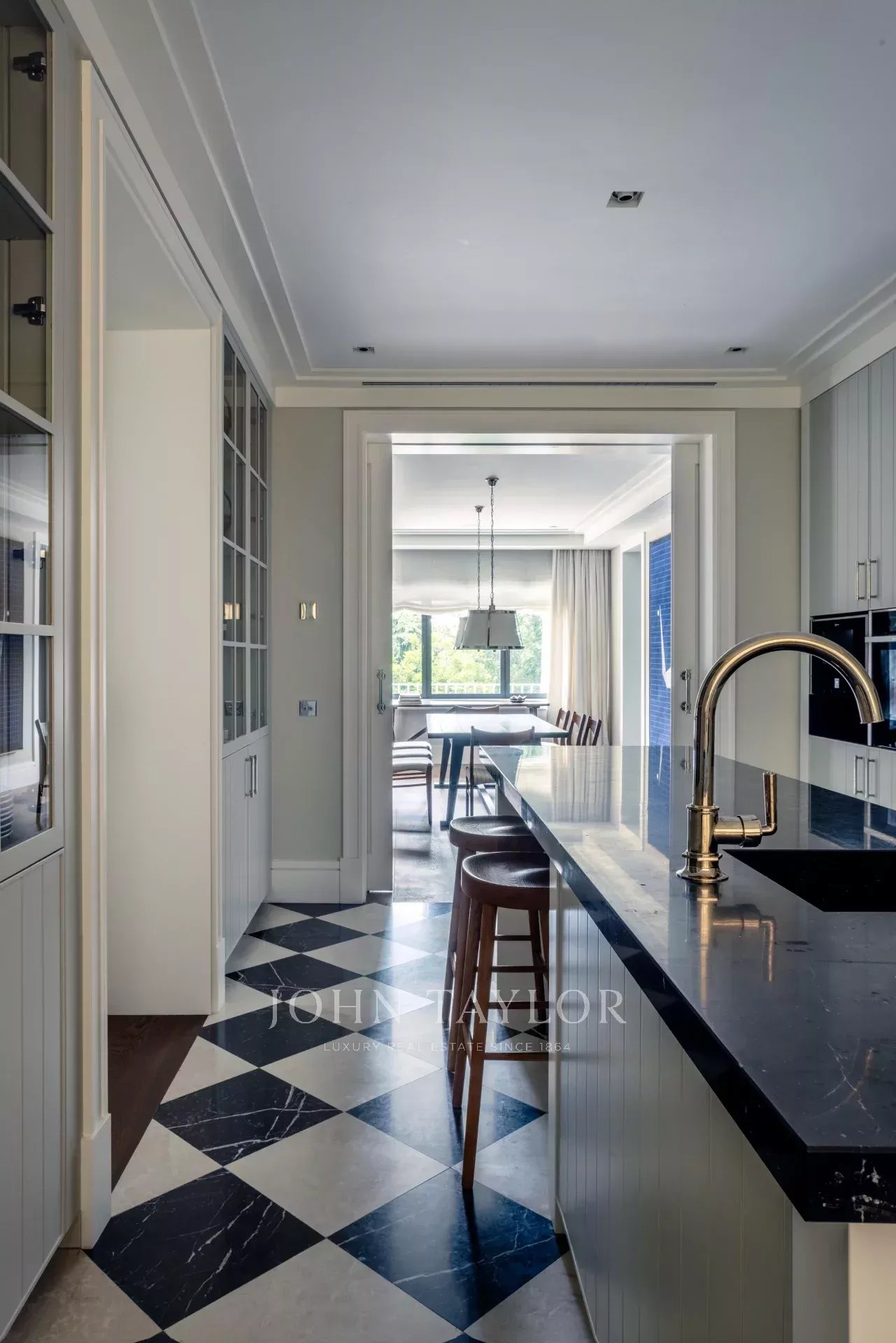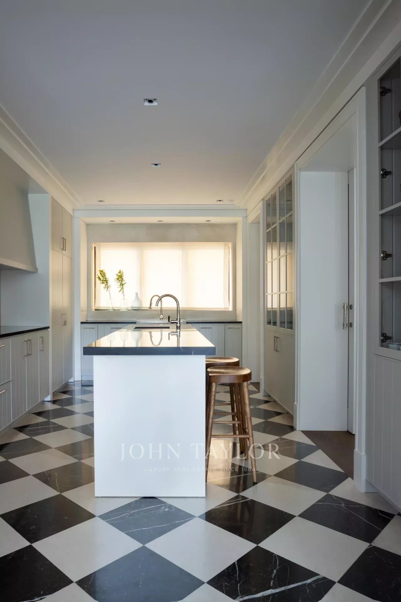 Cada divisão foi executada com um nível de precisão excecional. Os pavimentos em nogueira, a harmonia gráfica do mármore preto e branco 12x12 e uma cozinha concebida como uma peça escultural - com mármore Marquina, ilha central e equipamento GAGGENAU - definem uma estética refinada e coerente.