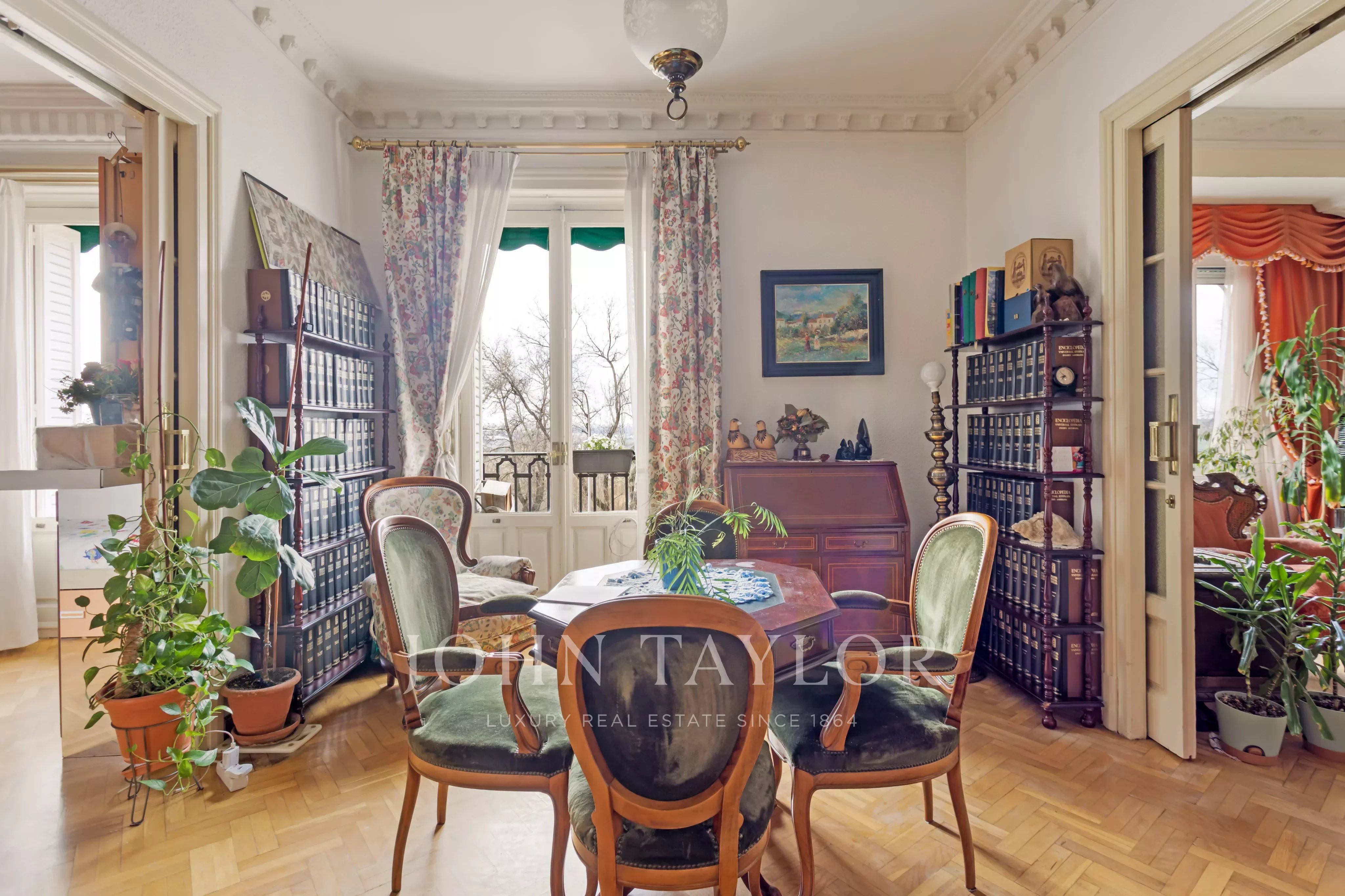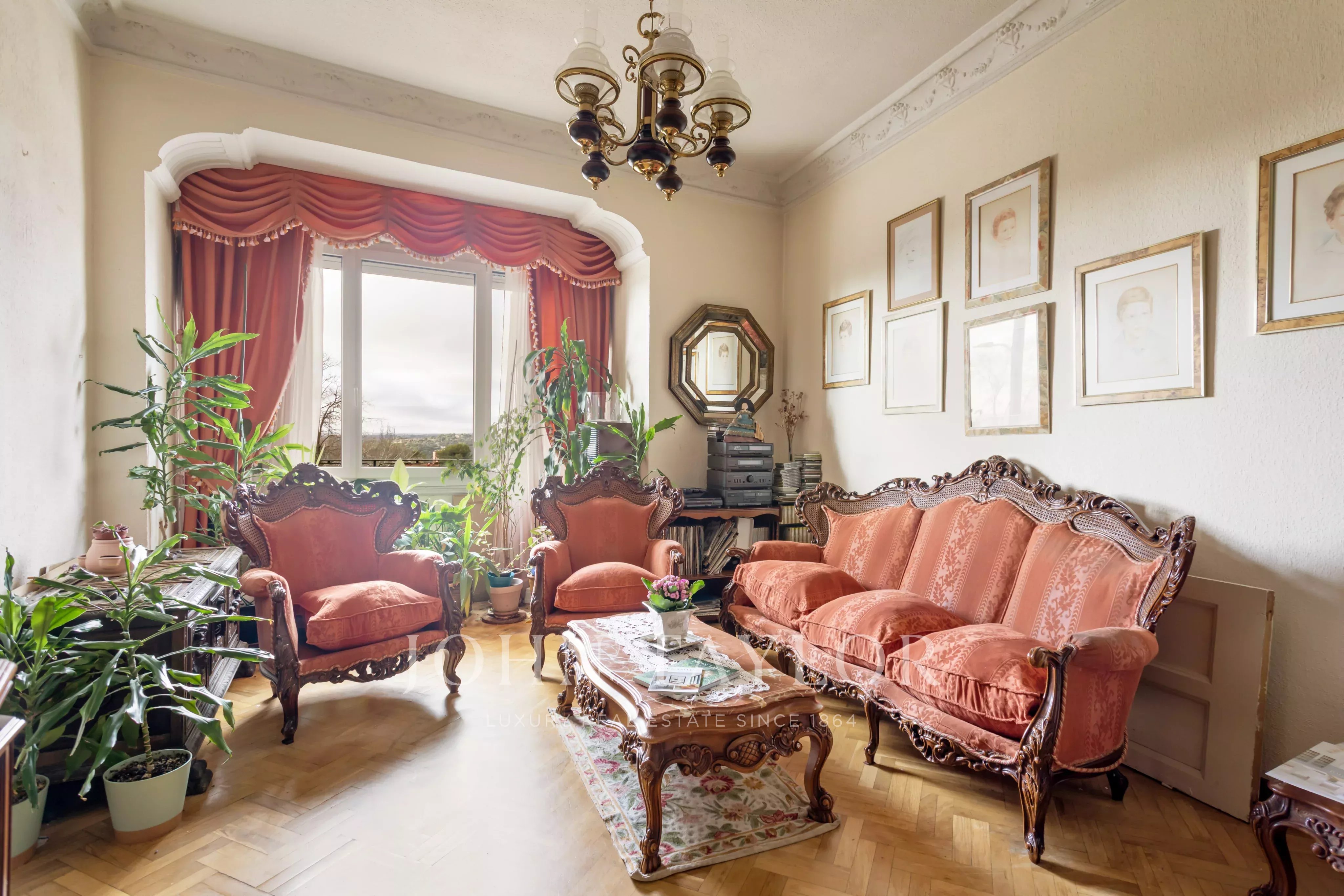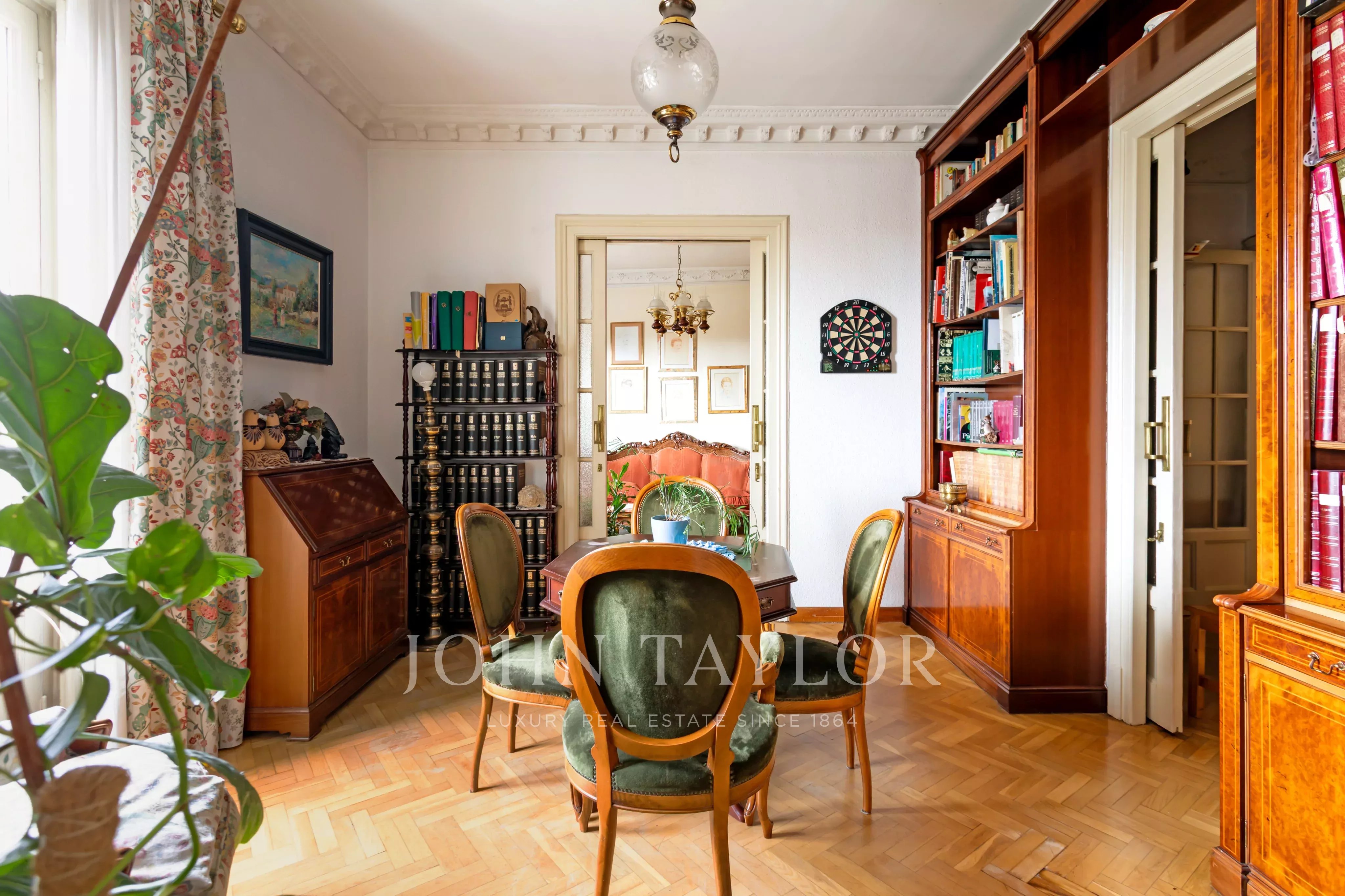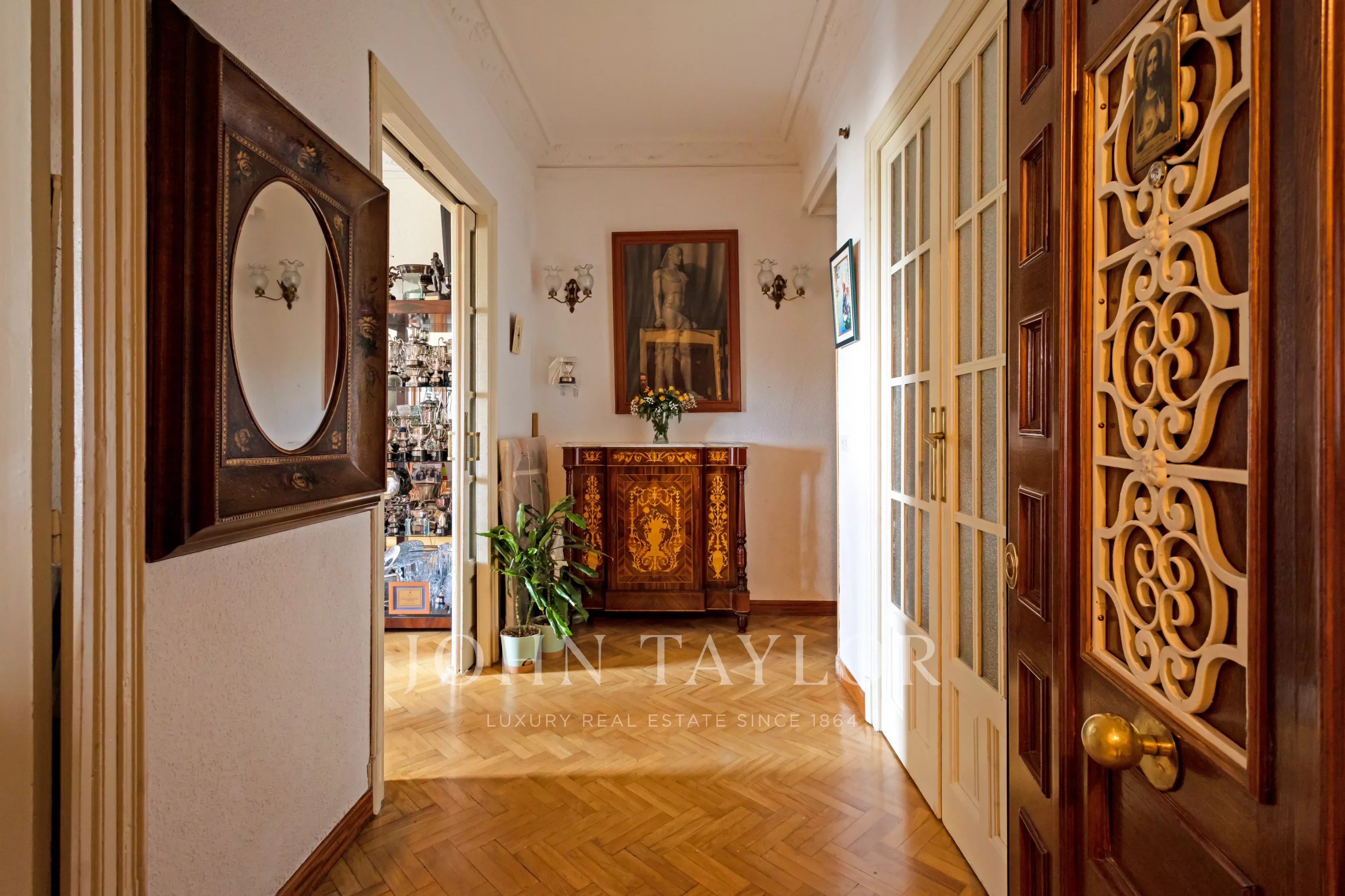 A propriedade destaca-se pelo seu carácter imponente, com tectos altos, molduras clássicas e uma arquitetura que evoca a elegância de um autêntico apartamento palaciano. A sala de estar, espaçosa e banhada por luz natural, abre-se para imponentes varandas com vista direta para o parque, um espaço protegido que garante uma privacidade absoluta e vistas inalteráveis ao longo do tempo.