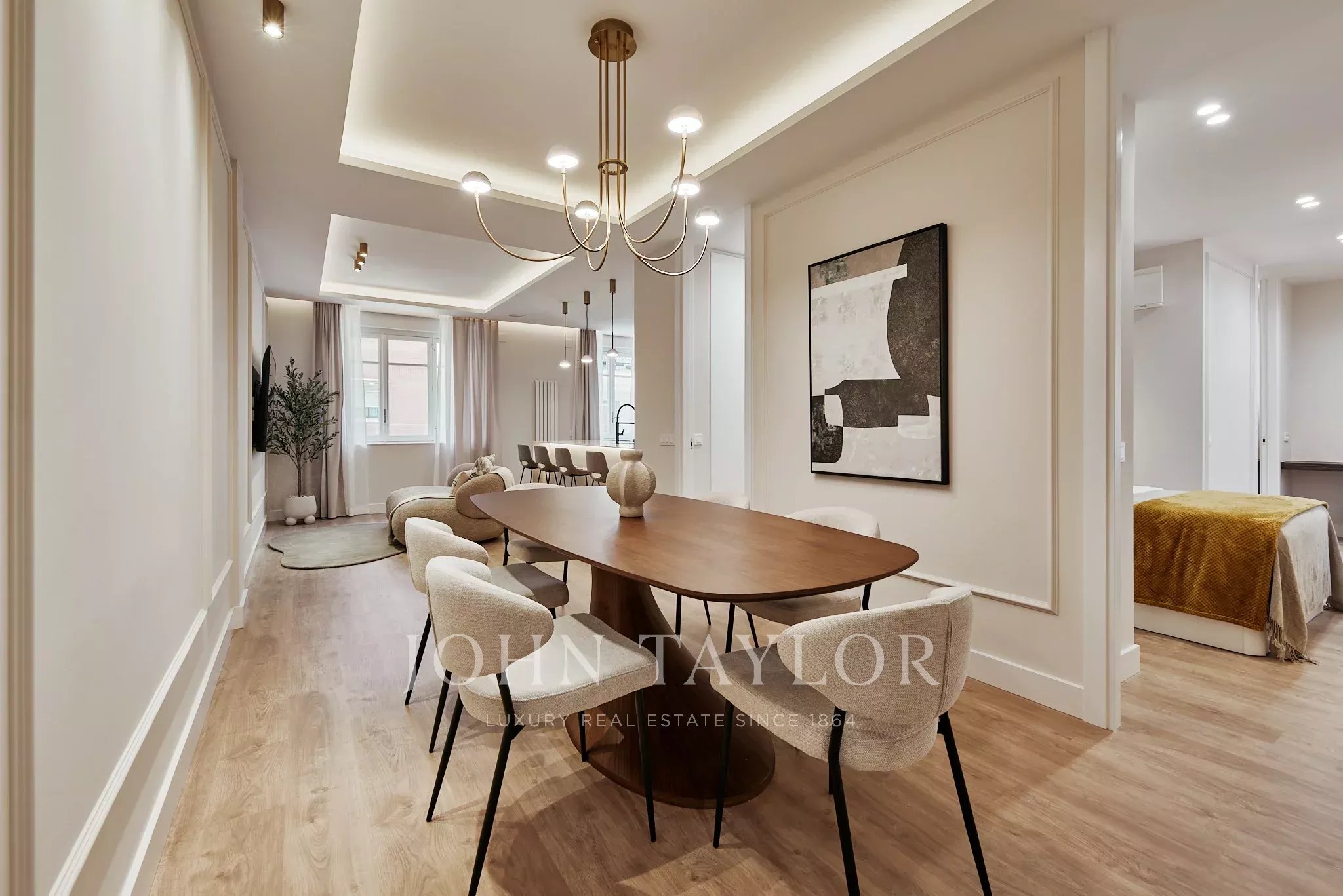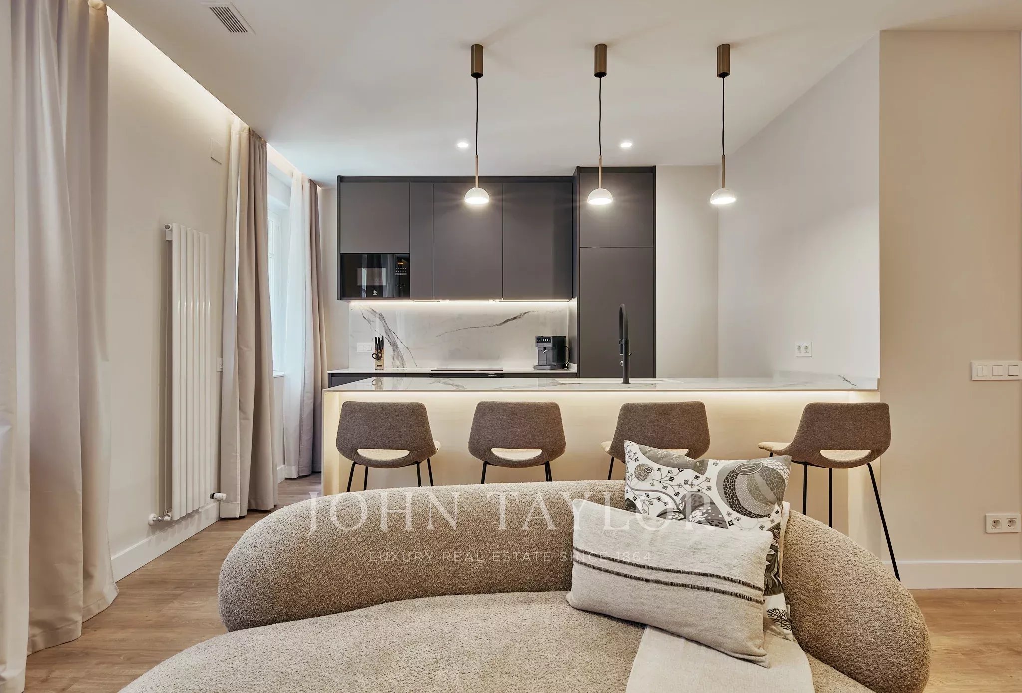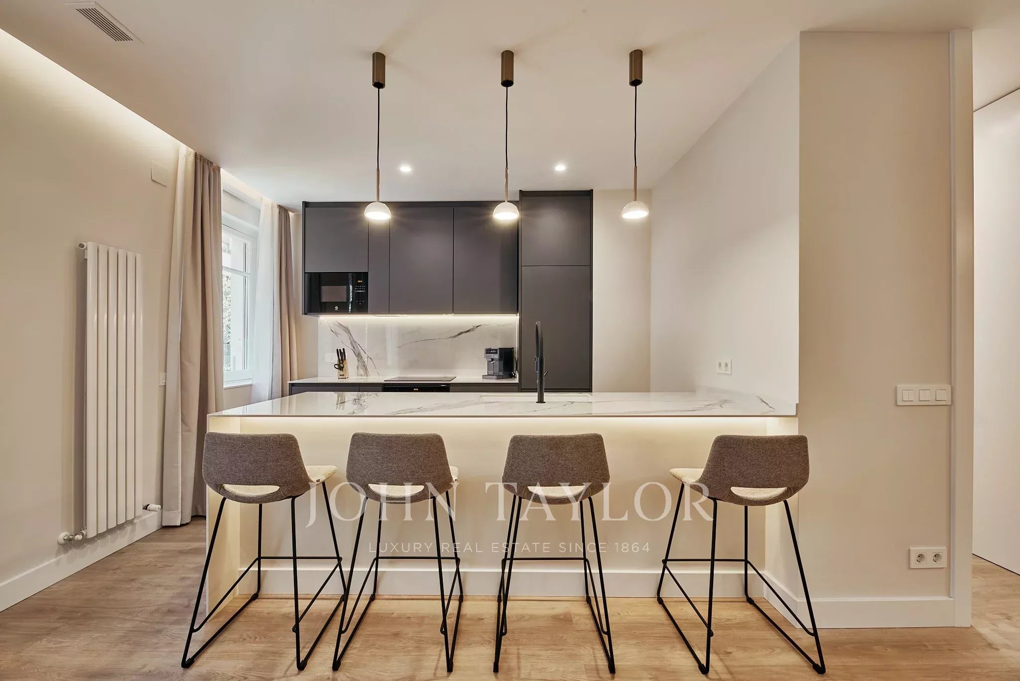 Ampla zona social com sala e cozinha aberta totalmente equipada. Dispone de três quartos e três banheiros, com uma distribuição equilibrada e luminosa.