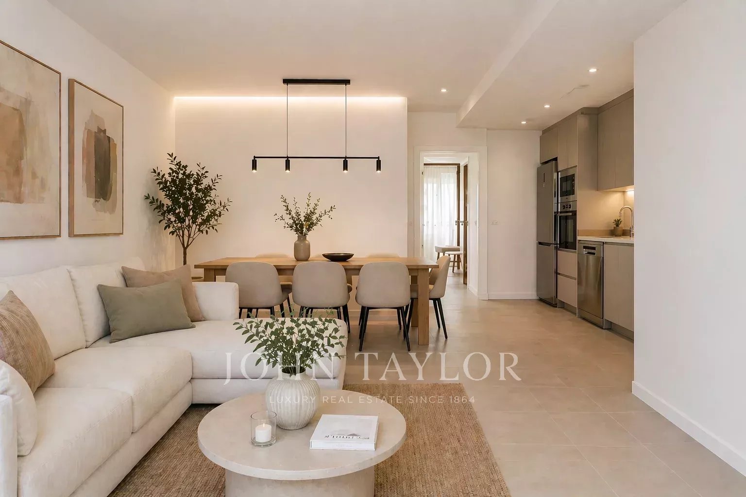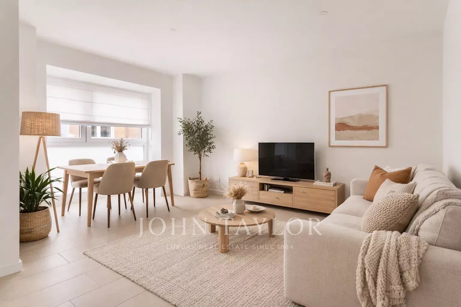 La vivienda, situada en segunda planta, cuenta con 82 m² privativos excelentemente distribuidos, 105 metros cuadrados incluyendo repercusión de zonas comunes del edificio. Dispone de un elegante distribuidor con armarios gabaneros que da paso a una cocina integrada en el salón, completamente equipada, además de una práctica zona de lavandería independiente. El luminoso salón comedor conecta con la zona de descanso, compuesta por dos dormitorios, destacando el principal con vestidor y baño en suite, mientras que un segundo baño completo da servicio al dormitorio secundario y a las visitas. Toda la vivienda es exterior, excepto los cuartos de baño, lo que garantiza una magnífica entrada de luz natural y una agradable sensación de amplitud.