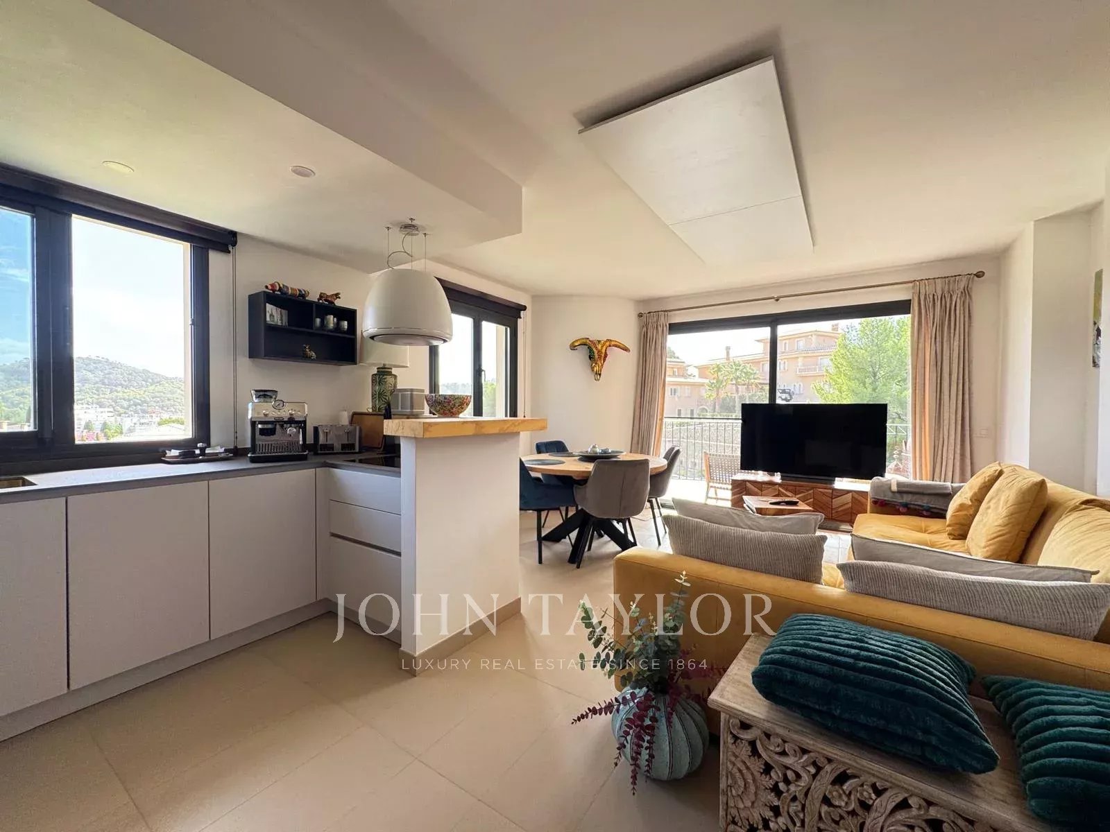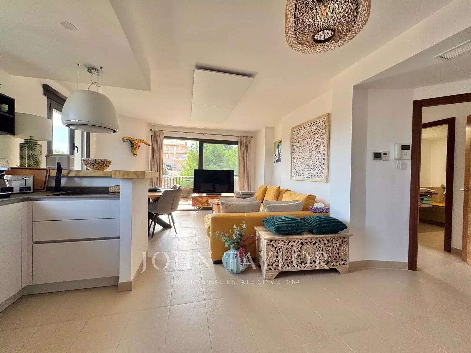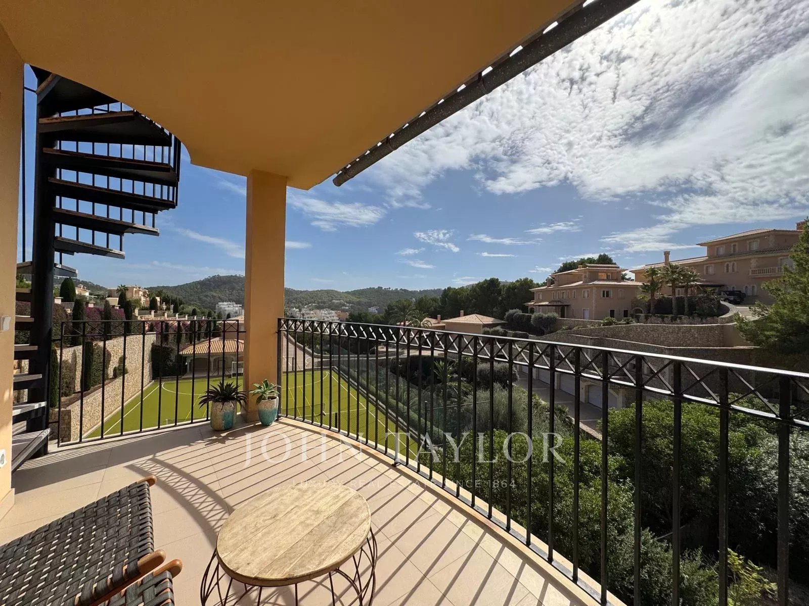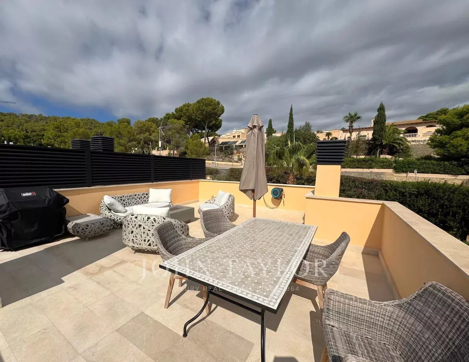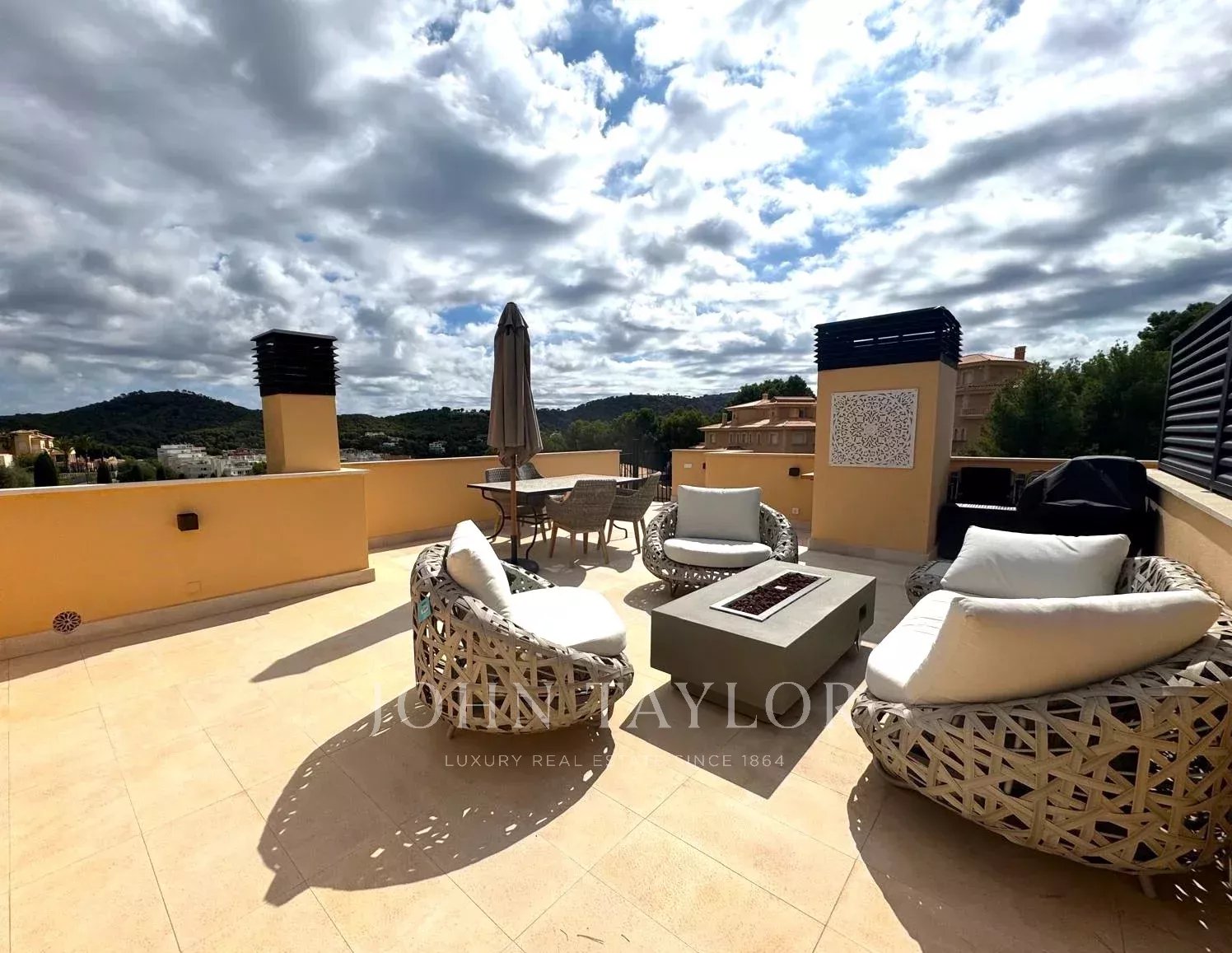 No último andar de um elegante edifício com elevador, encontra-se esta espetacular penthouse, um verdadeiro refúgio de paz e estilo num dos cantos mais desejados do sudoeste de Maiorca. Desde o primeiro momento, o conforto é garantido graças aos dois lugares de estacionamento privados situados mesmo em frente à porta de entrada, sob um prático alpendre. Ao entrar, a casa surpreende pela sua luminosidade e pela sua disposição bem cuidada. O espaçoso quarto principal oferece uma casa de banho privativa e vistas desafogadas que convidam a sonhar, criando uma atmosfera de relaxamento absoluto. No extremo oposto do apartamento, existe um segundo quarto duplo, ideal para hóspedes ou familiares, que garante privacidade e conforto. Existe ainda um terceiro quarto que pode ser utilizado como quarto individual, escritório ou sala polivalente, acompanhado de uma segunda casa de banho com duche. A cozinha em plano aberto destaca-se pelo seu design moderno e funcional, equipada com electrodomésticos topo de gama e uma elegante bancada em pedra natural. Integra-se perfeitamente na sala de estar, uma sala de jantar banhada por luz natural, que se liga diretamente ao terraço principal e se torna o coração da casa.