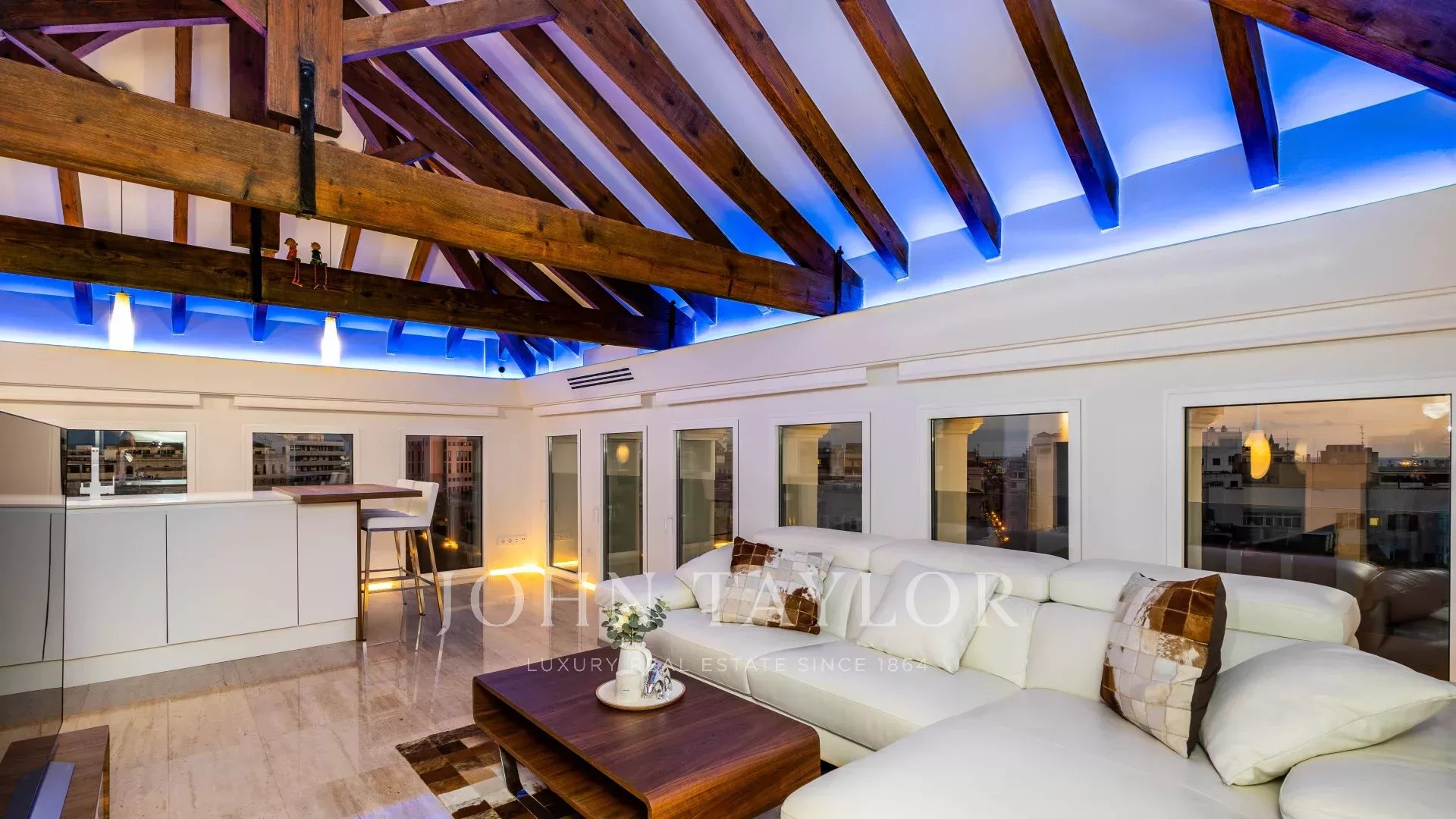 Esta penthouse duplex única foi submetida a uma reforma completa durante 2021. Situada no topo de um dos edifícios mais emblemáticos das Avenidas de Palma, oferece vistas deslumbrantes sobre a cidade e em direção ao mar. No rés do chão encontram-se dois quartos, duas casas de banho, w.c. de serviço e acesso a um dos dois terraços. No piso superior encontra-se a cozinha, a sala de estar e de jantar com janelas envolventes com vistas de 360º, tectos com vigas de madeira e acesso direto ao segundo terraço. Com piso radiante em toda a casa, o ar condicionado central e a instalação domótica garantem o conforto e a facilidade de gerir a propriedade através do telemóvel, ipad ou computador. O imóvel está a ser vendido totalmente mobilado e inclui dois lugares de garagem.