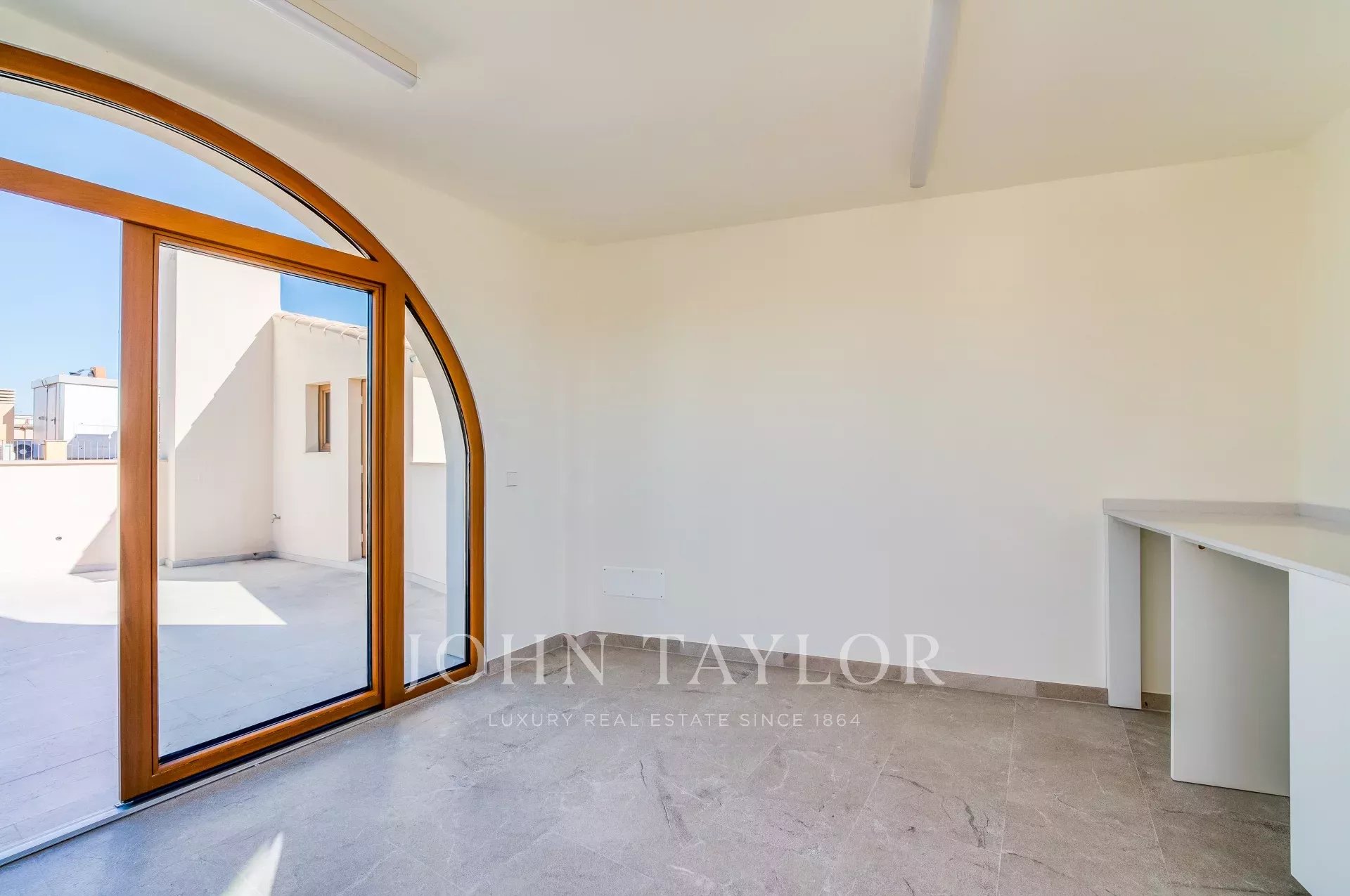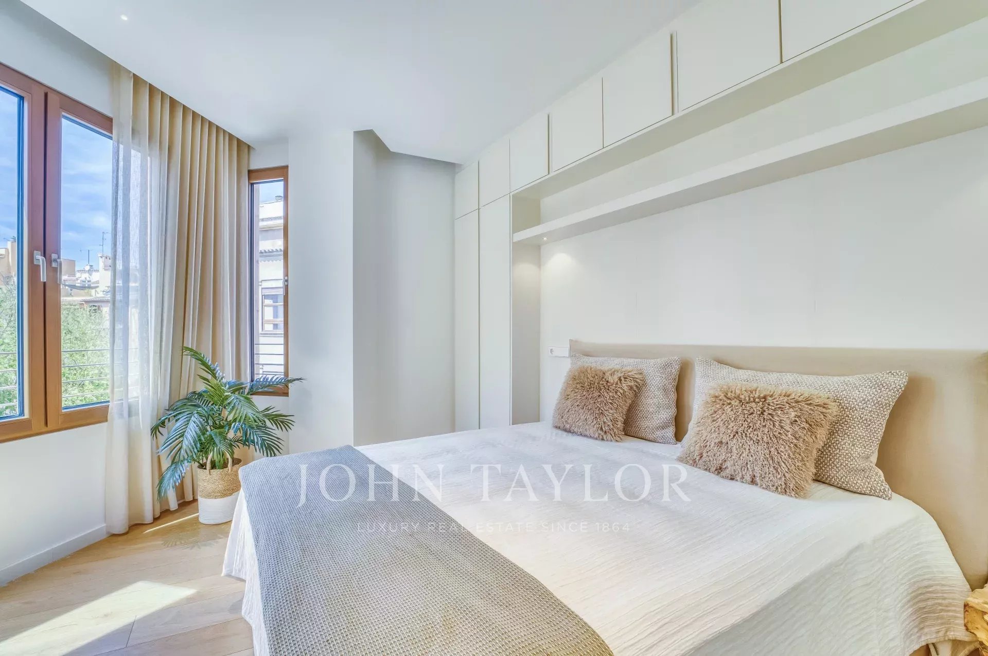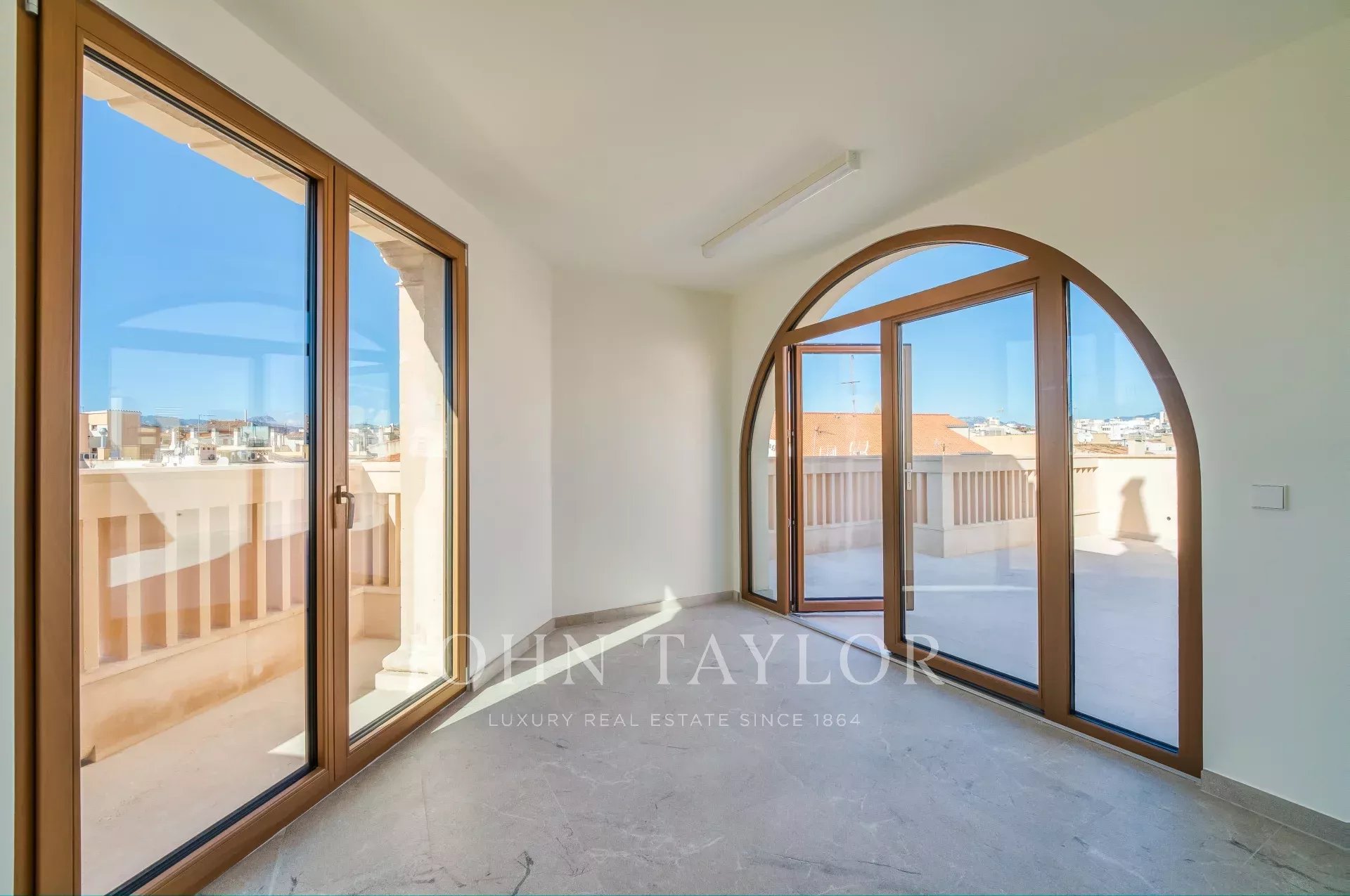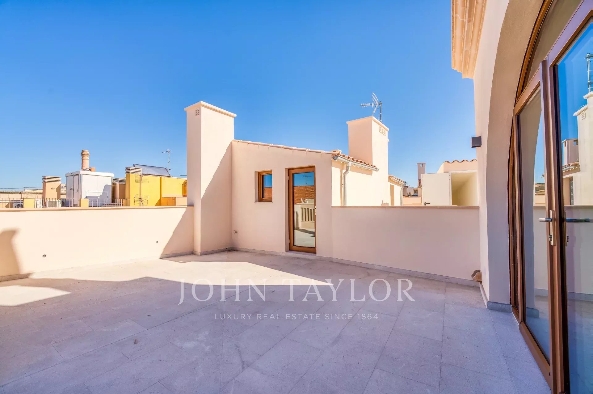 Situada numa praça tranquila no coração da cidade velha de Palma, esta luxuosa penthouse duplex é composta por dois quartos, três casas de banho (duas en-suite, uma casa de banho de hóspedes), uma lavandaria, bem como um terraço único no telhado. Enquanto o nível de entrada oferece uma ampla planta aberta para a cozinha/jantar/área de estar, os quartos criam uma privacidade tranquila no nível inferior. As grandes janelas personalizadas, o pavimento em madeira e os tons quentes no interior asseguram um ambiente acolhedor em todas as divisões. Um verdadeiro destaque da propriedade é o terraço privado no telhado com uma torre espetacular, que é acessível diretamente através do apartamento. A partir daqui, pode desfrutar de vistas panorâmicas sobre a cidade velha e o mar. Para seu conforto, toda a penthouse está equipada com aquecimento por piso radiante, ar condicionado e domótica. Se necessário, pode ser adquirido adicionalmente um estacionamento em garagem no mesmo edifício.