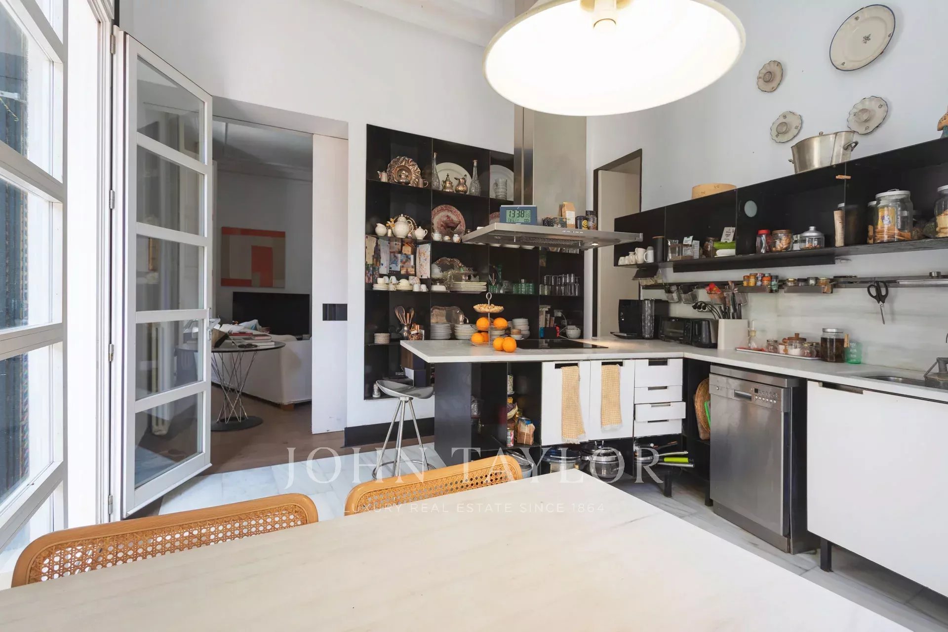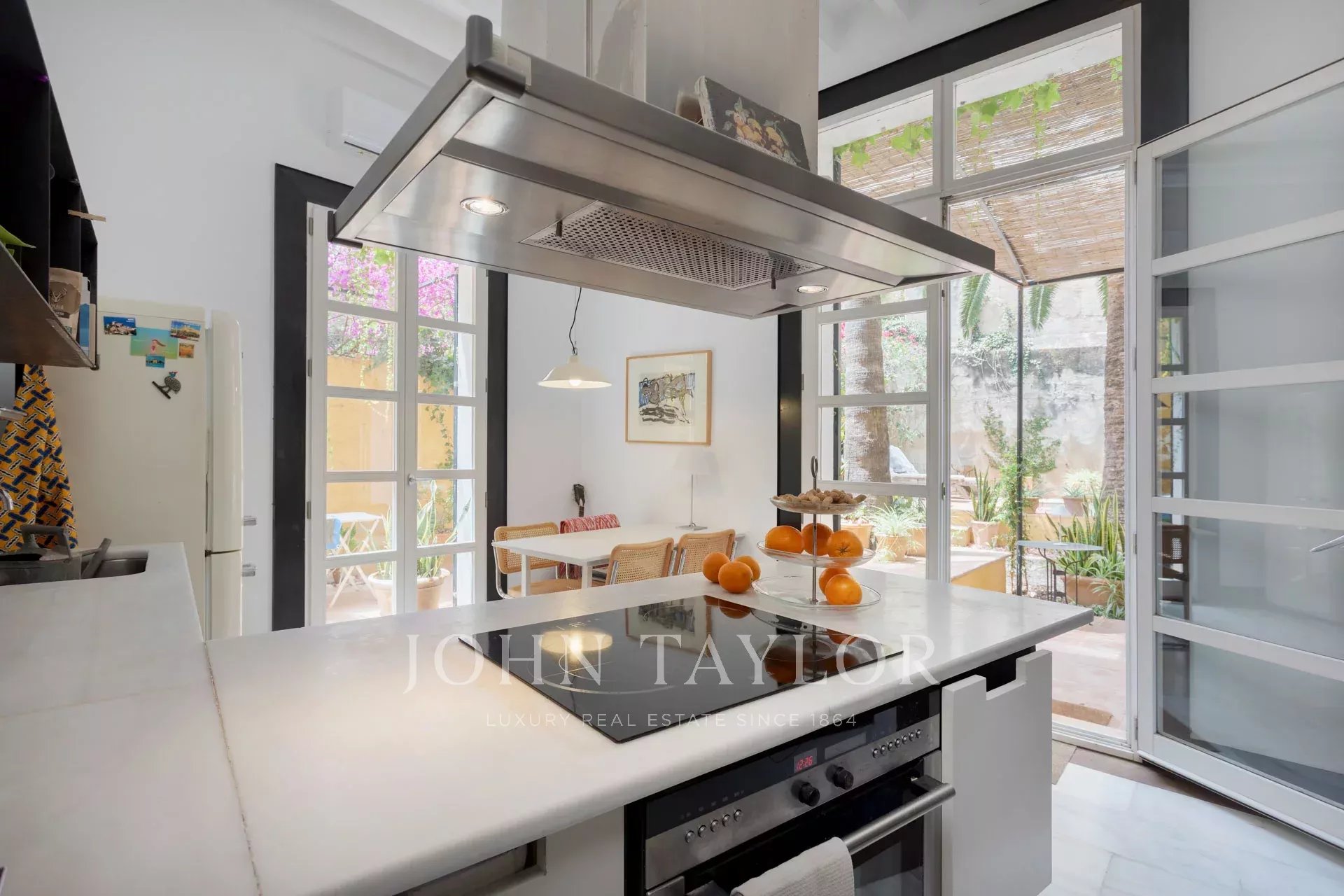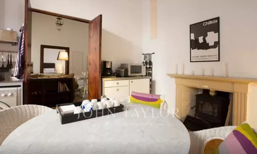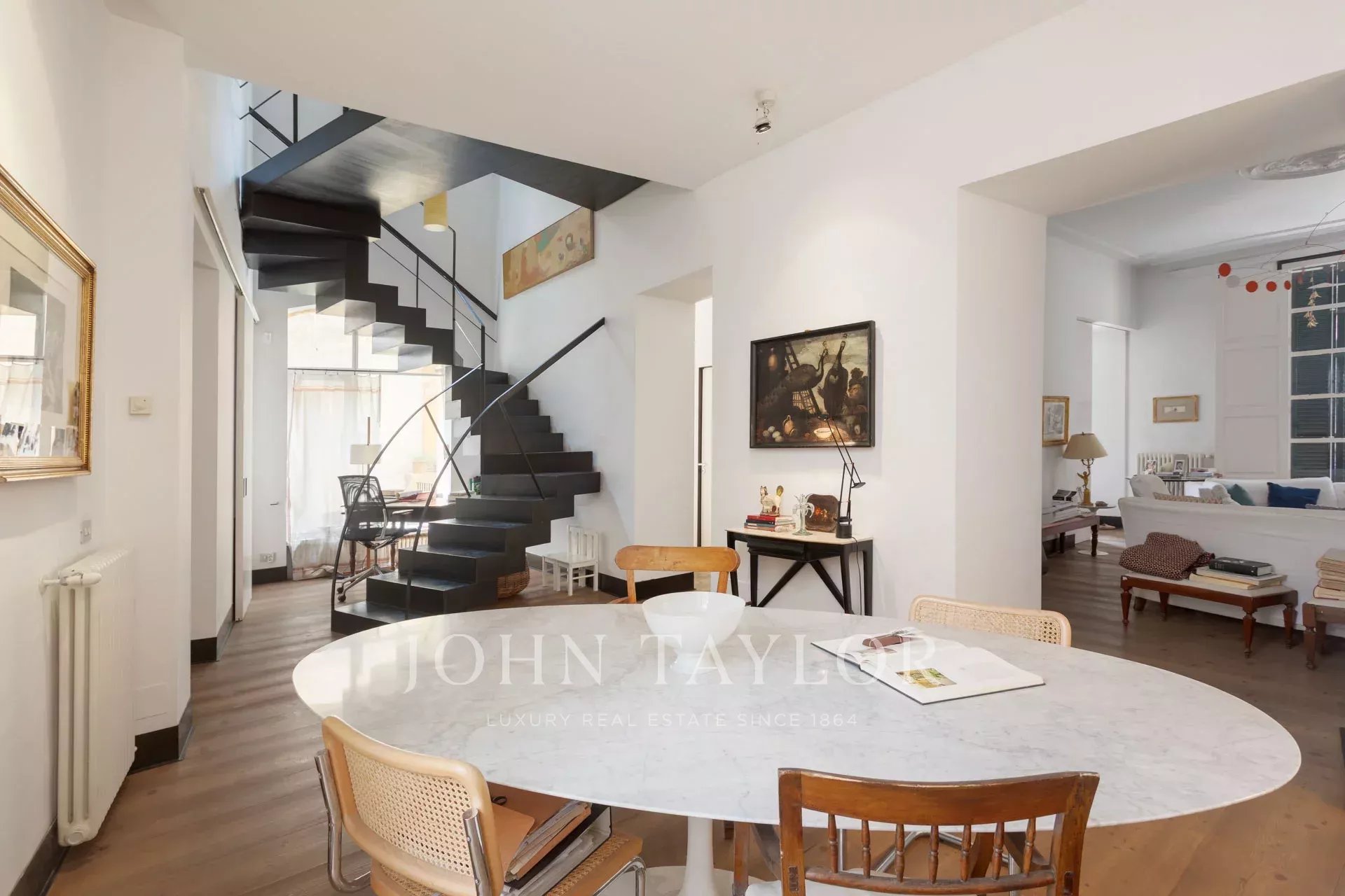 No piso inferior, a sala de jantar, a área de estar e a cozinha totalmente equipada abrem-se diretamente para um impressionante terraço privado, um retiro tranquilo no centro da cidade. Várias áreas de estar e uma piscina de 25 m² criam o cenário perfeito para relaxar ou divertir-se. Os altos muros circundantes asseguram total privacidade e permitem a entrada de muita luz natural.