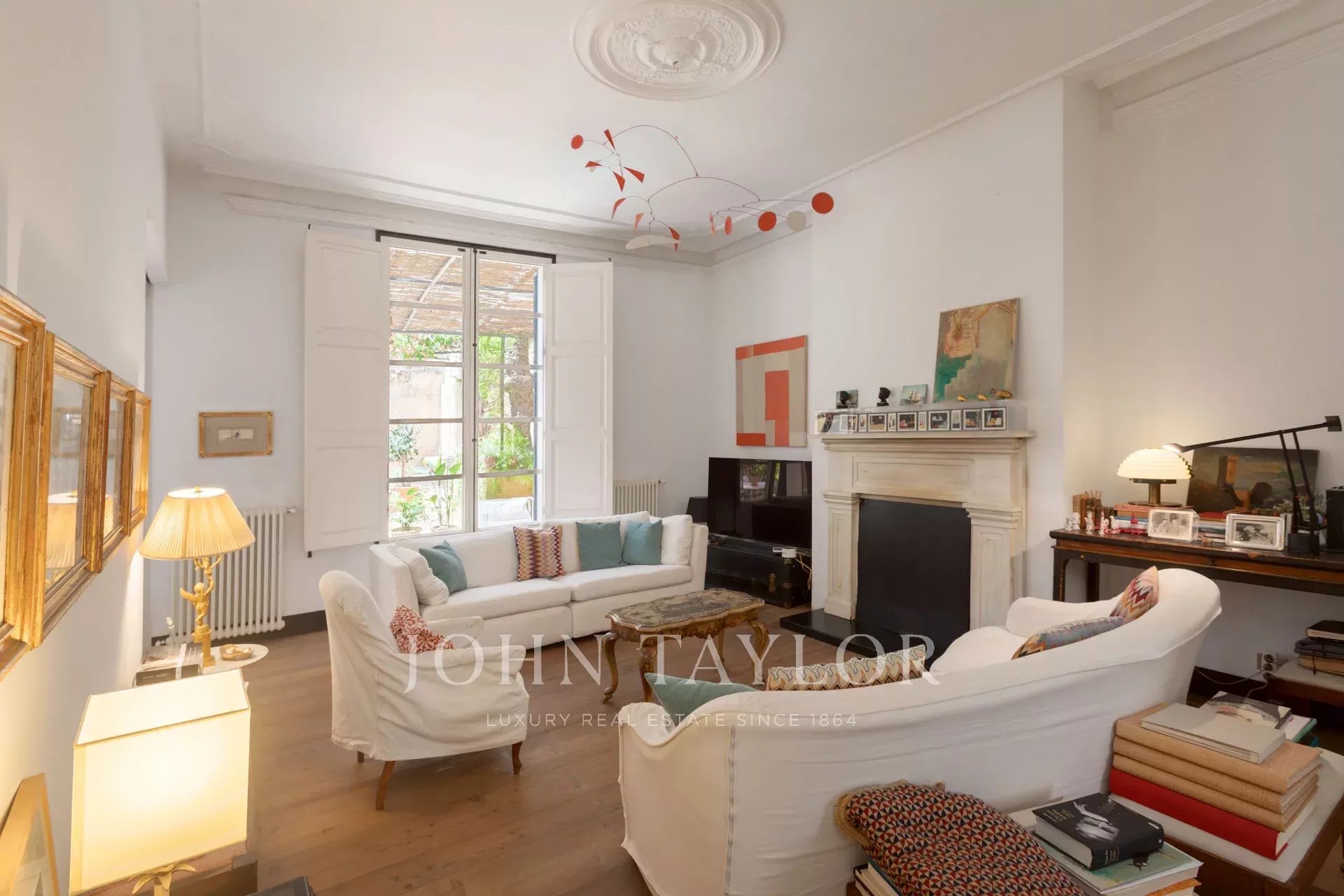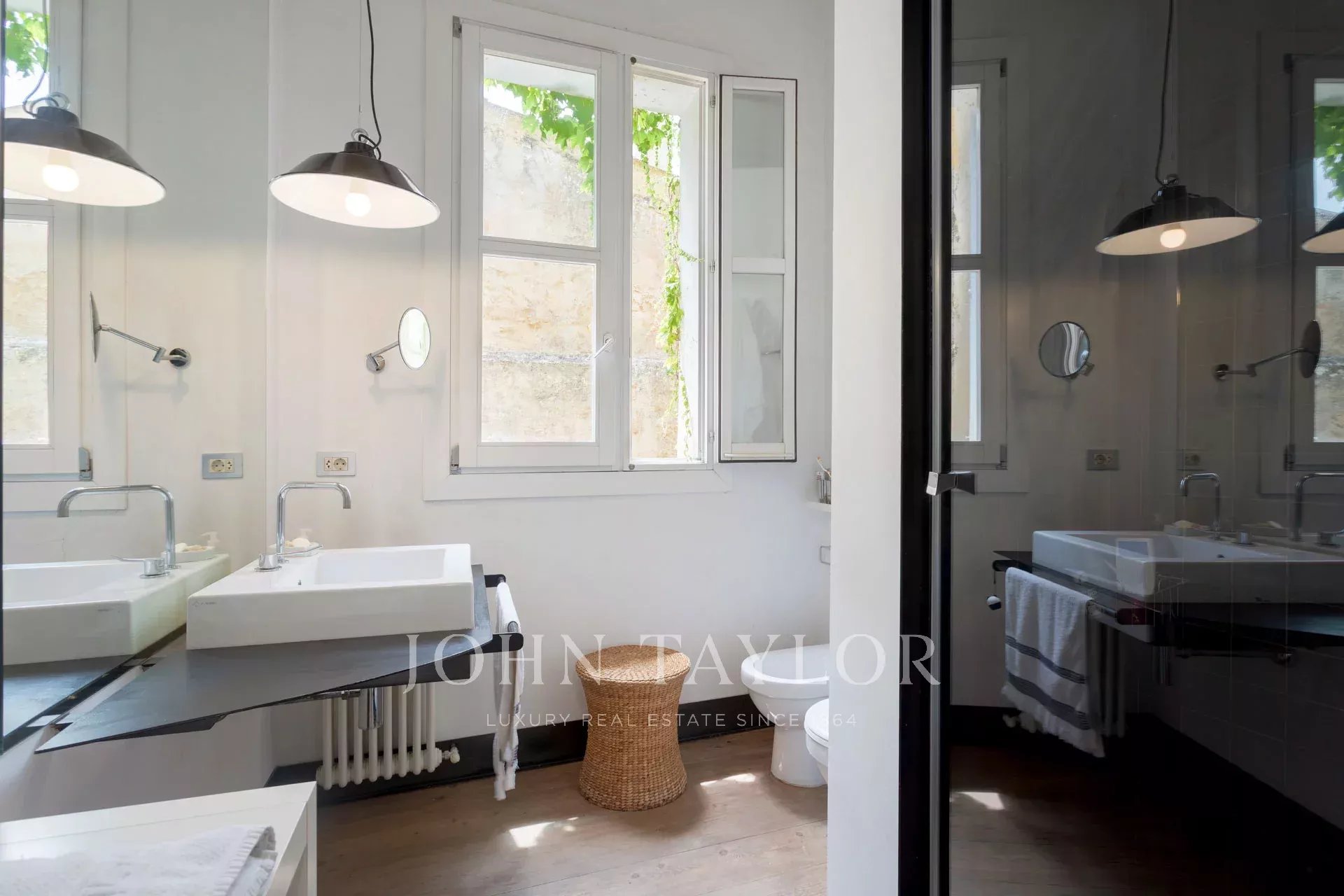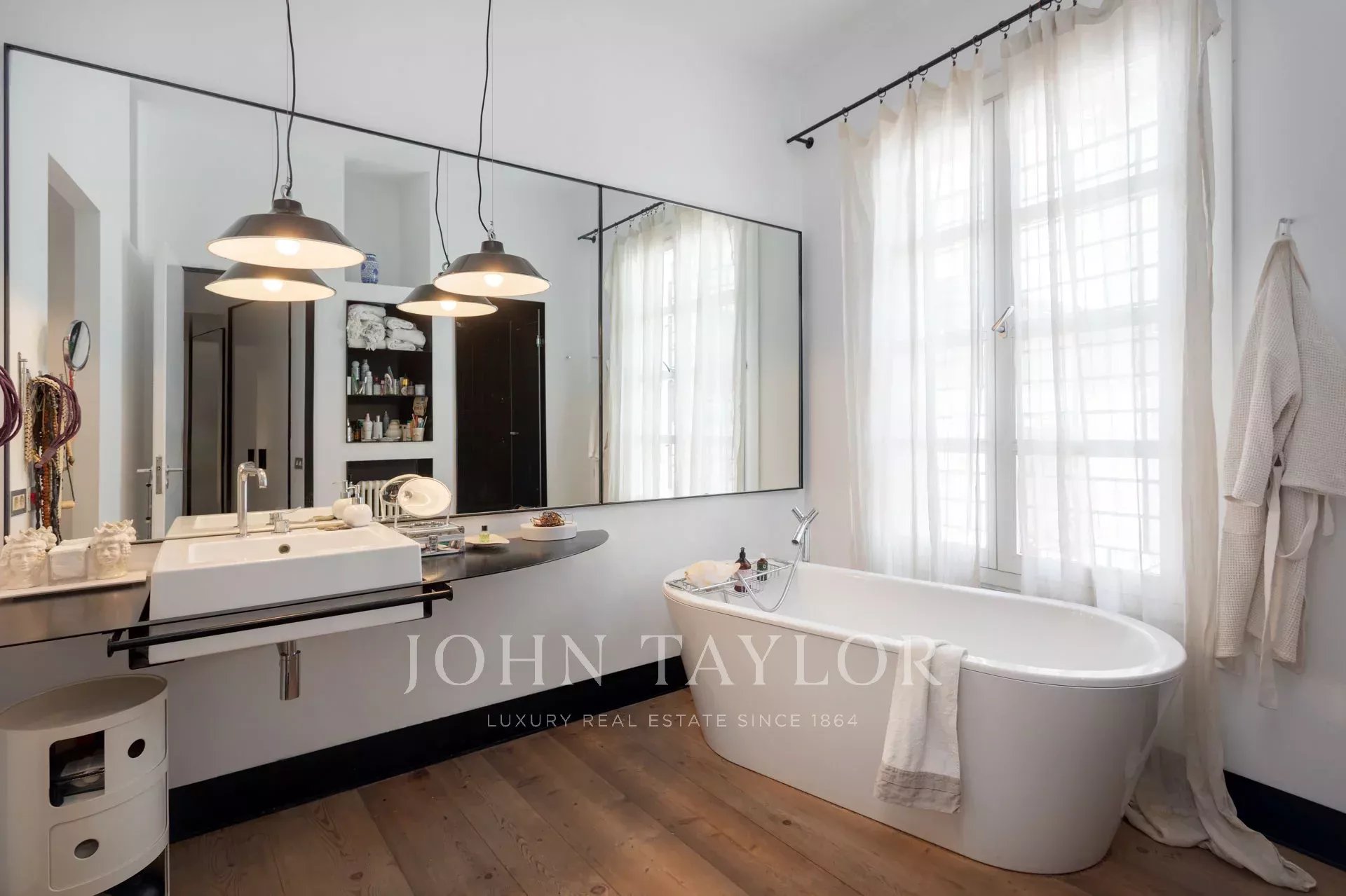 No piso inferior, a sala de jantar, a área de estar e a cozinha totalmente equipada abrem-se diretamente para um impressionante terraço privado, um retiro tranquilo no centro da cidade. Várias áreas de estar e uma piscina de 25 m² criam o cenário perfeito para relaxar ou divertir-se. Os altos muros circundantes asseguram total privacidade e permitem a entrada de muita luz natural.