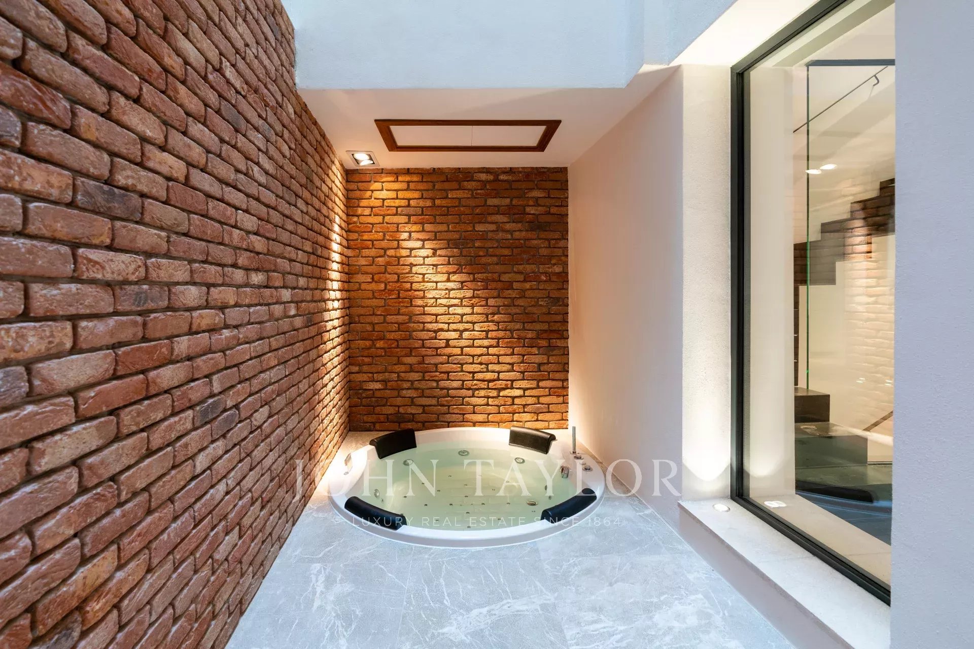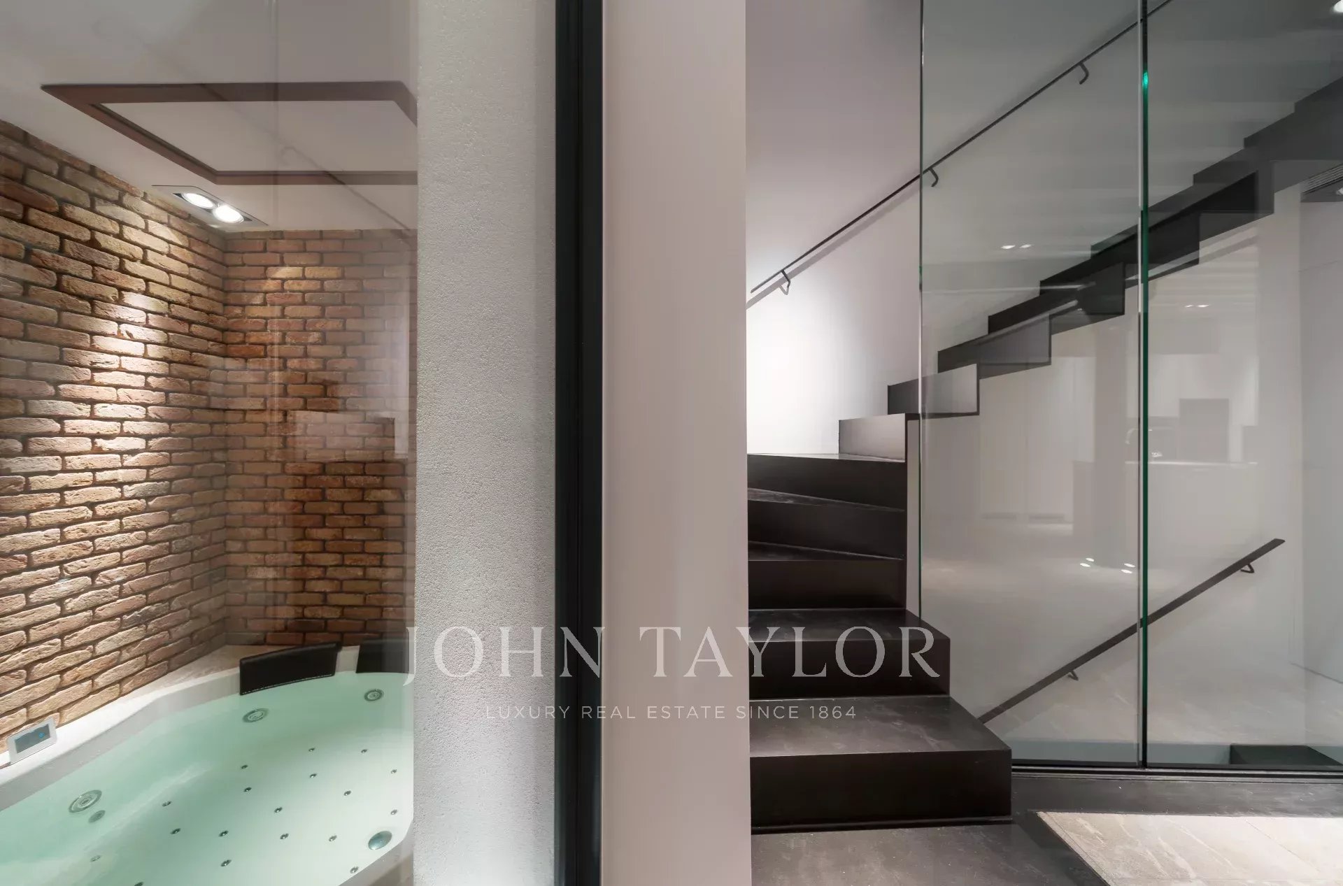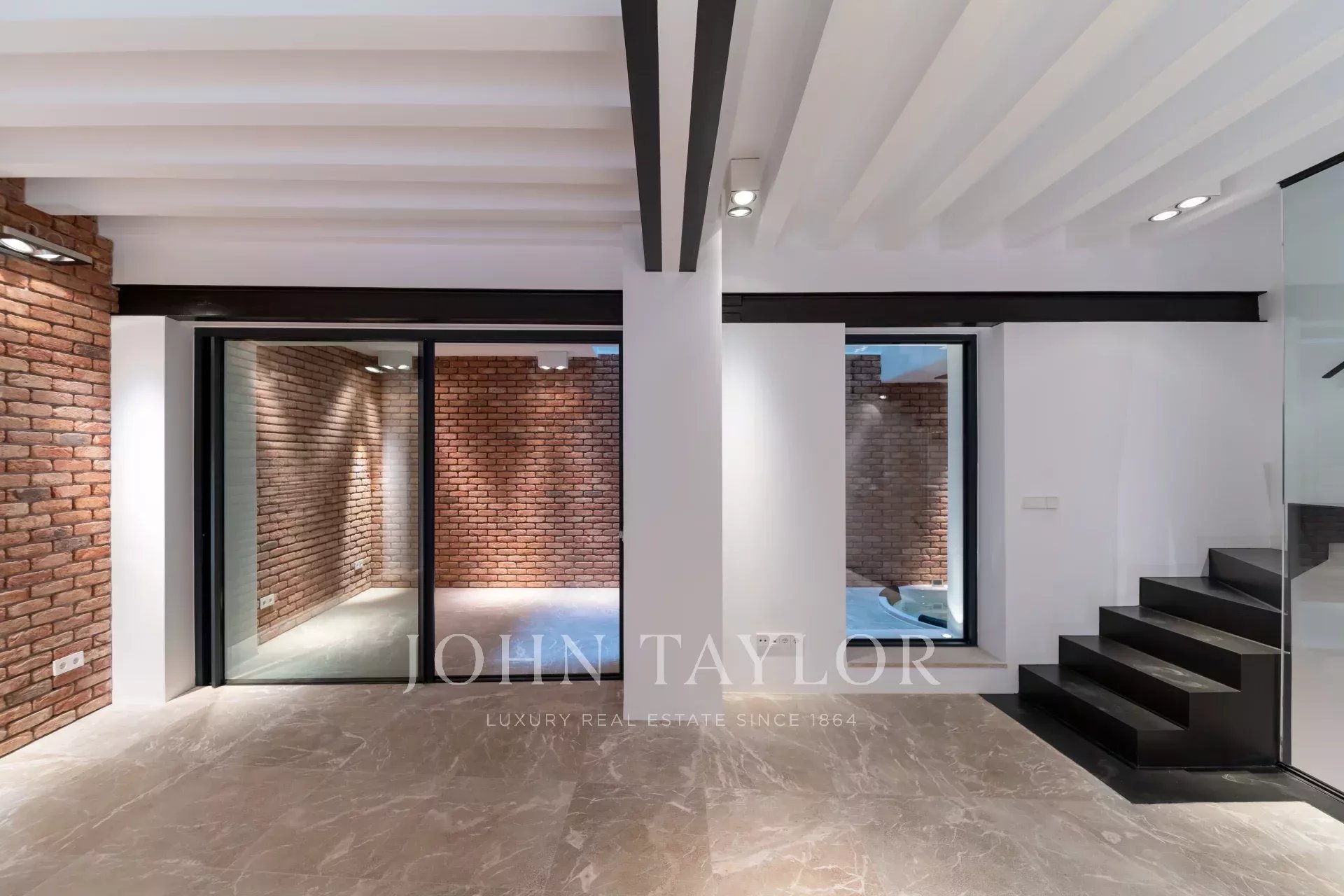 No rés do chão, o coração da casa desdobra-se numa área de estar e de jantar em plano aberto, ancorada por uma cozinha de design topo de gama com balcão de bar - um cenário perfeito para receber com estilo. Uma parede de vidro dramática emoldurada em ferro preto abre-se para um pátio privado com uma banheira de hidromassagem, onde o interior se encontra com o exterior na perfeição.