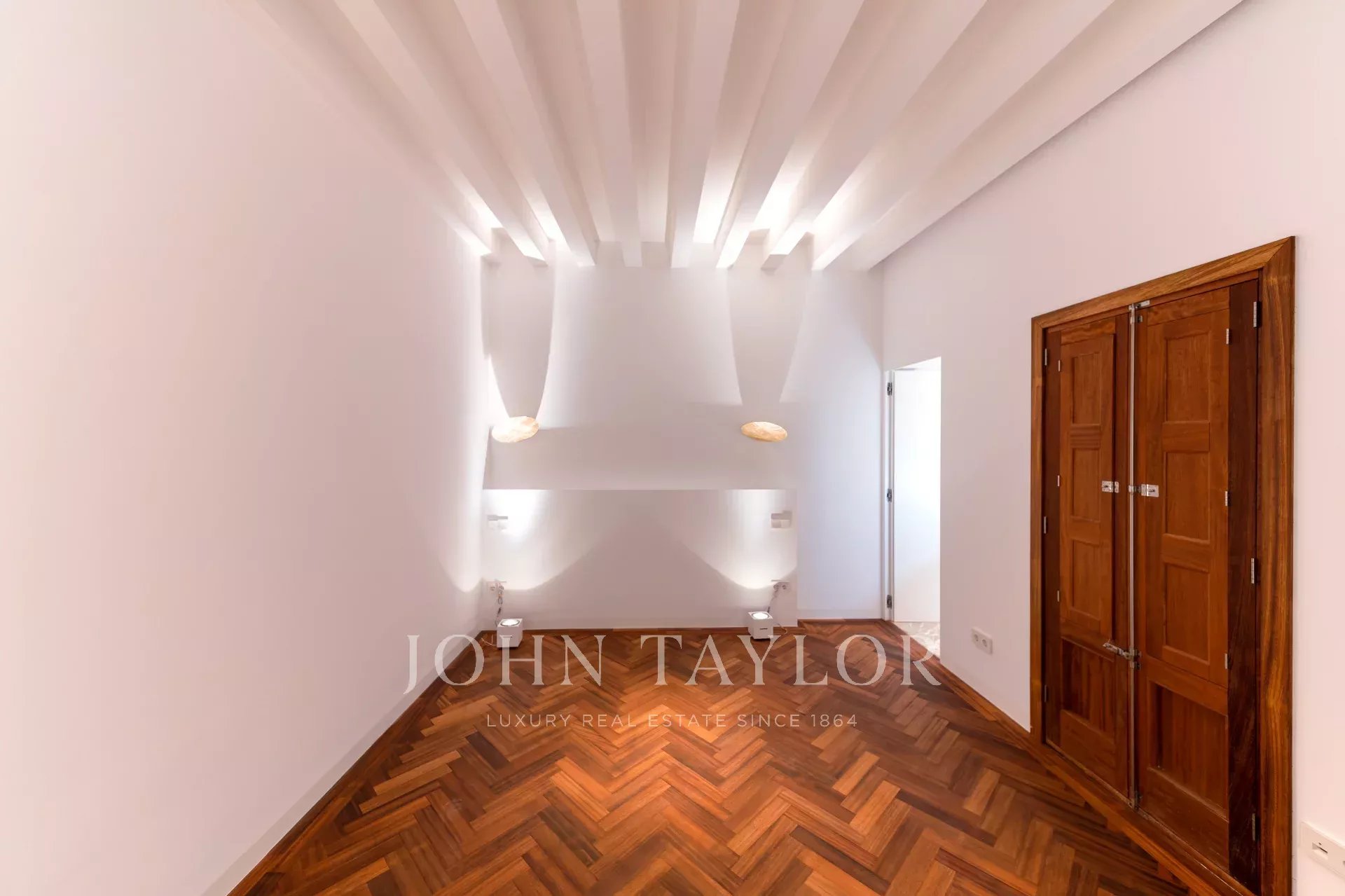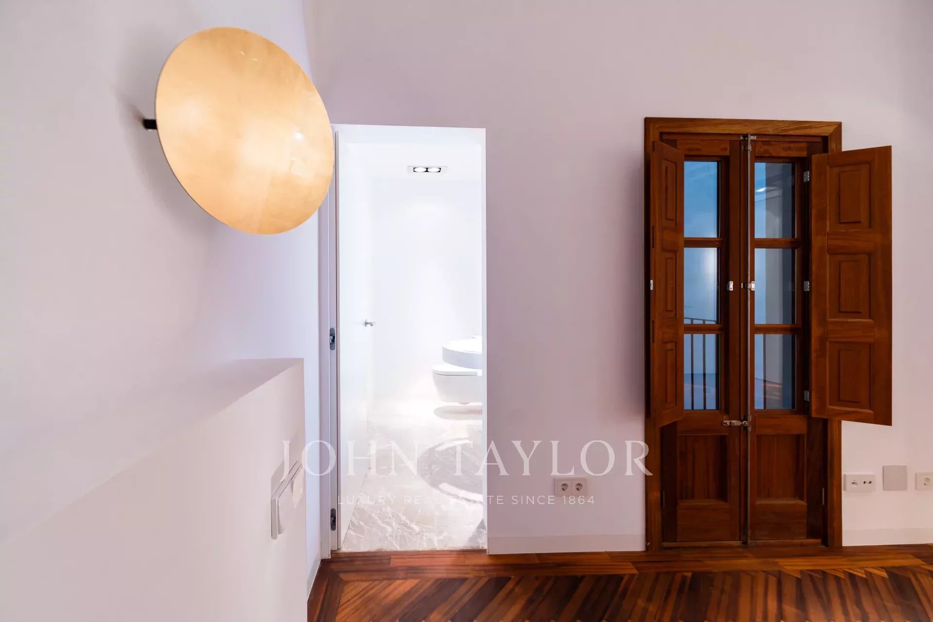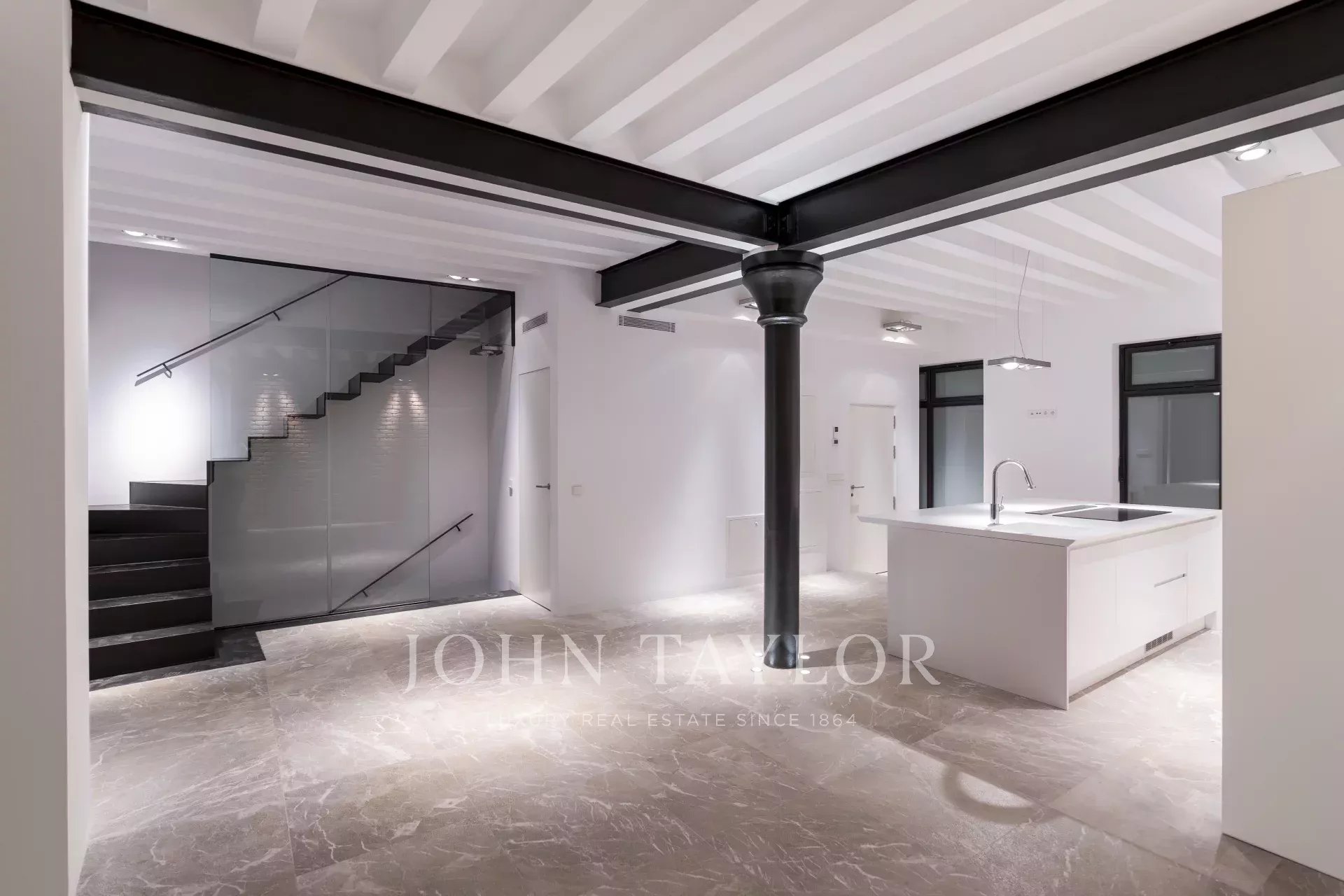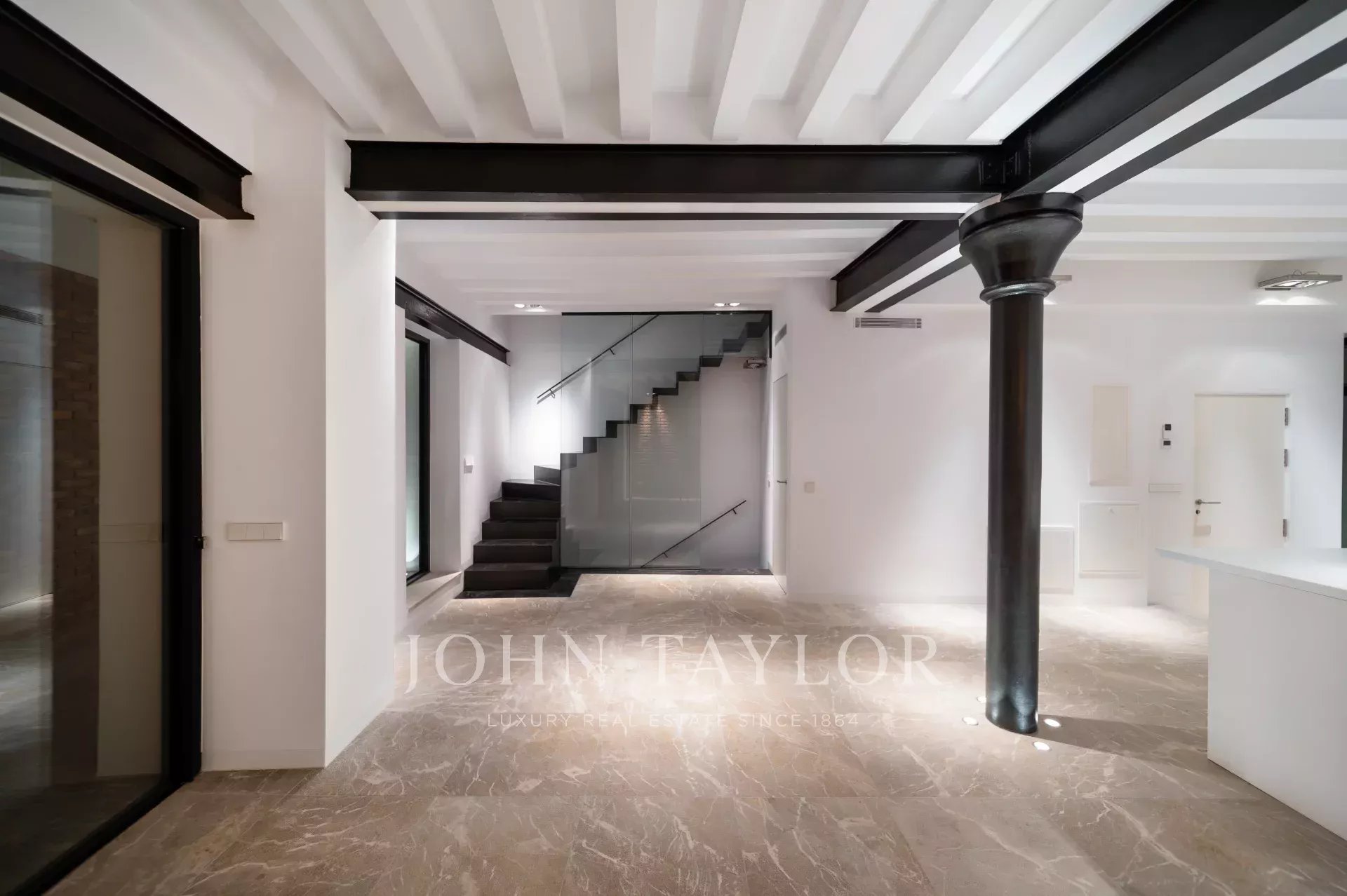 Uma impressionante escadaria de ferro preto, rodeada por balaustradas de vidro, conduz ao piso superior, onde dois quartos generosos com casas de banho privativas o aguardam. Os elegantes pavimentos em madeira em espinha e os armários embutidos feitos à medida combinam o charme autêntico com a sofisticação contemporânea.
