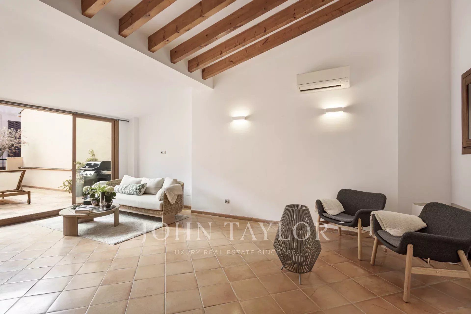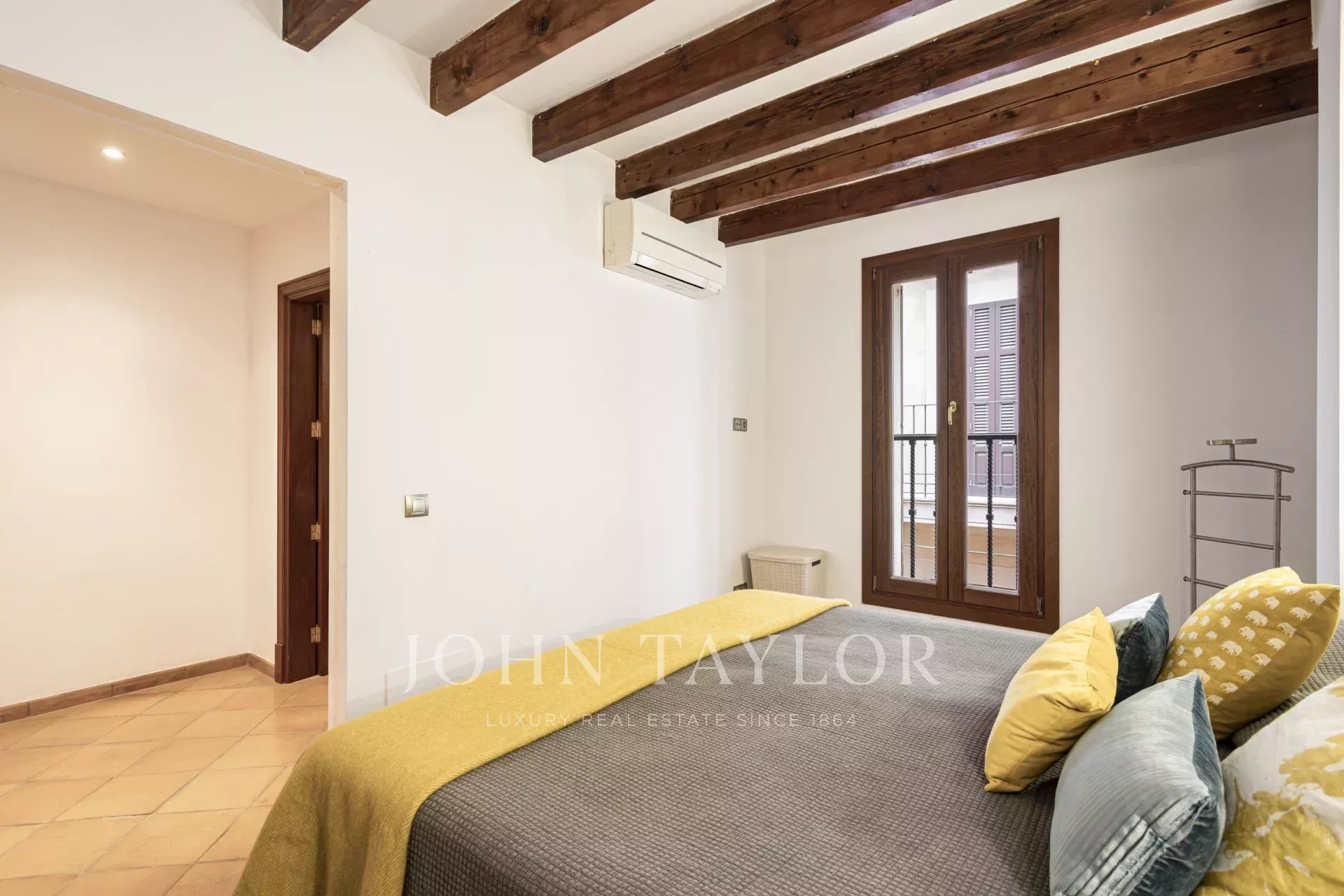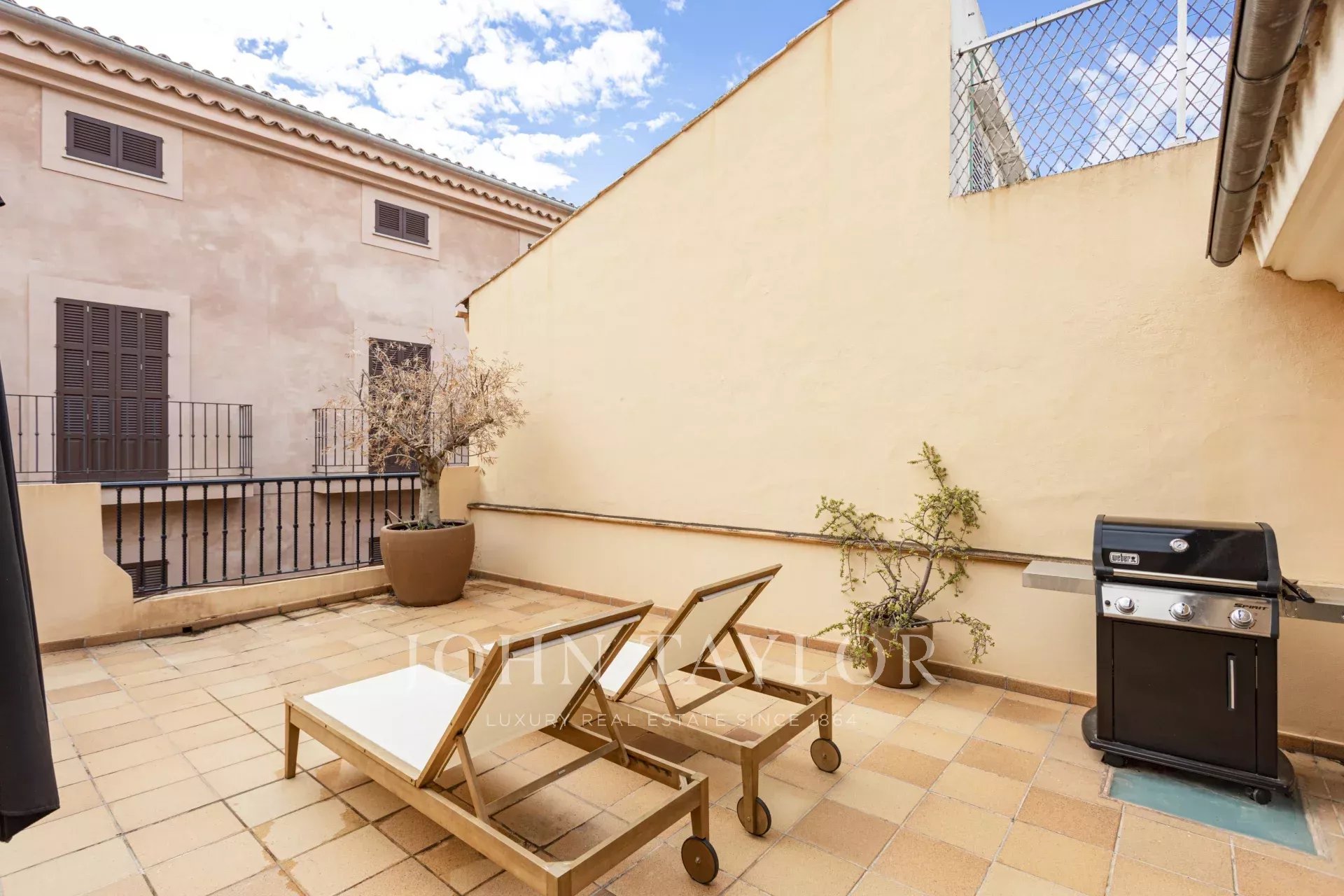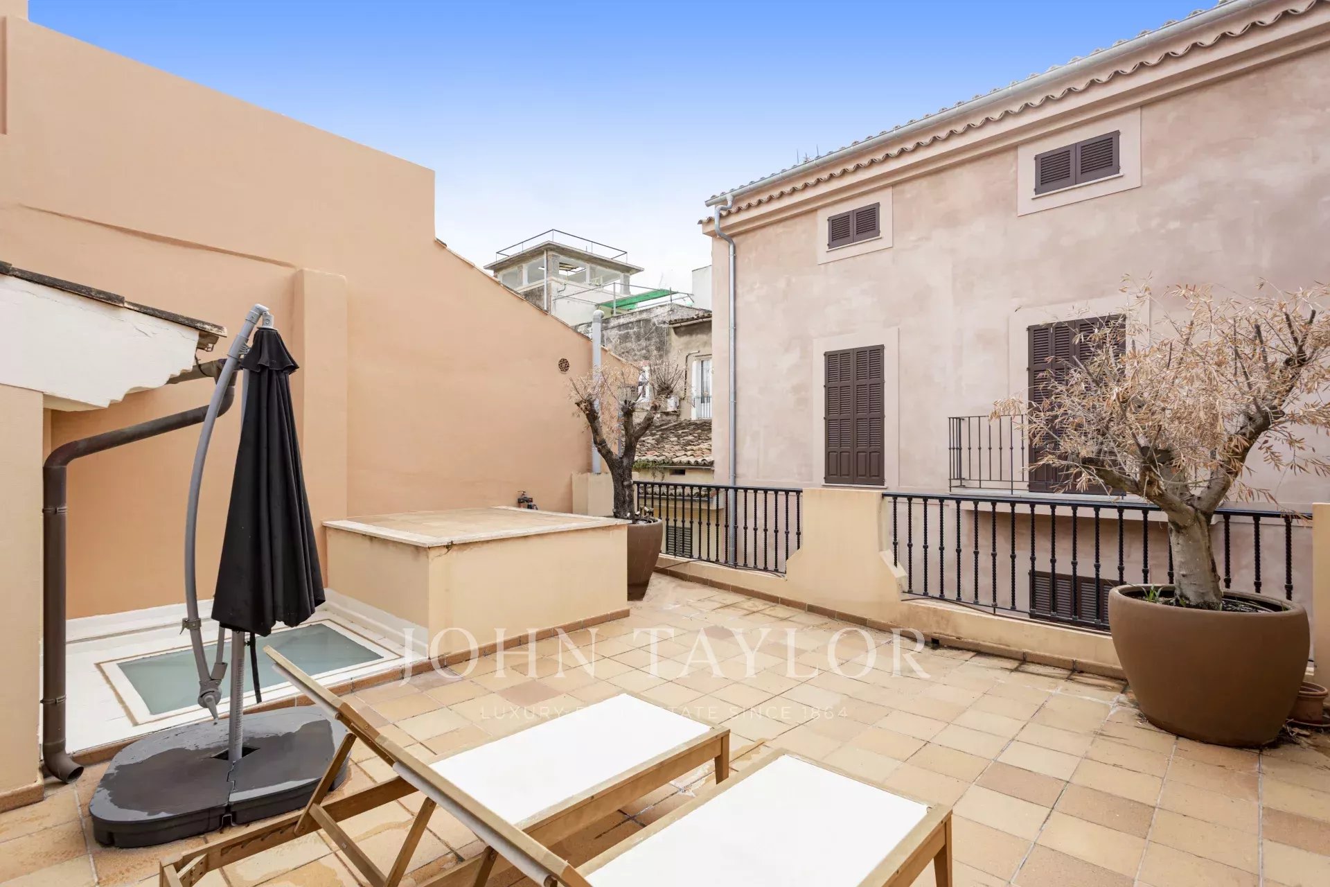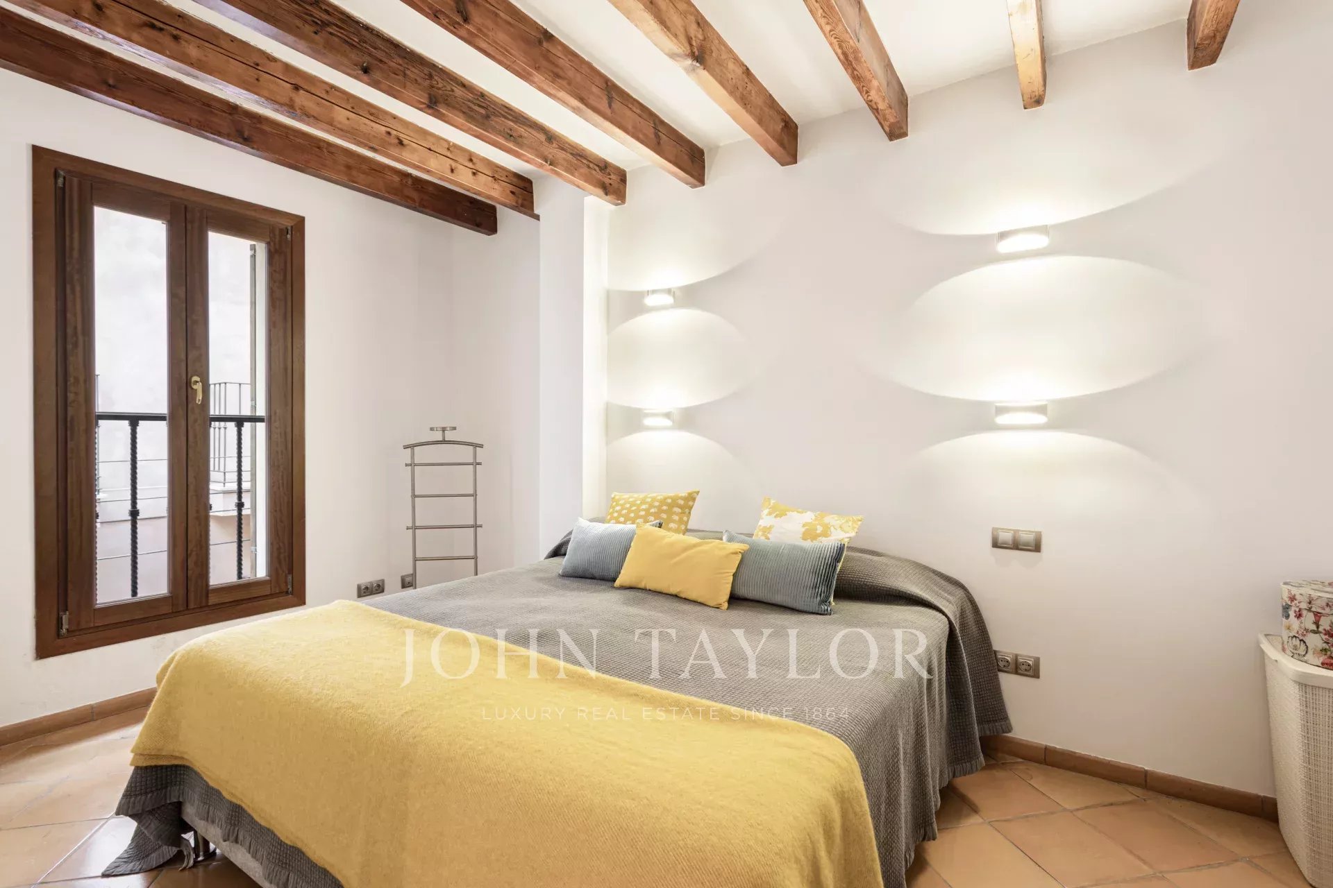 A propriedade faz parte de uma pequena comunidade de apenas duas unidades residenciais e um estabelecimento comercial, garantindo privacidade e exclusividade. Oferece também duas entradas independentes: uma através da escadaria comum e outra através de um acesso privado por elevador - uma caraterística rara e altamente desejável no centro histórico de Palma.