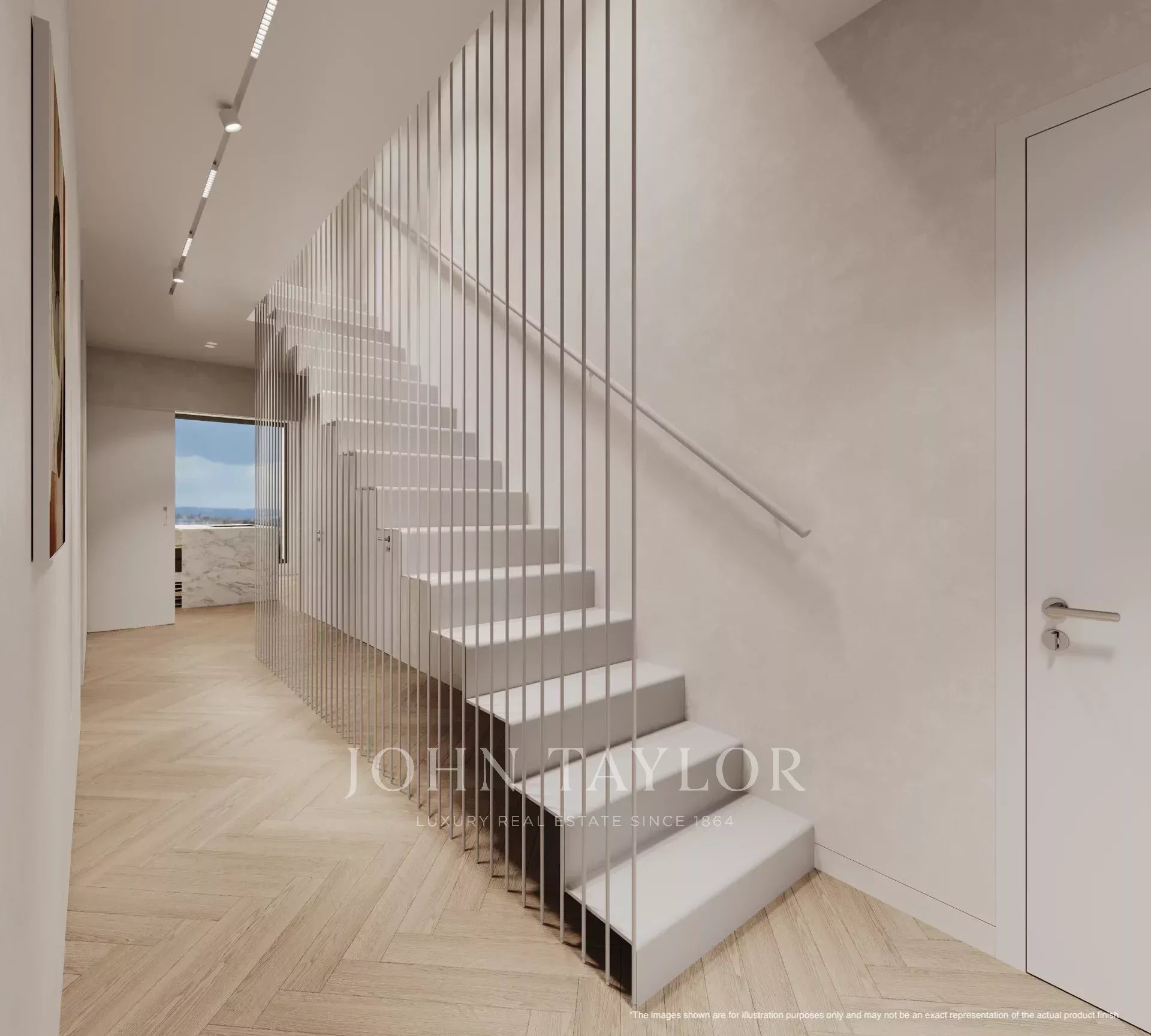 Esta penthouse no 4º andar oferece uma cozinha totalmente equipada em plano aberto, sala de jantar e sala de estar com 2 quartos e 2 casas de banho (1 ensuite). A escada interior leva-o até ao magnífico terraço de 103m² que oferece um amplo espaço para criar uma área exterior de estar, jantar e entretenimento. Com uma área de construção total de 270 m² e uma área de habitação interior de 98 m², espera-o um ambiente confortável e elegante. Existem três designs de interiores à escolha: Adagio, Arta e Raw.
