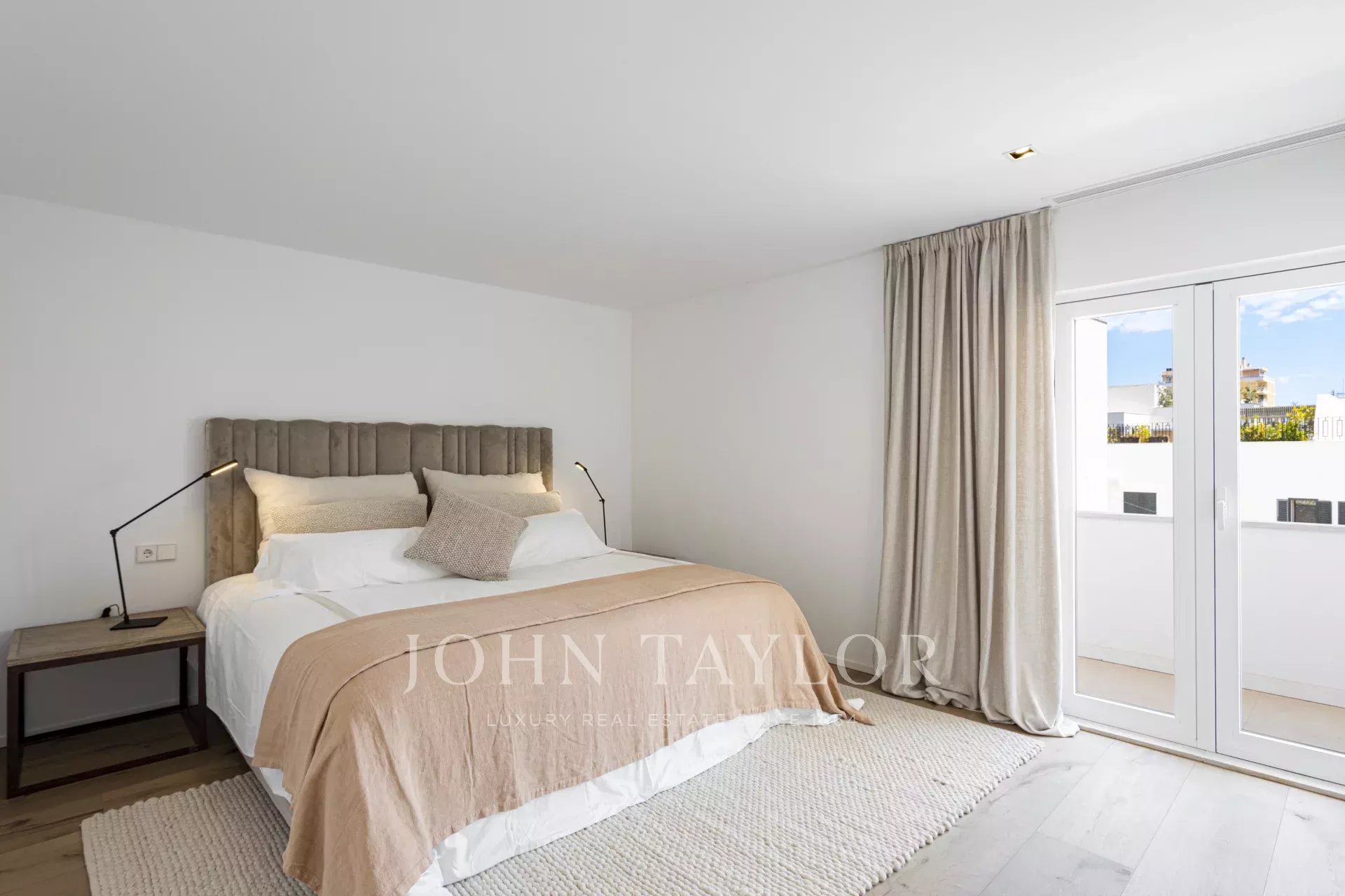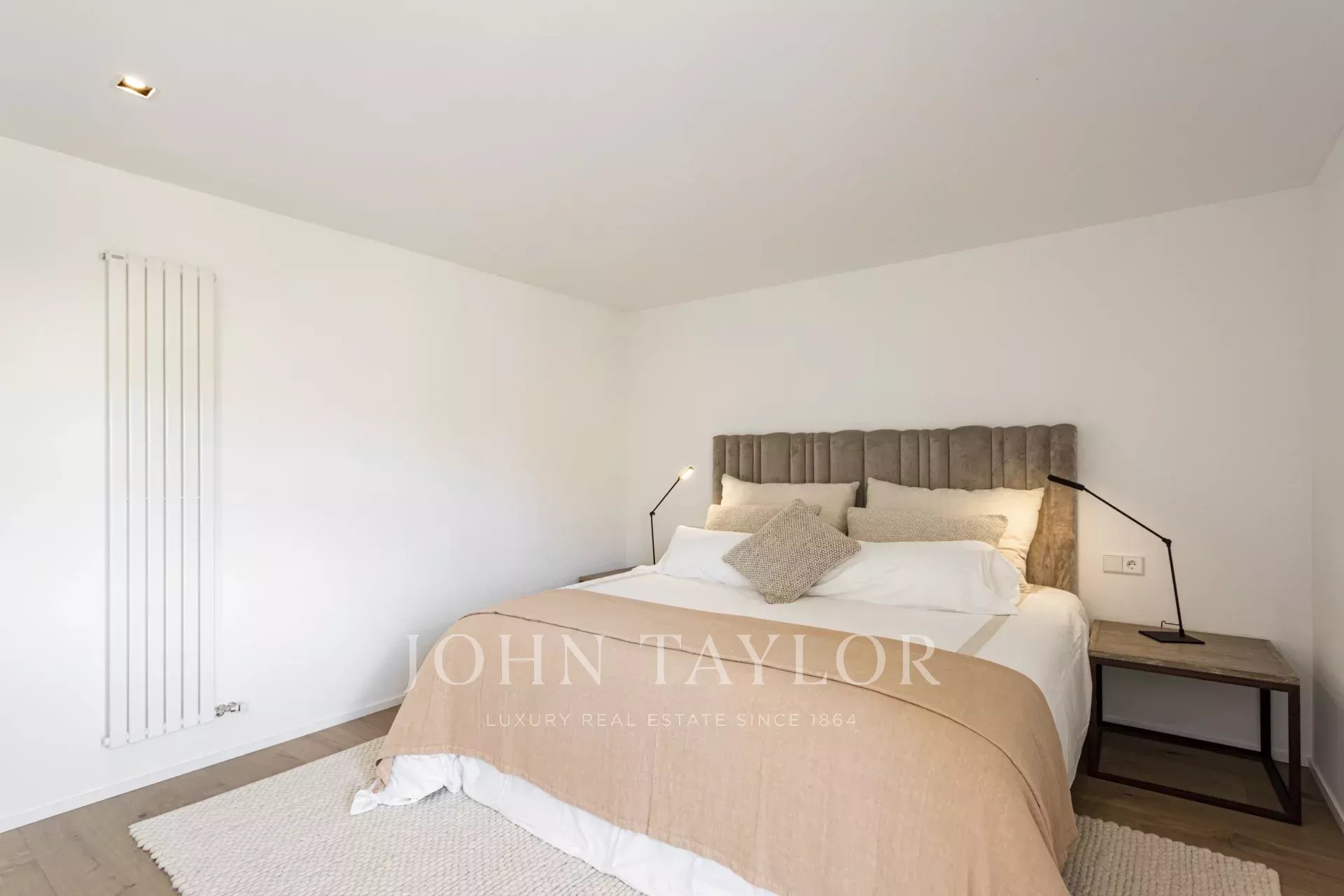 O apartamento tem dois quartos espaçosos, um deles com quarto de vestir e casa de banho privativa, oferecendo um espaço elegante e confortável. Existe ainda a possibilidade de criar um terceiro quarto, aproveitando o espaço junto à casa de banho social, o que valoriza ainda mais esta propriedade. O layout foi cuidadosamente concebido para maximizar cada metro quadrado: existem duas casas de banho completas, uma prática lavandaria separada e um lavabo social, todos com acabamentos de alta qualidade e detalhes modernos. Com tectos altos, decoração requintada e materiais selecionados com bom gosto, esta propriedade está totalmente mobilada e pronta a habitar.