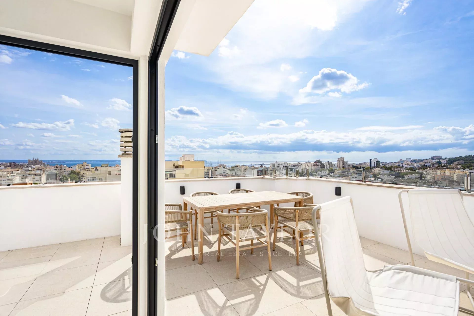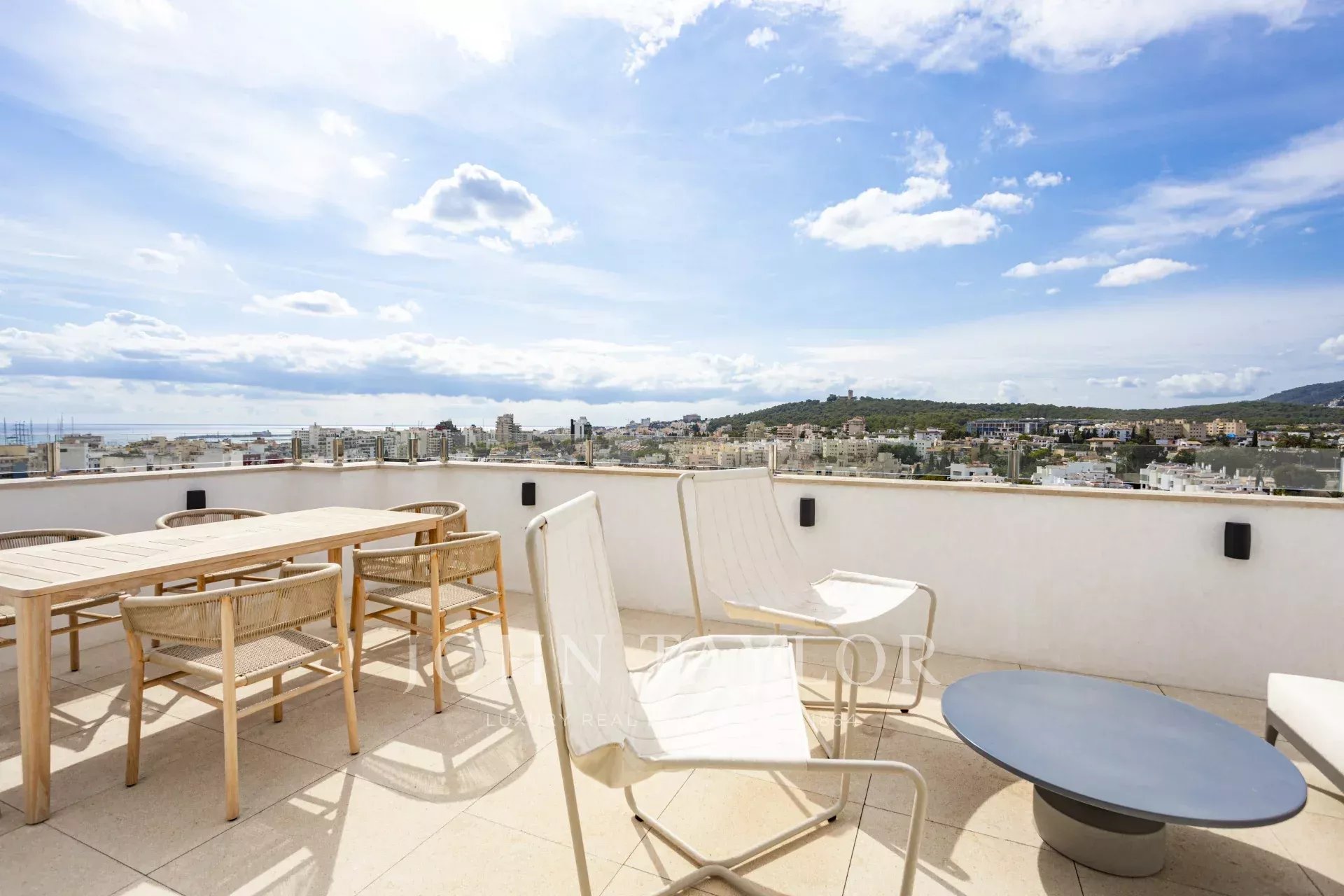 O telhado é o ponto alto desta propriedade excecional: um grande terraço com uma área de refeições e uma sala de estar com um sofá e poltronas, ideal para relaxar, receber convidados ou apreciar o magnífico pôr do sol sobre Palma e o Mar Mediterrâneo.