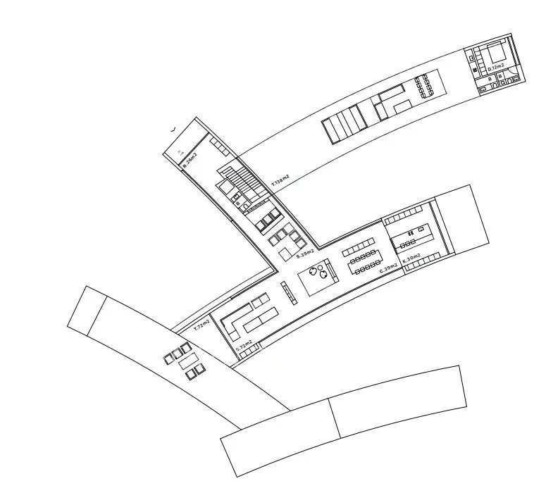 Um grande hall é o coração desta moradia. A zona principal alberga uma sala de jantar aberta para o jardim com vista para a piscina. Através de grandes janelas de vidro, as suas vistas proporcionam uma ligação integral ao conjunto. Um longo terraço coberto é gerado sob o piso superior, que se apoia apenas em dois pontos. No cruzamento com o volume do hall de entrada encontra-se o núcleo de comunicação e num dos extremos do lote uma compacta área de serviço.