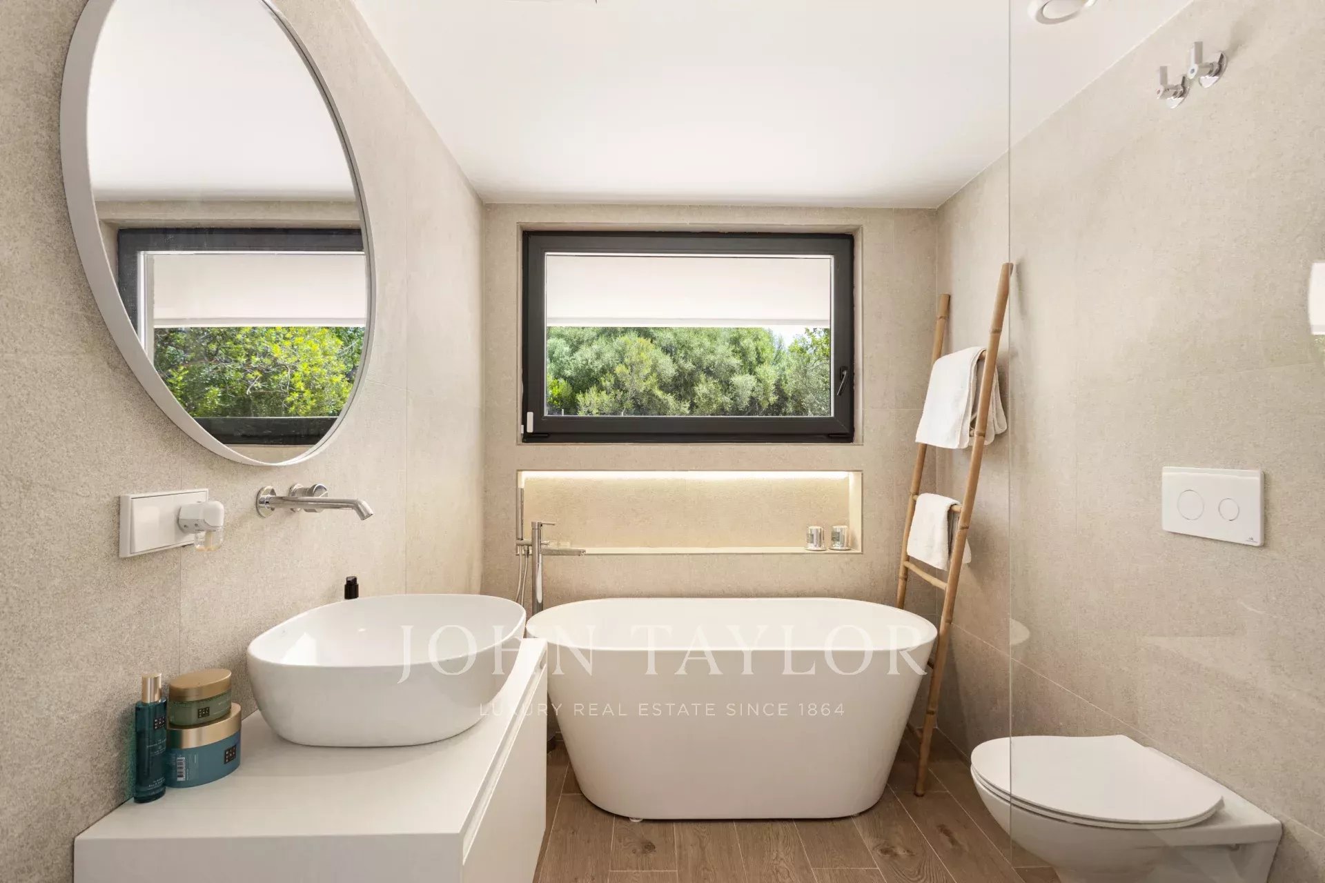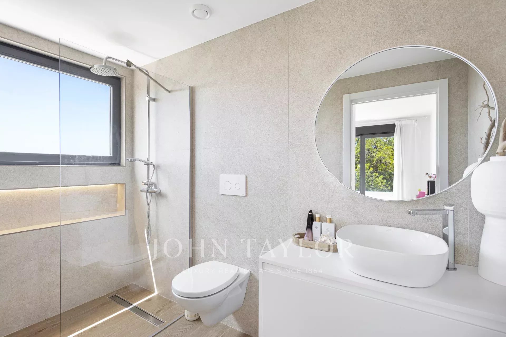 A casa principal oferece uma área de estar luminosa caracterizada pelo seu teto alto e grandes frentes de janelas, bem como 4 quartos duplos, incluindo uma suite principal com quarto de vestir e casa de banho privativa, e uma lavandaria. A propriedade tem um total de 6 casas de banho, três das quais em suite.