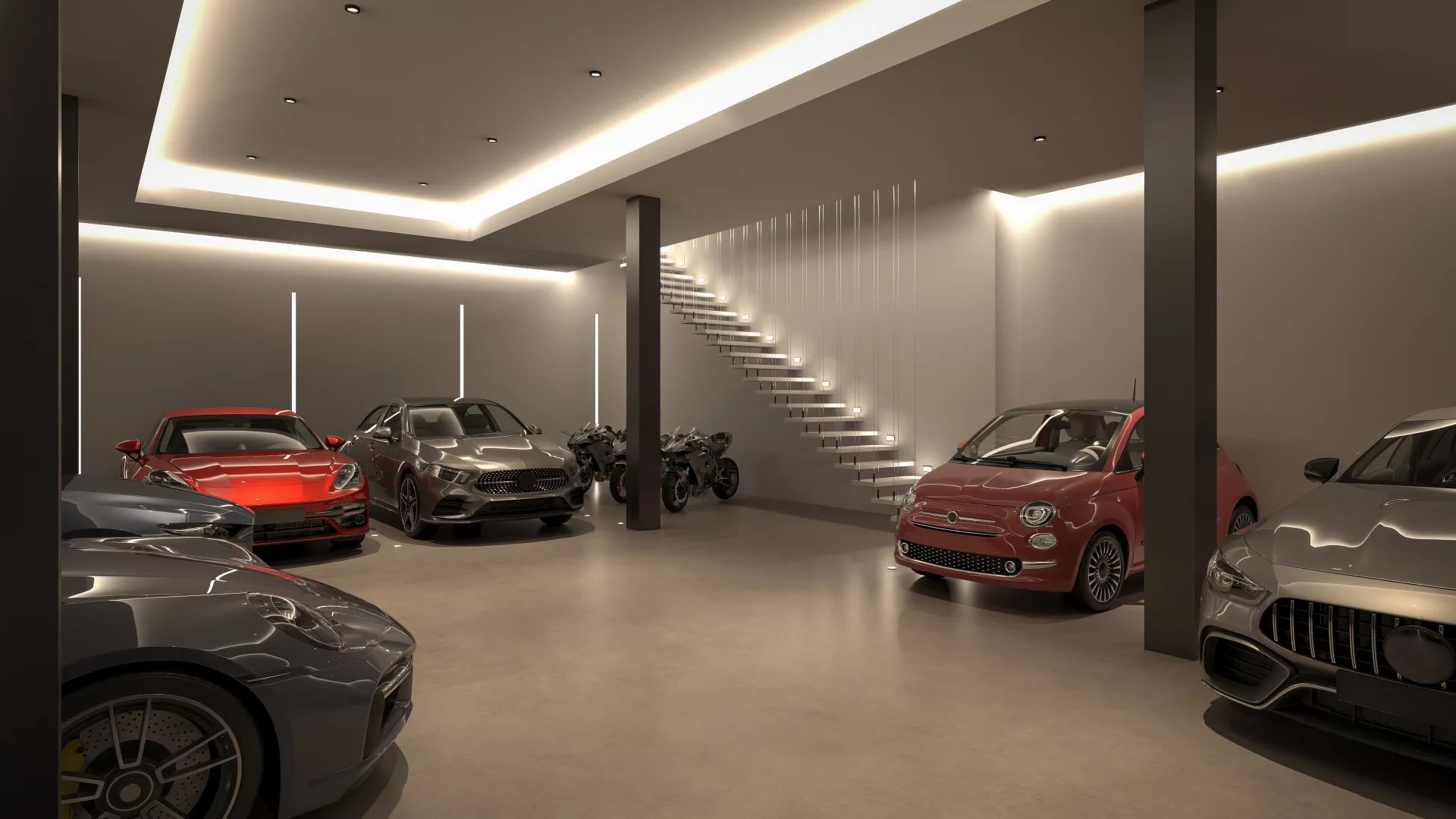 Para os entusiastas do motor ou para aqueles que procuram espaço extra, a moradia inclui uma garagem com capacidade para até 15 veículos - uma caraterística muito rara em propriedades residenciais de luxo.
