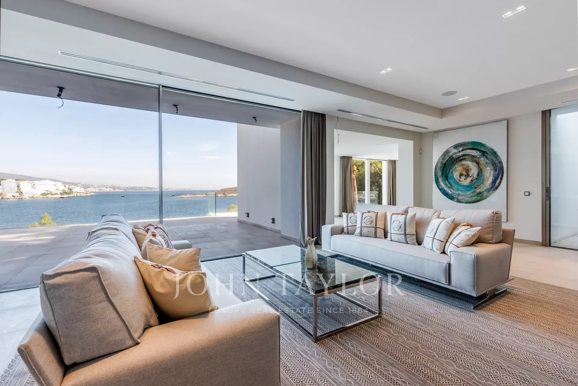 Oferecemos esta impressionante moradia com mais de 655 m2 de área de construção que está localizada em frente ao mar e permite acesso direto ao mar. A propriedade foi construída num terreno de 1321 m2 e é composta por três pisos ligados por escadas e um elevador. Foram utilizados materiais de alta qualidade, como madeira e pedra natural. Distribui-se por uma sala de estar espaçosa e luminosa com uma sala de jantar e acesso ao terraço com um fantástico espaço exterior, zona de chillout, cozinha de verão, jardim e a bela piscina infinita. Uma cozinha de luxo totalmente equipada, uma casa de banho, mais uma casa de banho para hóspedes, lavandaria e despensa. Depois, os 6 quartos, cada um com a sua própria casa de banho e quarto de vestir. A cave inclui um ginásio, uma sala de jogos e arrecadações.