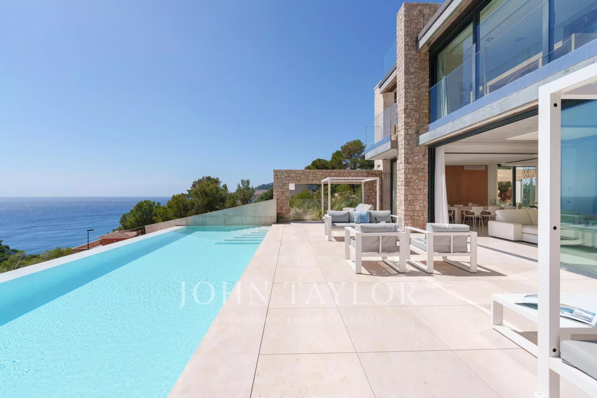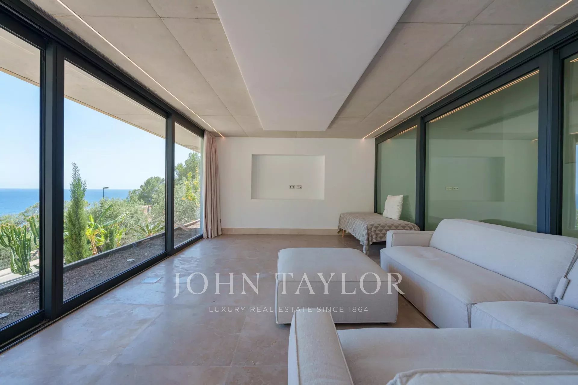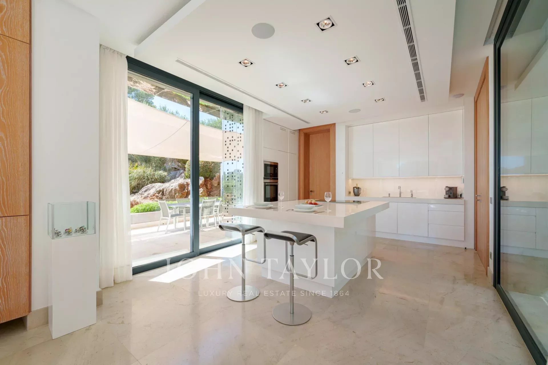 A propriedade destaca-se pelo seu impressionante design arquitetónico e fachada de vidro virada para o mar, garantindo o máximo de luz natural e vistas para o mar a partir de todas as divisões. Ao entrar na garagem privada, tem acesso aos pisos inferiores por elevador e por escadas. O segundo piso inclui três quartos, cada um com casa de banho privativa. O terceiro piso é inteiramente dedicado à vida quotidiana. A cozinha totalmente equipada e a sala de jantar fluem sem esforço para a sala de estar, que tem acesso direto ao salão exterior com uma lareira acolhedora, ao terraço e à área da piscina. O piso inferior inclui um cinema em casa e um ginásio privado. Construída apenas com materiais da mais alta qualidade, a moradia dispõe de ar condicionado central, piso radiante, um sistema de osmose e domótica.