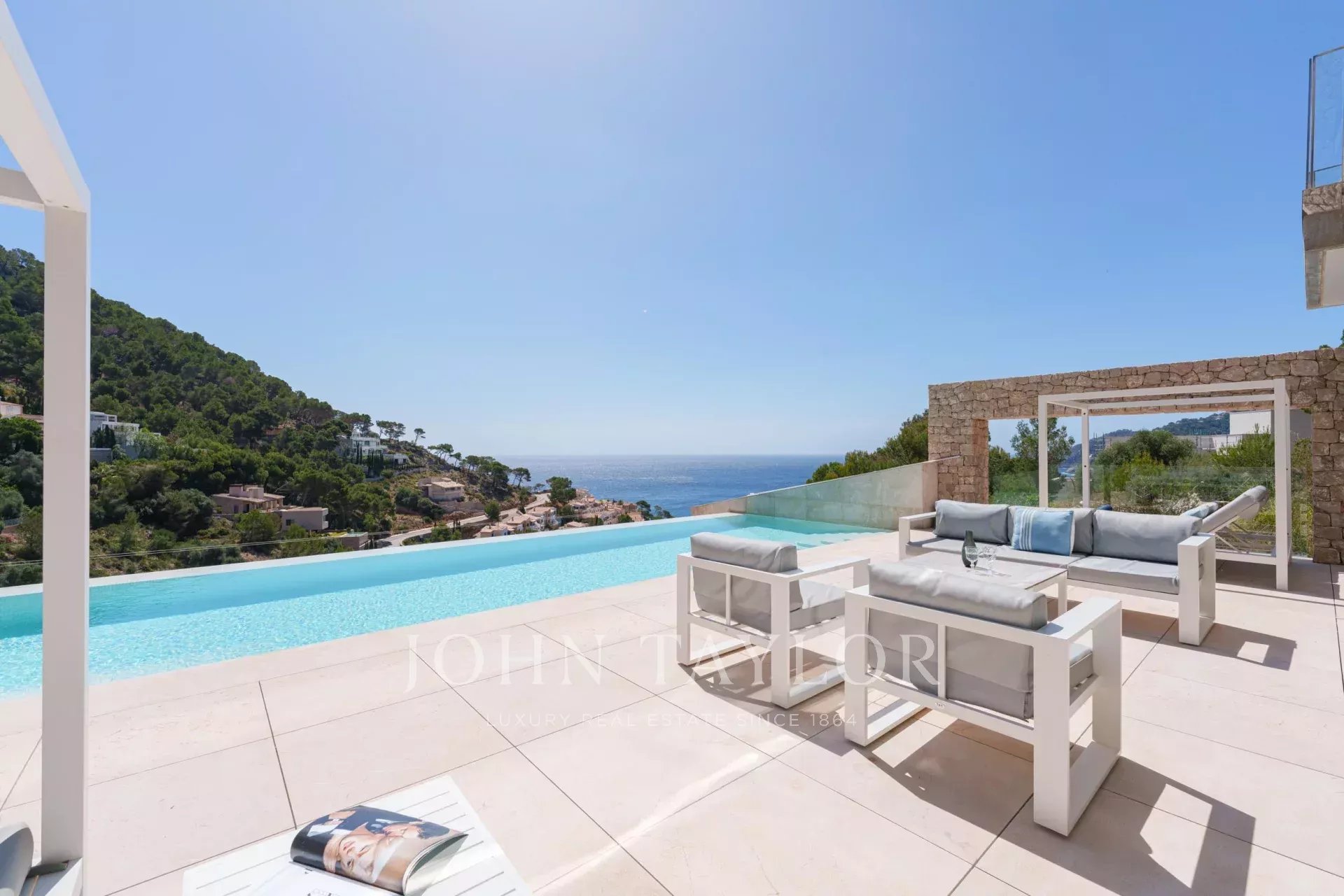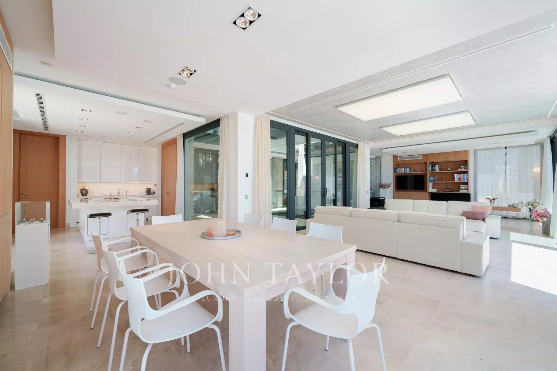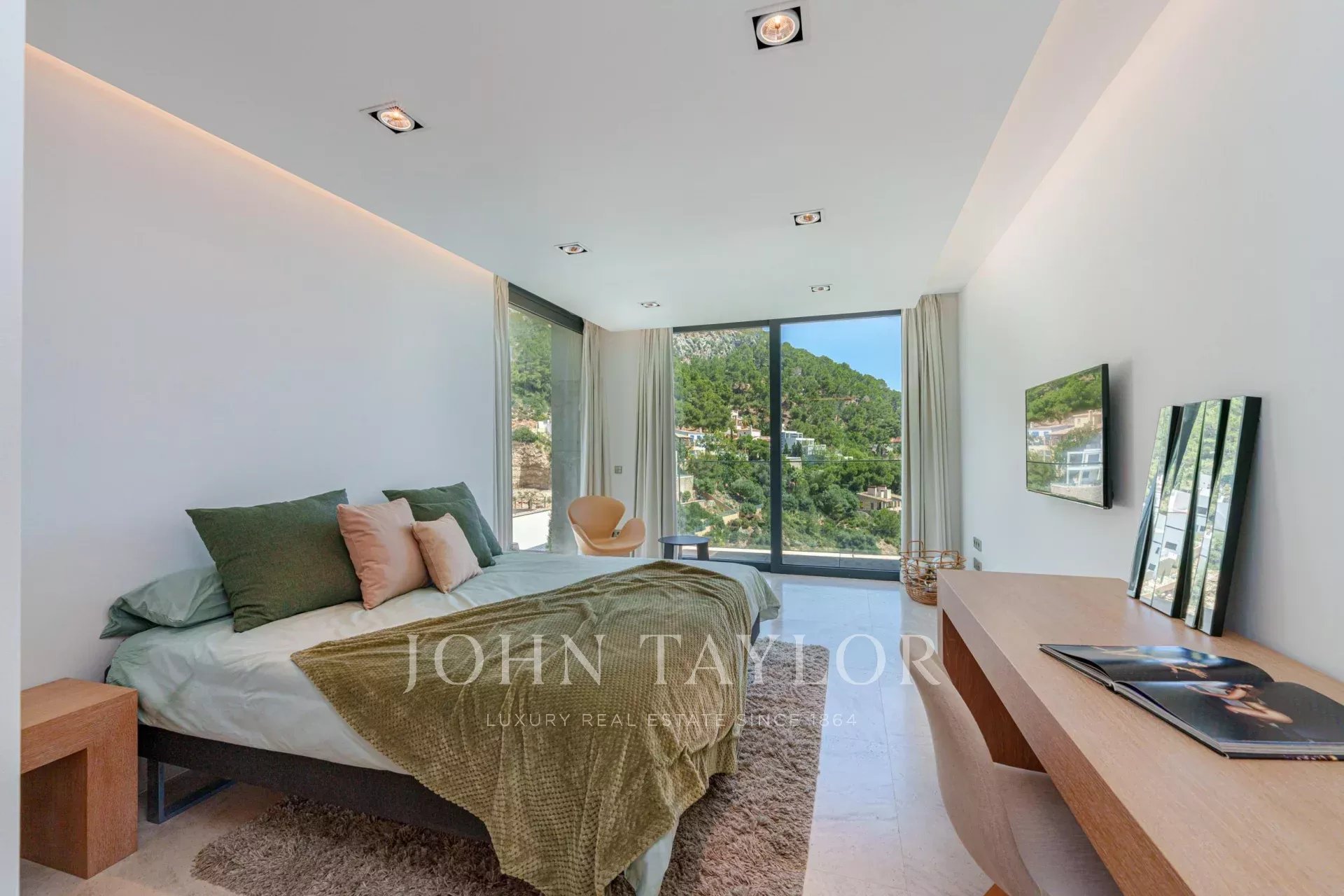 A propriedade destaca-se pelo seu impressionante design arquitetónico e fachada de vidro virada para o mar, garantindo o máximo de luz natural e vistas para o mar a partir de todas as divisões. Ao entrar na garagem privada, tem acesso aos pisos inferiores por elevador e por escadas. O segundo piso inclui três quartos, cada um com casa de banho privativa. O terceiro piso é inteiramente dedicado à vida quotidiana. A cozinha totalmente equipada e a sala de jantar fluem sem esforço para a sala de estar, que tem acesso direto ao salão exterior com uma lareira acolhedora, ao terraço e à área da piscina. O piso inferior inclui um cinema em casa e um ginásio privado. Construída apenas com materiais da mais alta qualidade, a moradia dispõe de ar condicionado central, piso radiante, um sistema de osmose e domótica.