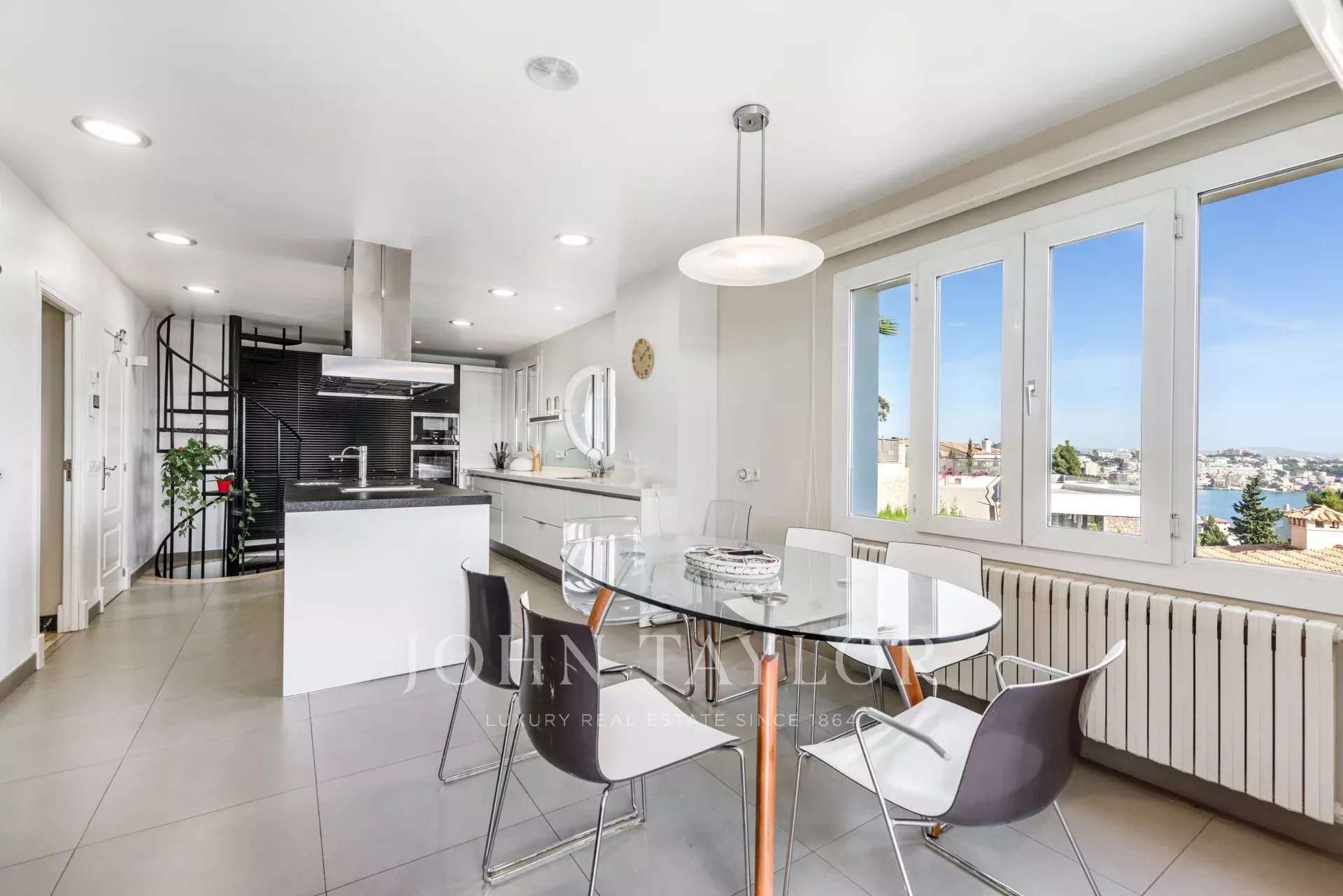 Moradia de luxo com vista para o mar e licença de aluguer em Cas Catalá. Esta casa com arquitetura original e tectos altos está situada numa localização maravilhosa na parte superior da tranquila área residencial de Cas Catalá. Graças à sua posição elevada, quase todas as divisões da casa desfrutam de vistas fabulosas sobre a Baía de Palma.