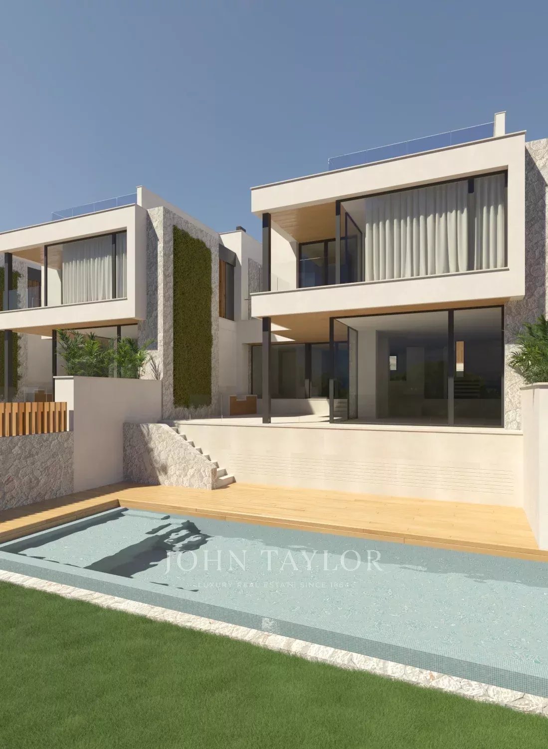 Cada uma das quatro moradias tem uma área generosa de 300 metros quadrados, com quatro quartos no piso superior, cada um com uma casa de banho privativa e roupeiros embutidos. No rés do chão, a distribuição em plano aberto da cozinha e da sala de jantar com a sala de estar num nível dividido liga-se perfeitamente ao terraço generoso e íntimo, perfeito para entretenimento. O design moderno de inspiração mediterrânica é ainda reforçado por uma fachada em pedra, um jardim vertical e carpintarias delicadas, tudo isto contribuindo para a sensação de alta qualidade destas novas casas.