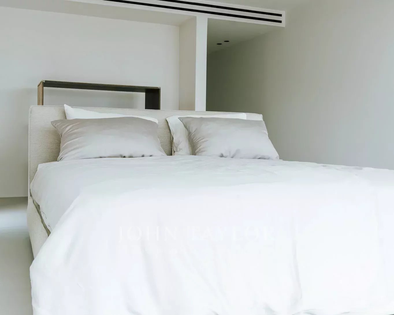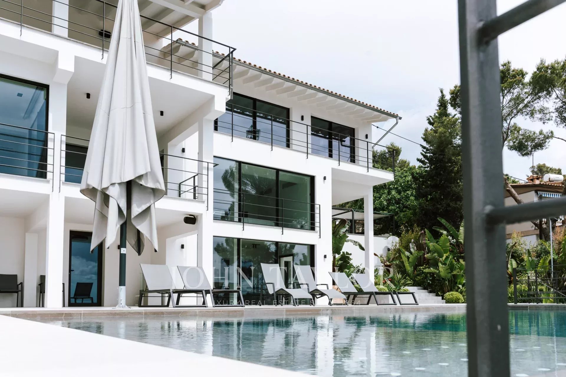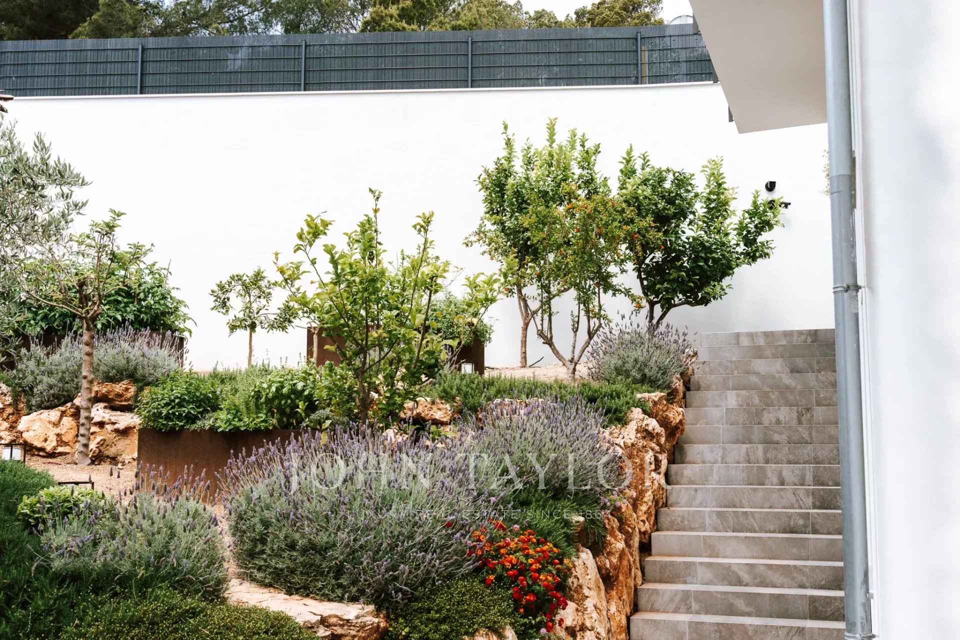 Uma escada conduz aos quartos. Neste nível, com vistas sensacionais para o mar e com vista para o pátio, existem três quartos. Um deles encontra-se num grande apartamento de hóspedes com acesso próprio e quarto de vestir. O apartamento de hóspedes está ligado ao quarto principal através de um terraço. O quarto principal tem o seu próprio quarto de vestir e uma luxuosa casa de banho privativa. Ao lado do quarto principal encontra-se o terceiro quarto. A partir do pátio, duas escadas (de cada lado da casa) conduzem à área da piscina com terraço, onde se pode admirar o jardim de ervas e plantas mediterrânicas.