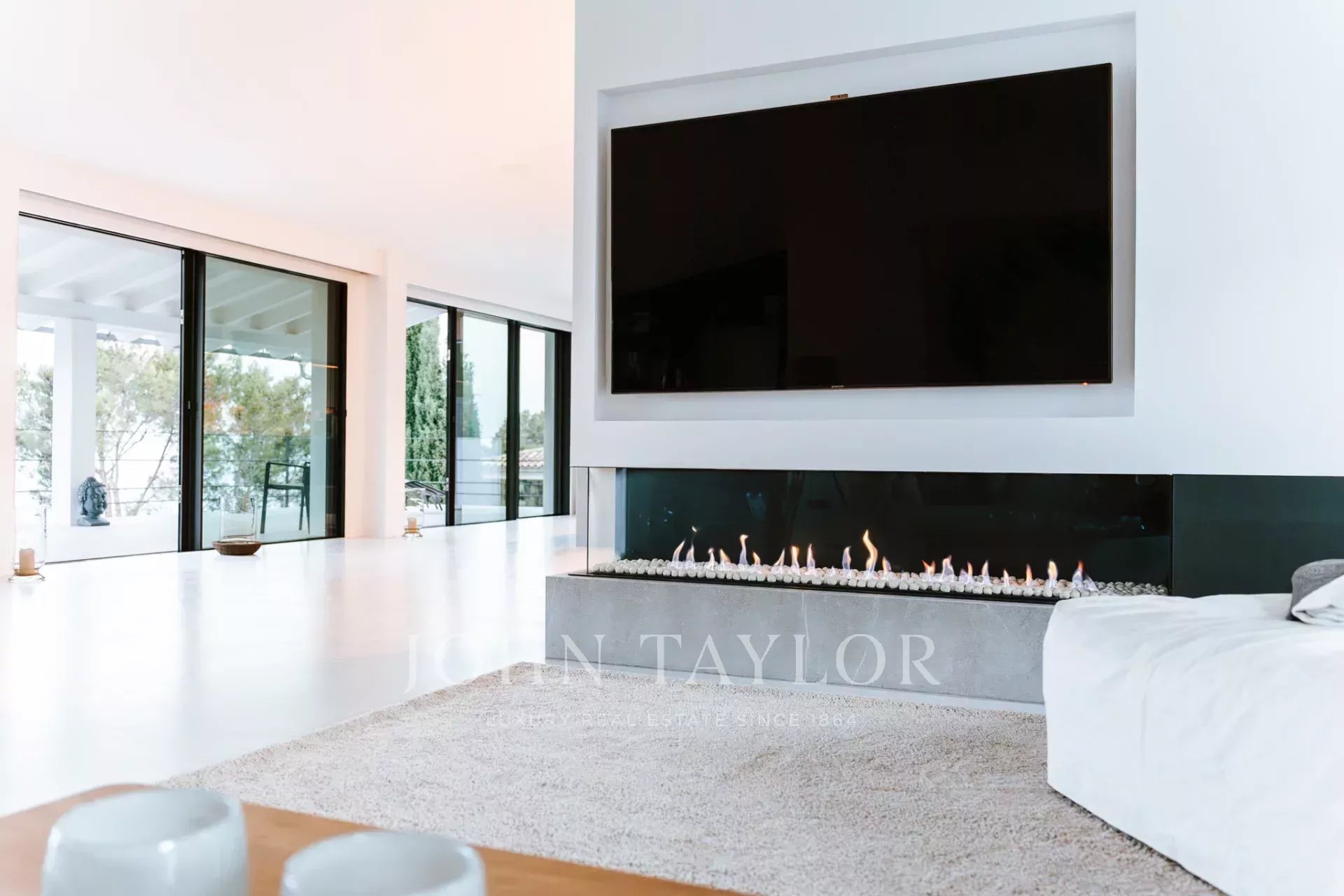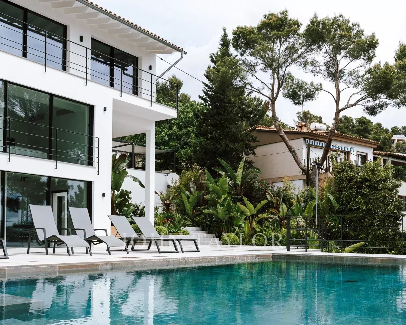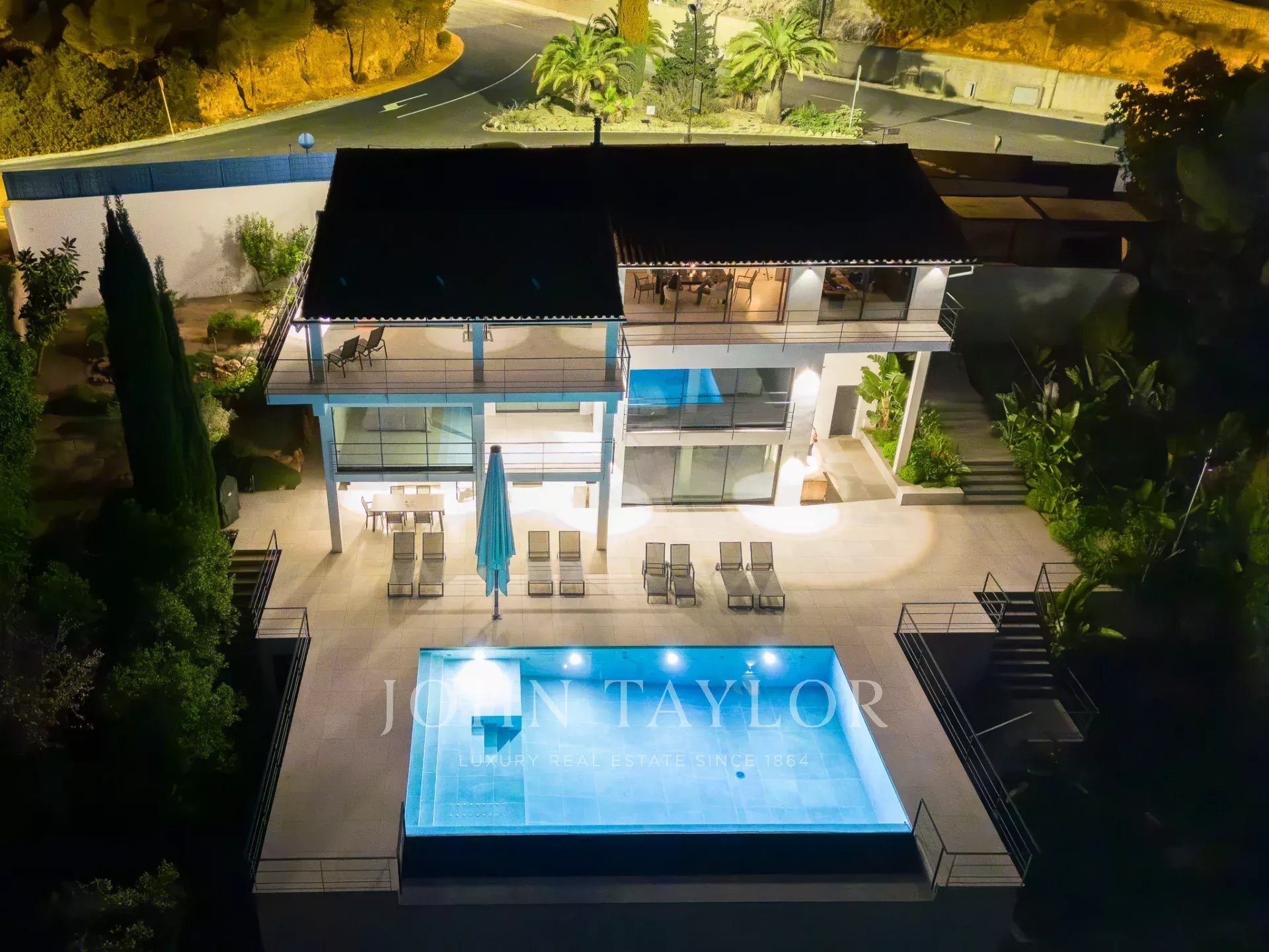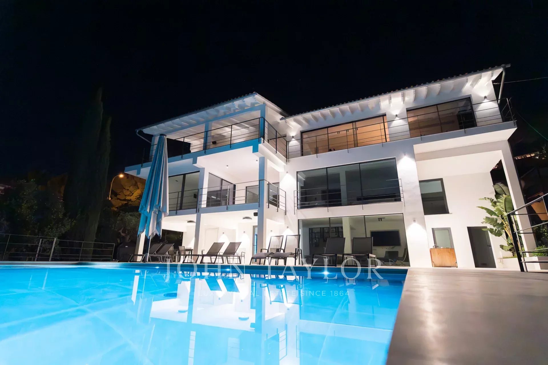 Uma escada conduz aos quartos. Neste nível, com vistas sensacionais para o mar e com vista para o pátio, existem três quartos. Um deles encontra-se num grande apartamento de hóspedes com acesso próprio e quarto de vestir. O apartamento de hóspedes está ligado ao quarto principal através de um terraço. O quarto principal tem o seu próprio quarto de vestir e uma luxuosa casa de banho privativa. Ao lado do quarto principal encontra-se o terceiro quarto. A partir do pátio, duas escadas (de cada lado da casa) conduzem à área da piscina com terraço, onde se pode admirar o jardim de ervas e plantas mediterrânicas.
