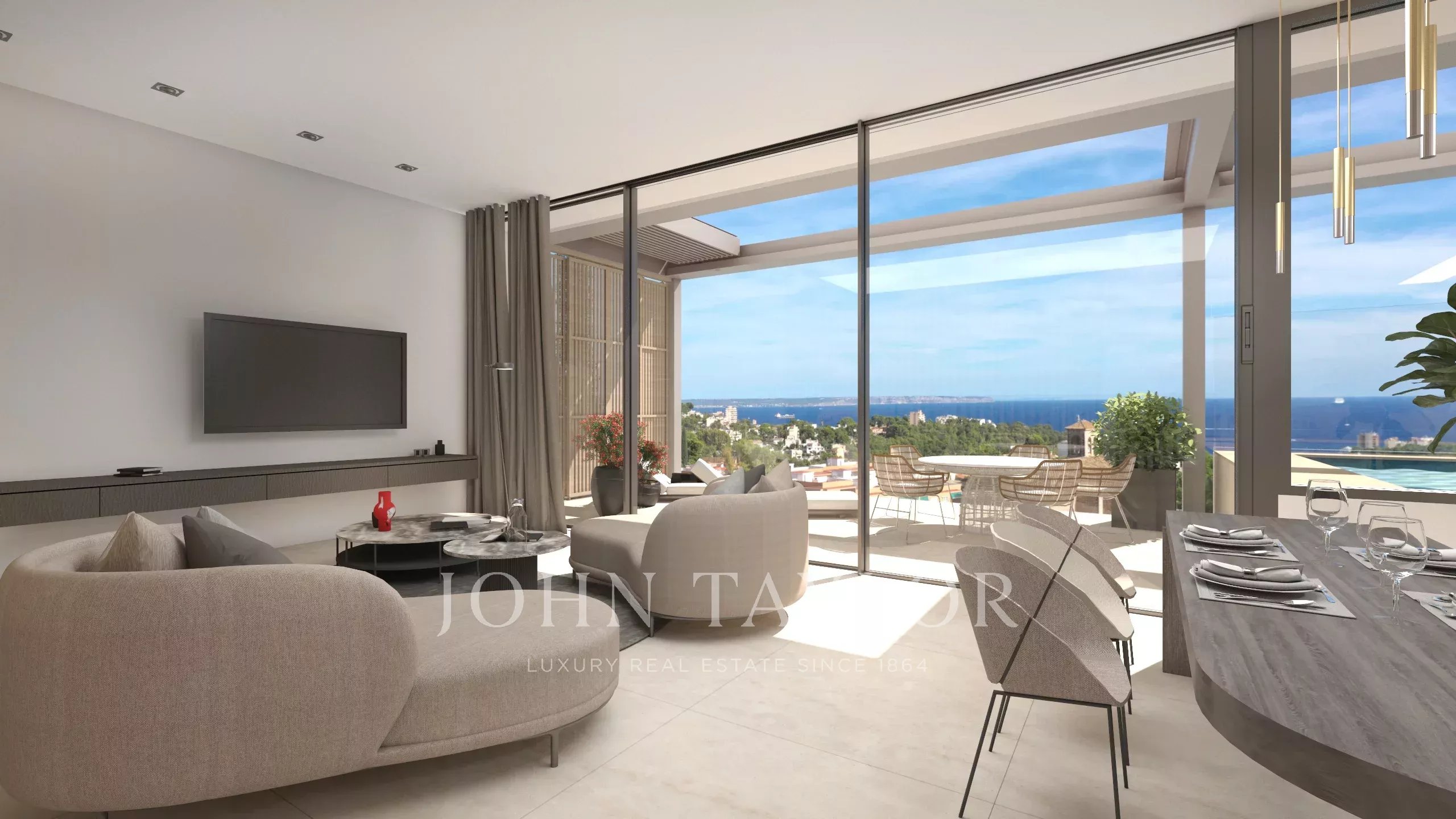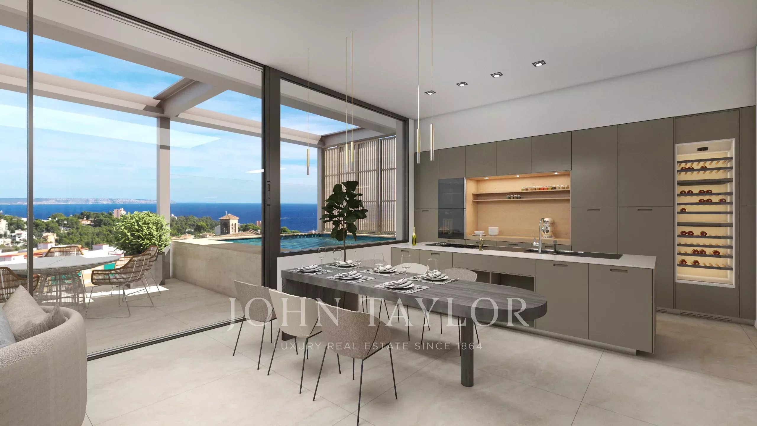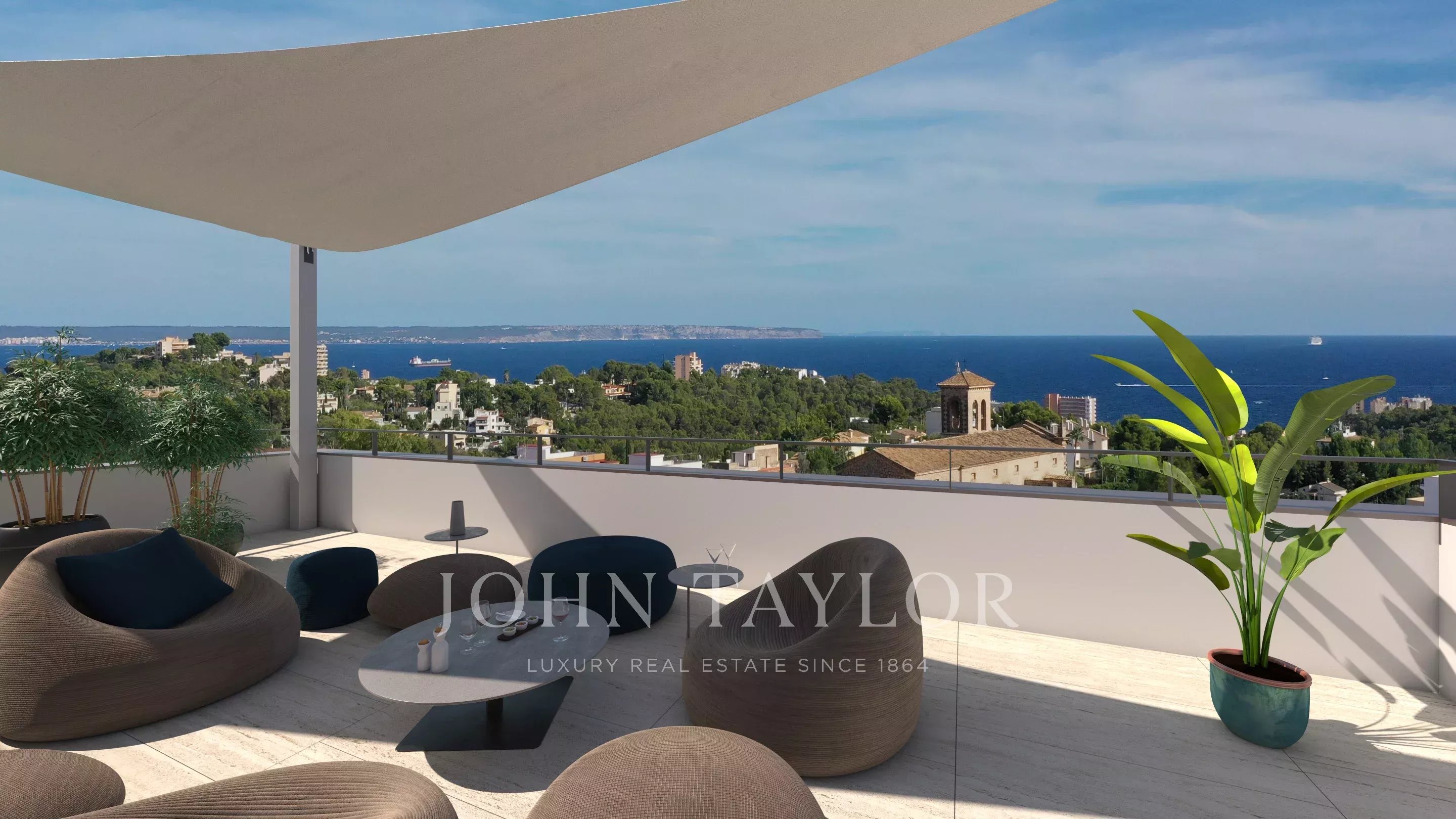 Uma das caraterísticas mais notáveis da moradia é o seu espetacular terraço no telhado, que oferece total privacidade e vistas ininterruptas sobre a baía. Este espaço exterior excecional proporciona o cenário perfeito para relaxar, divertir-se ou simplesmente desfrutar da luz e da atmosfera únicas que definem a vida em Maiorca.