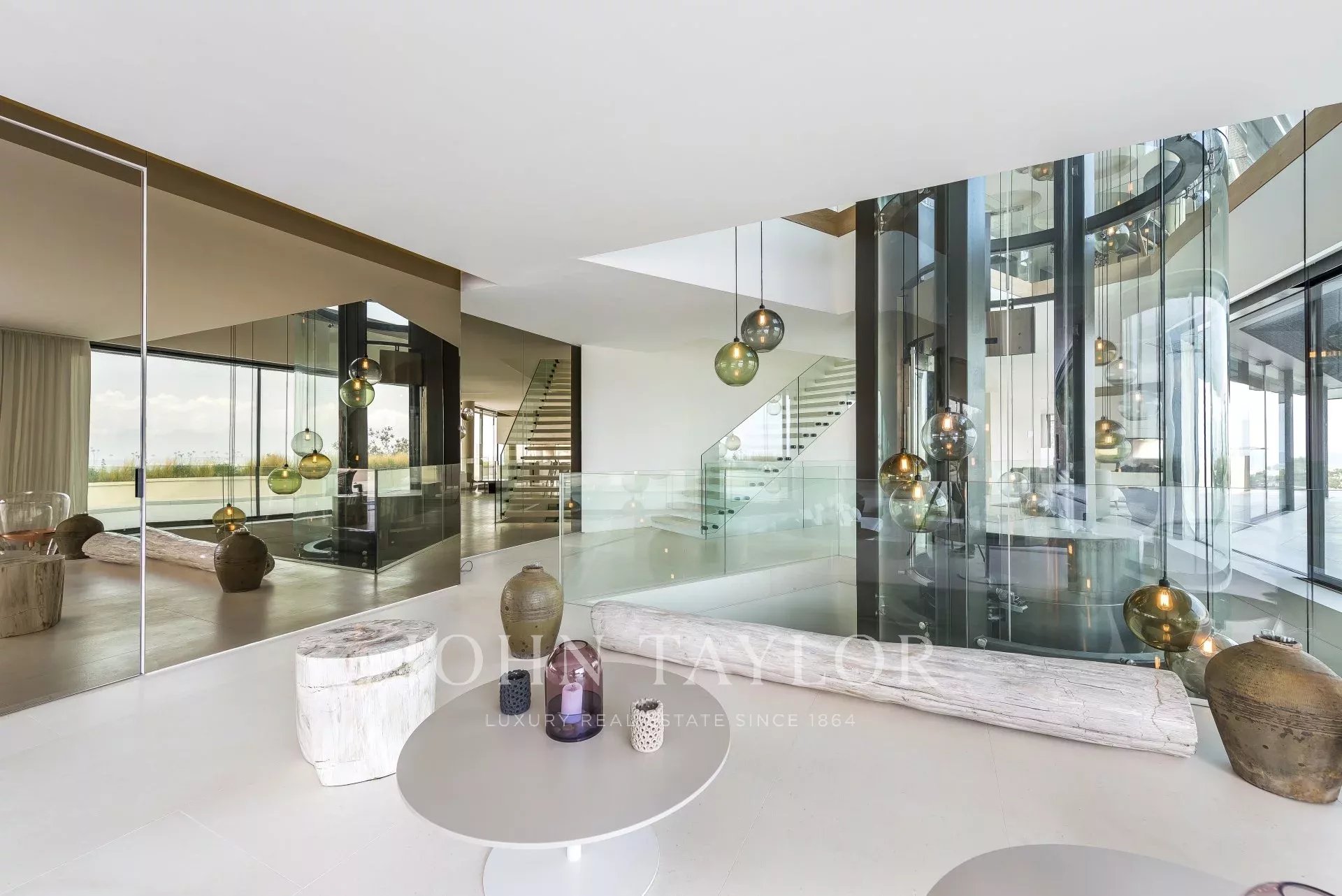Uma fachada de vidro transparente no rés do chão permite que a enorme sala de estar se abra e se estenda para o jardim, duplicando o espaço de vida no verão. O terraço infinito está rodeado pela paisagem natural e convida-o a assistir a um pôr do sol inesquecível. O desejo de trazer a paisagem mediterrânica para dentro do edifício melhora a ligação entre o interior e o jardim. As áreas de estar exteriores tornam-se uma continuação da sala de estar.