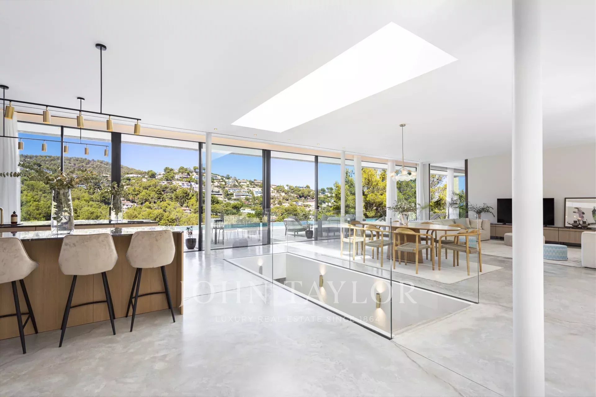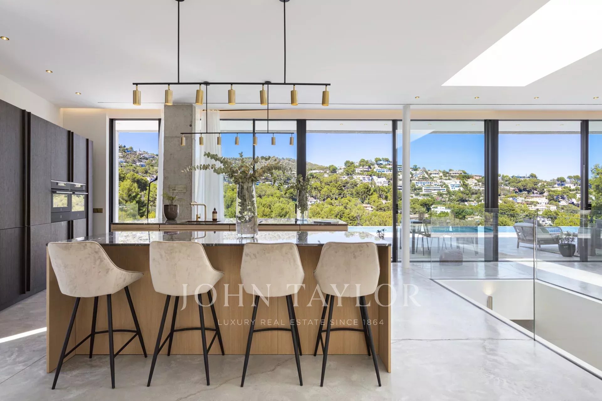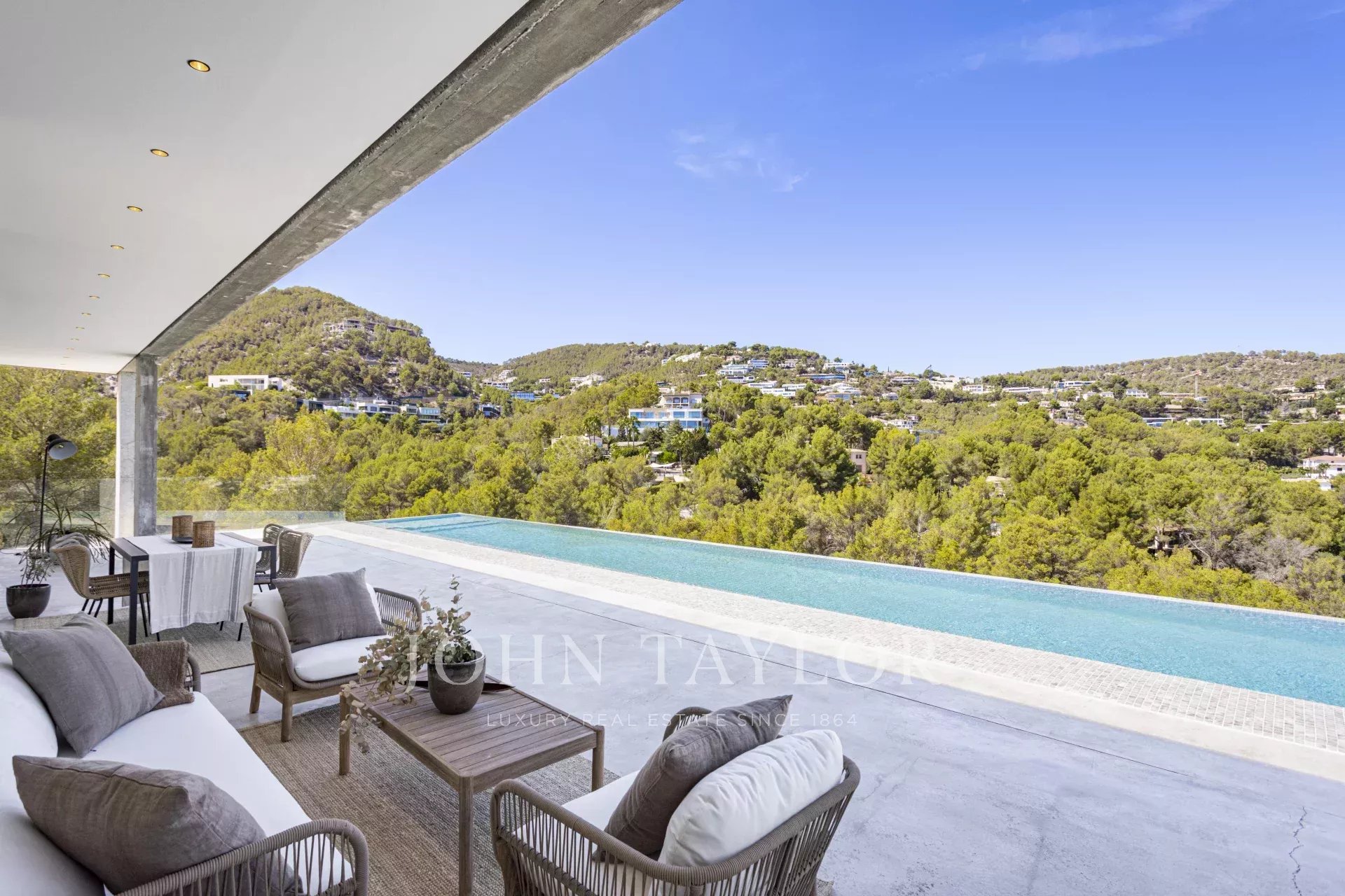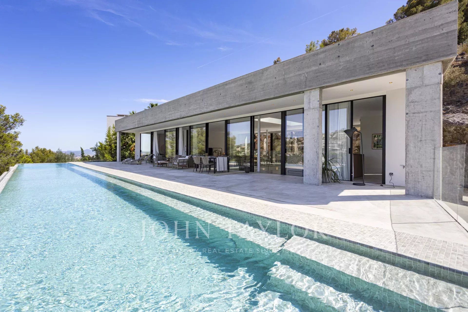 Espetacular moradia recentemente construída na zona exclusiva de Son Vida. Com um design arquitetónico marcante em betão exposto, esta propriedade de dois andares oferece uma espaçosa área de estar interior de 455 m2, com a excitante possibilidade de adicionar mais 383 m2. Um oásis de tranquilidade e luxo situado em 2.635 m2 de terreno, com belas vistas sobre o campo de golfe, a cidade de Palma e o Mar Mediterrâneo. O design desta moradia é o resultado de uma fusão perfeita entre elegância moderna, conforto e funcionalidade. O betão aparente confere uma estética única e arrojada, realçando a personalidade vanguardista da propriedade. As janelas do chão ao teto e os espaços abertos garantem uma abundância de luz natural, criando uma atmosfera luminosa e acolhedora em todos os cantos da propriedade. A área exterior é simplesmente de cortar a respiração. Desfrute de momentos de descontração e lazer no alpendre de 68 m2, ideal para reuniões sociais ou para desfrutar das noites quentes de Maiorca. O extenso terraço de 120 m2 oferece um espaço perfeito para apanhar banhos de sol e desfrutar das vistas panorâmicas que a propriedade tem para oferecer. Uma joia por si só, a piscina de 28 metros convida-o a desfrutar de mergulhos refrescantes enquanto contempla a beleza dos arredores. Com grande privacidade, esta área da propriedade torna-se num oásis para relaxar e desfrutar de momentos inesquecíveis. Para além disso, esta moradia dispõe de uma zona de spa, onde se pode mimar com várias opções de relaxamento e bem-estar. A disposição interior foi meticulosamente pensada para oferecer um espaço funcional e confortável. Com quatro quartos espaçosos, cada um com a sua própria casa de banho privativa, a villa proporciona um ambiente íntimo e agradável aos seus residentes. A suite principal cria um ambiente de sonho para relaxar e desfrutar da privacidade. As áreas comuns não ficam muito atrás. A sala de estar e a sala de jantar entrelaçam-se na perfeição, criando um espaço acolhedor e amplo para partilhar momentos em família ou com amigos. Para além disso, a cozinha, de design moderno e equipada com as mais recentes comodidades, é o local perfeito para dar largas à sua criatividade culinária. Em suma, esta moradia recém-construída em Son Vida é uma verdadeira obra-prima da arquitetura moderna, combinando um design deslumbrante com o conforto de um lar.