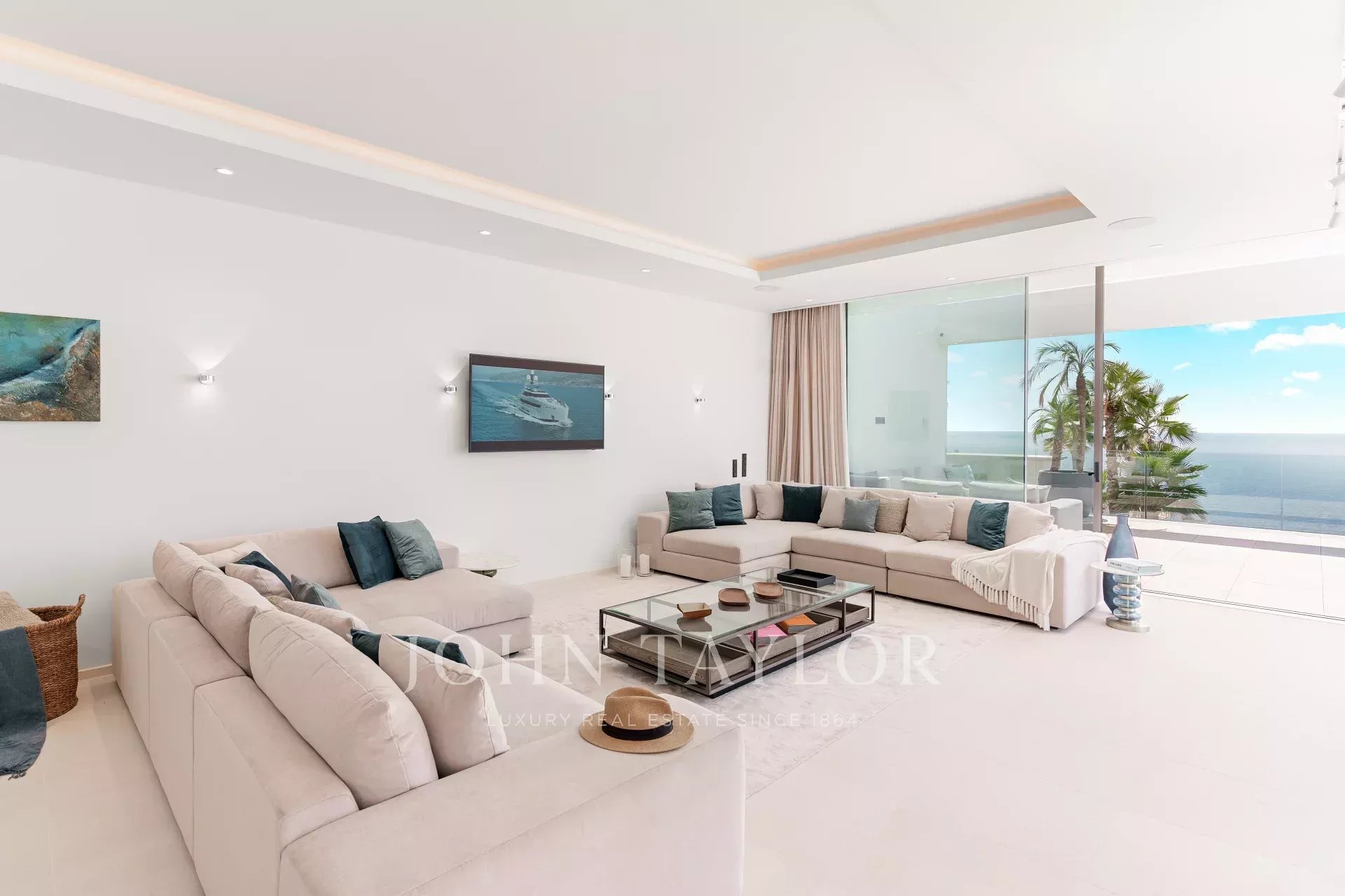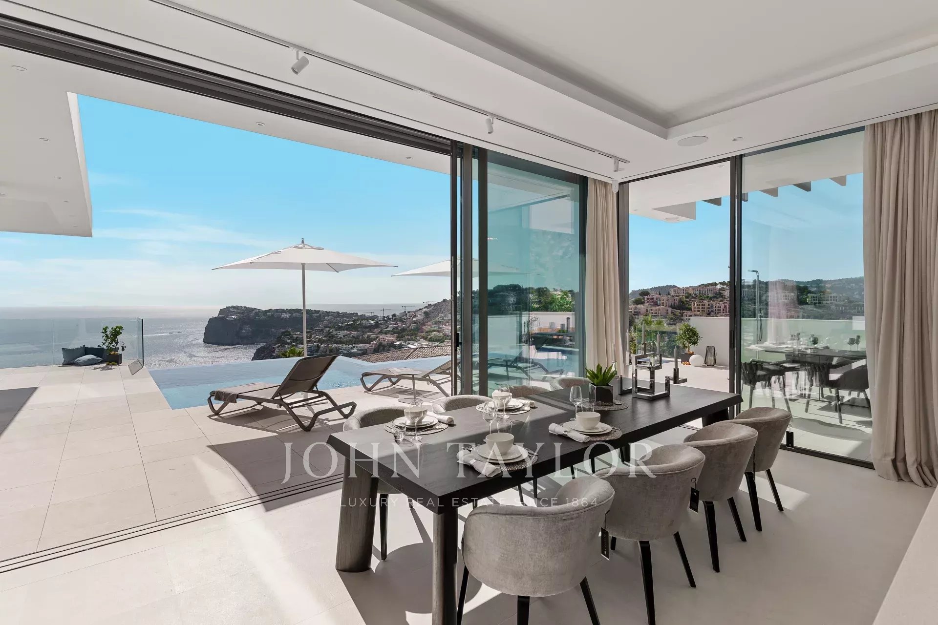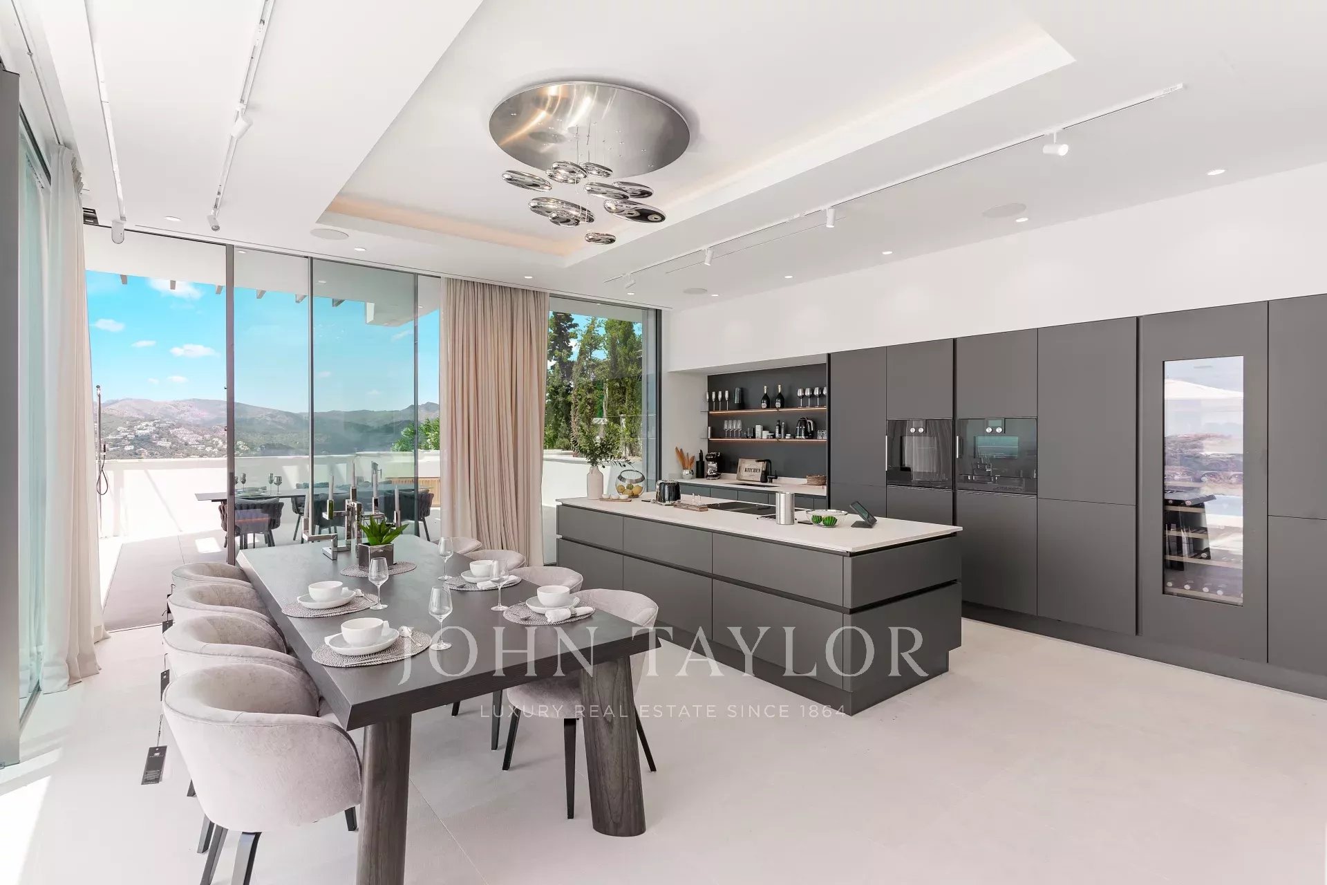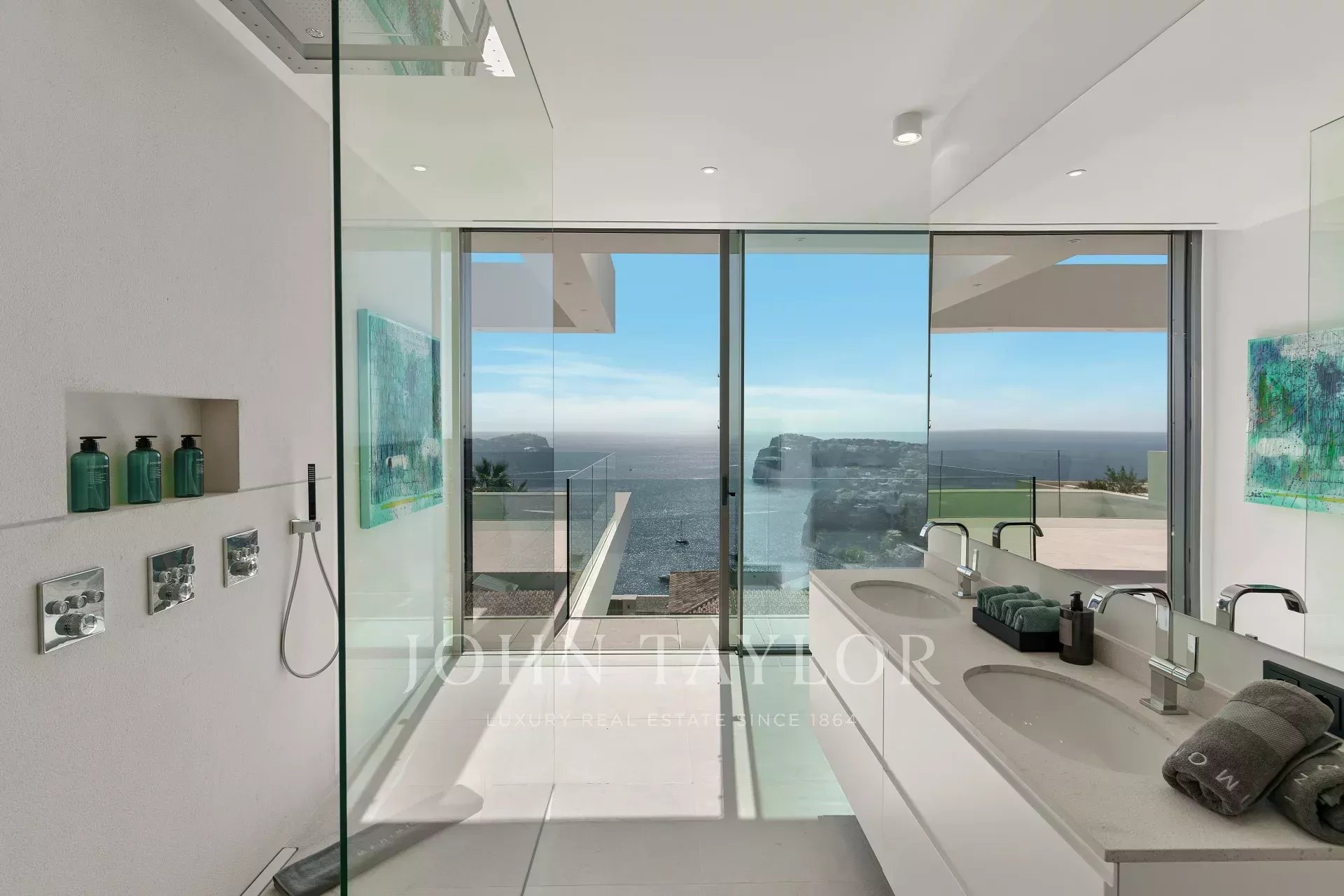 Com uma localização excecional no topo de Cala Llamp, esta impressionante e moderna villa funde-se harmoniosamente na encosta da montanha e oferece vistas únicas e deslumbrantes sobre o mar. A vista estende-se desde a espetacular baía com as suas maravilhosas águas azuis até à península de La Mola e ao mar aberto ao fundo. A moradia oferece um luxo generoso, com 6 lugares de estacionamento subterrâneos e 6 quartos numa área habitacional de 691 metros quadrados, implantada num terreno de 1.038 metros quadrados. A arquitetura impressionante combina estruturas em consola com frescos rebocados a branco e uma fachada de vidro minimalista perfeitamente trabalhada. O edifício integra-se perfeitamente na envolvente natural graças à combinação clássica de pedra calcária e paredes de pedra natural maiorquina, muito bem trabalhadas. No fascinante design interior, foram utilizados os melhores materiais naturais para criar um equilíbrio perfeito entre luz e sombra, garantindo uma atmosfera confortável e agradável. A moradia foi concebida com grande atenção aos pormenores para maximizar as deslumbrantes vistas panorâmicas das principais divisões e terraços. Devido à sua orientação a sudoeste, a moradia goza de sol durante todo o dia e oferece os mais incríveis pores-do-sol, onde se pode ver a silhueta da ilha vizinha de Ibiza. A orientação cuidadosa do edifício, a elevação, a distribuição estudada e a integração na paisagem criam um ambiente perfeito para desfrutar do Mediterrâneo e da privacidade absoluta ao mesmo tempo. A propriedade tem uma excelente localização com vista para a baía de Cala Llamp, oferecendo paz, tranquilidade, segurança e privacidade neste cenário exclusivo. O popular Gran Folies Beach Club fica apenas a alguns minutos a pé e, nas imediações, existem inúmeros cafés e restaurantes interessantes e de alta qualidade no porto e na marina. Descubra o extraordinário estilo de vida desta requintada moradia. Por favor, contacte-nos para mais informações e para marcar uma visita.