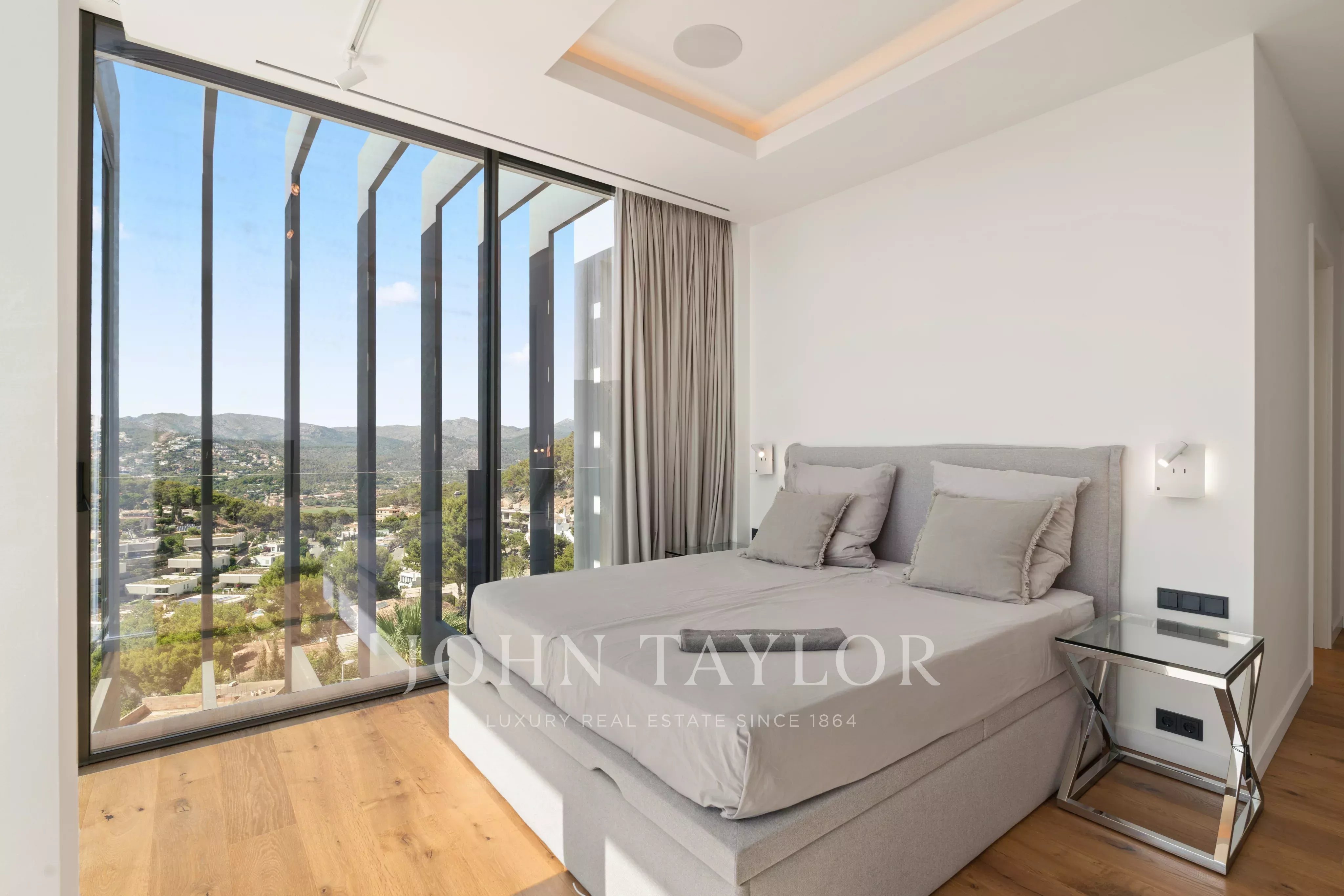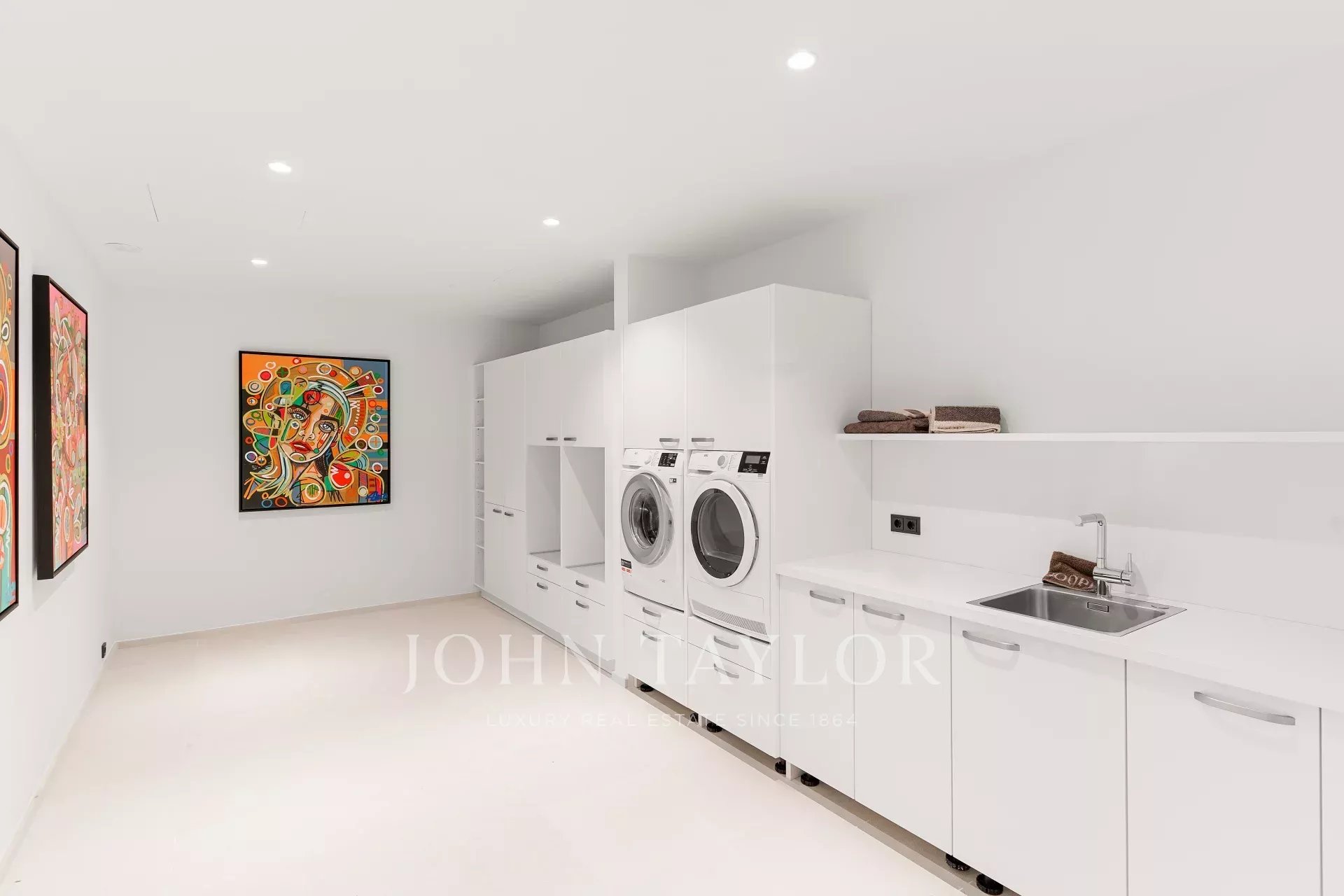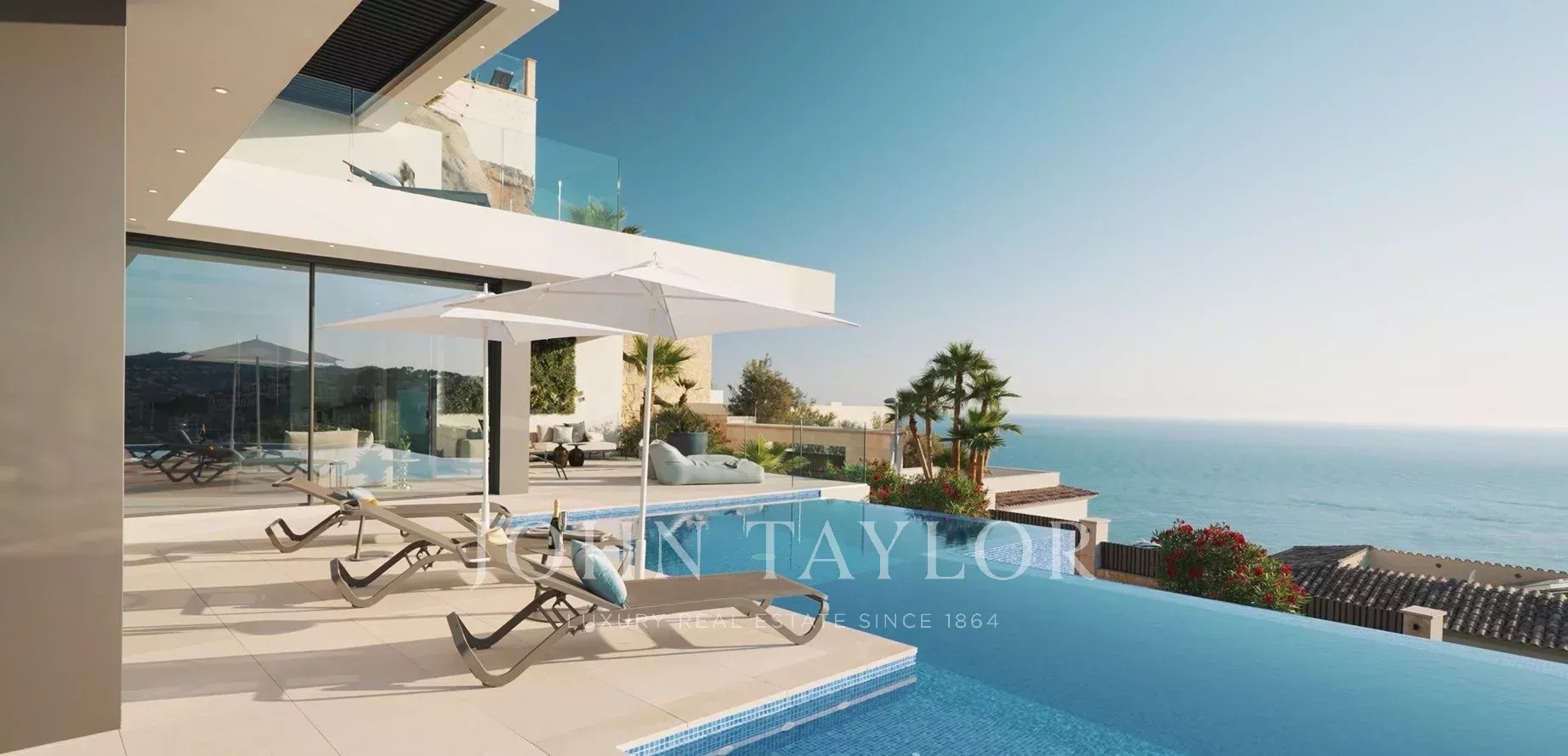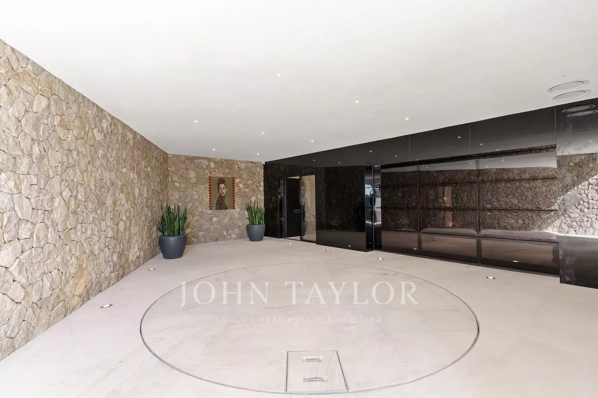 Com uma localização excecional no topo de Cala Llamp, esta impressionante e moderna villa funde-se harmoniosamente na encosta da montanha e oferece vistas únicas e deslumbrantes sobre o mar. A vista estende-se desde a espetacular baía com as suas maravilhosas águas azuis até à península de La Mola e ao mar aberto ao fundo. A moradia oferece um luxo generoso, com 6 lugares de estacionamento subterrâneos e 6 quartos numa área habitacional de 691 metros quadrados, implantada num terreno de 1.038 metros quadrados. A arquitetura impressionante combina estruturas em consola com frescos rebocados a branco e uma fachada de vidro minimalista perfeitamente trabalhada. O edifício integra-se perfeitamente na envolvente natural graças à combinação clássica de pedra calcária e paredes de pedra natural maiorquina, muito bem trabalhadas. No fascinante design interior, foram utilizados os melhores materiais naturais para criar um equilíbrio perfeito entre luz e sombra, garantindo uma atmosfera confortável e agradável. A moradia foi concebida com grande atenção aos pormenores para maximizar as deslumbrantes vistas panorâmicas das principais divisões e terraços. Devido à sua orientação a sudoeste, a moradia goza de sol durante todo o dia e oferece os mais incríveis pores-do-sol, onde se pode ver a silhueta da ilha vizinha de Ibiza. A orientação cuidadosa do edifício, a elevação, a distribuição estudada e a integração na paisagem criam um ambiente perfeito para desfrutar do Mediterrâneo e da privacidade absoluta ao mesmo tempo. A propriedade tem uma excelente localização com vista para a baía de Cala Llamp, oferecendo paz, tranquilidade, segurança e privacidade neste cenário exclusivo. O popular Gran Folies Beach Club fica apenas a alguns minutos a pé e, nas imediações, existem inúmeros cafés e restaurantes interessantes e de alta qualidade no porto e na marina. Descubra o extraordinário estilo de vida desta requintada moradia. Por favor, contacte-nos para mais informações e para marcar uma visita.