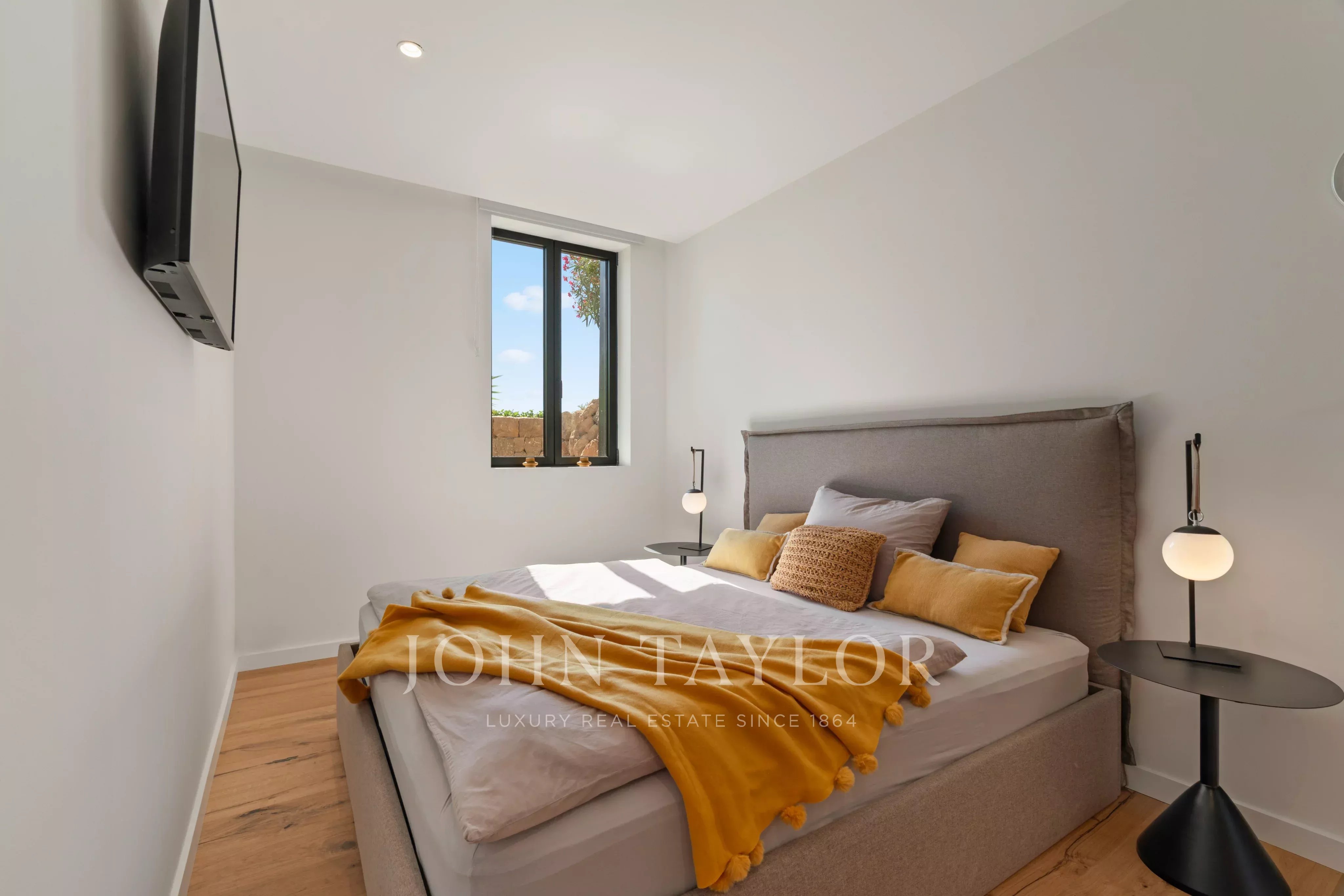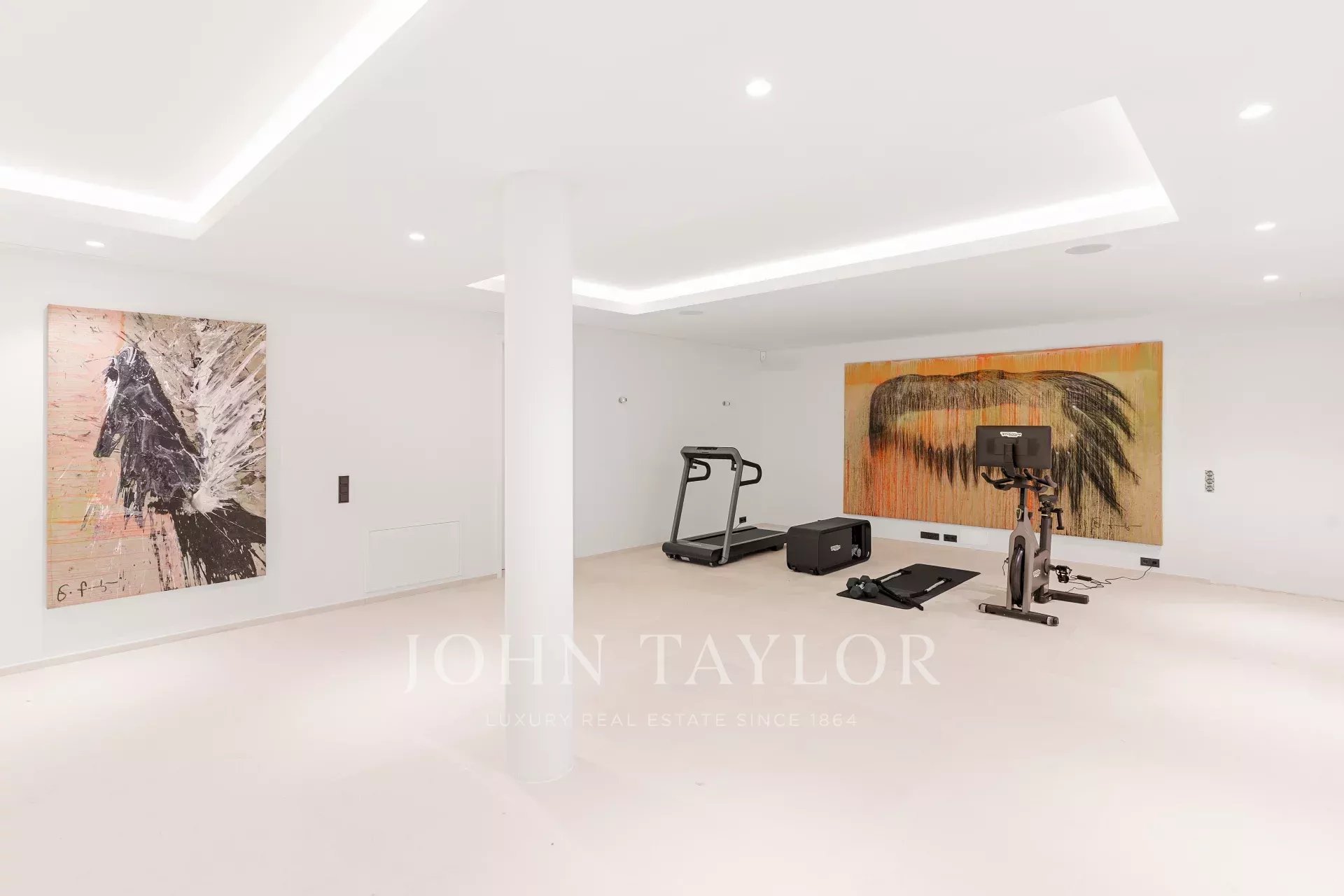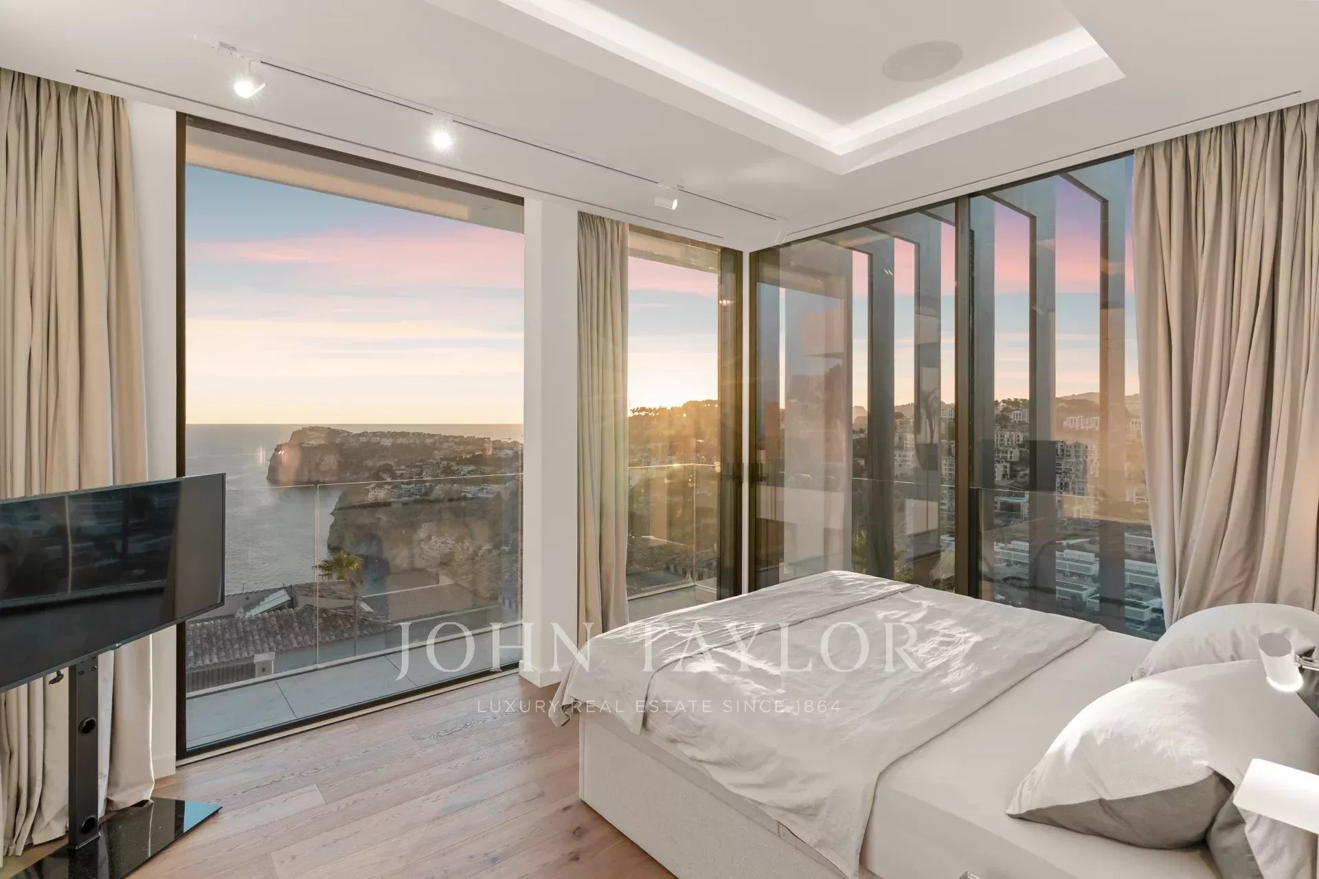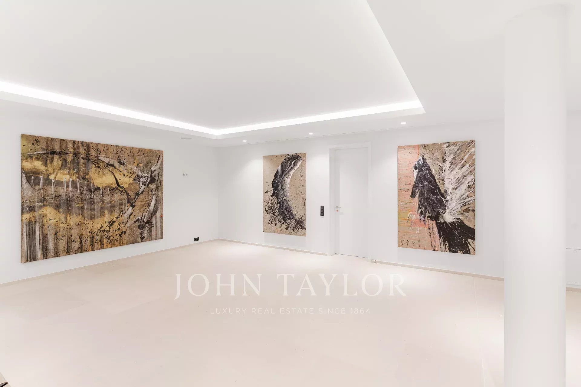 Com uma localização excecional no topo de Cala Llamp, esta impressionante e moderna villa funde-se harmoniosamente na encosta da montanha e oferece vistas únicas e deslumbrantes sobre o mar. A vista estende-se desde a espetacular baía com as suas maravilhosas águas azuis até à península de La Mola e ao mar aberto ao fundo. A moradia oferece um luxo generoso, com 6 lugares de estacionamento subterrâneos e 6 quartos numa área habitacional de 691 metros quadrados, implantada num terreno de 1.038 metros quadrados. A arquitetura impressionante combina estruturas em consola com frescos rebocados a branco e uma fachada de vidro minimalista perfeitamente trabalhada. O edifício integra-se perfeitamente na envolvente natural graças à combinação clássica de pedra calcária e paredes de pedra natural maiorquina, muito bem trabalhadas. No fascinante design interior, foram utilizados os melhores materiais naturais para criar um equilíbrio perfeito entre luz e sombra, garantindo uma atmosfera confortável e agradável. A moradia foi concebida com grande atenção aos pormenores para maximizar as deslumbrantes vistas panorâmicas das principais divisões e terraços. Devido à sua orientação a sudoeste, a moradia goza de sol durante todo o dia e oferece os mais incríveis pores-do-sol, onde se pode ver a silhueta da ilha vizinha de Ibiza. A orientação cuidadosa do edifício, a elevação, a distribuição estudada e a integração na paisagem criam um ambiente perfeito para desfrutar do Mediterrâneo e da privacidade absoluta ao mesmo tempo. A propriedade tem uma excelente localização com vista para a baía de Cala Llamp, oferecendo paz, tranquilidade, segurança e privacidade neste cenário exclusivo. O popular Gran Folies Beach Club fica apenas a alguns minutos a pé e, nas imediações, existem inúmeros cafés e restaurantes interessantes e de alta qualidade no porto e na marina. Descubra o extraordinário estilo de vida desta requintada moradia. Por favor, contacte-nos para mais informações e para marcar uma visita.