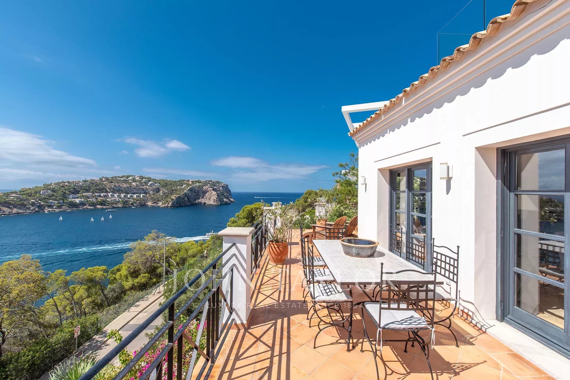 Descubra esta extraordinária residência localizada na linha da frente do exclusivo Puerto de Andratx, onde as vistas deslumbrantes sobre a baía se tornam o cenário perfeito para uma vida de conforto e sofisticação. Com uma área de construção de 321 m², esta propriedade funde magistralmente o charme tradicional mediterrânico com um design contemporâneo e funcional, criando um refúgio ideal para a vida familiar e o entretenimento. A propriedade oferece seis quartos acolhedores, todos com casa de banho privativa, e um total de sete casas de banho, garantindo espaço e privacidade para todos os membros da família e seus convidados. No exterior, os seus generosos terraços de 285 m² convidam ao relaxamento, com uma piscina de água salgada de 30 m² e um jacuzzi no telhado com vista panorâmica para o mar. O interior apresenta uma área de estar luminosa e em plano aberto que combina harmoniosamente com uma cozinha espaçosa e elegante, concebida para desfrutar das vistas ininterruptas. A moradia foi cuidadosamente equipada com detalhes de alta qualidade, tais como janelas e persianas em madeira, pisos em pedra natural com aquecimento por piso radiante, ar condicionado, lareira e roupeiros embutidos. As comodidades adicionais incluem dois lugares de estacionamento, uma área de churrasco, lavandaria, arrecadação e um jardim exuberante que completa este oásis de sonho. Contacte-nos para marcar uma visita privada a esta propriedade exclusiva.