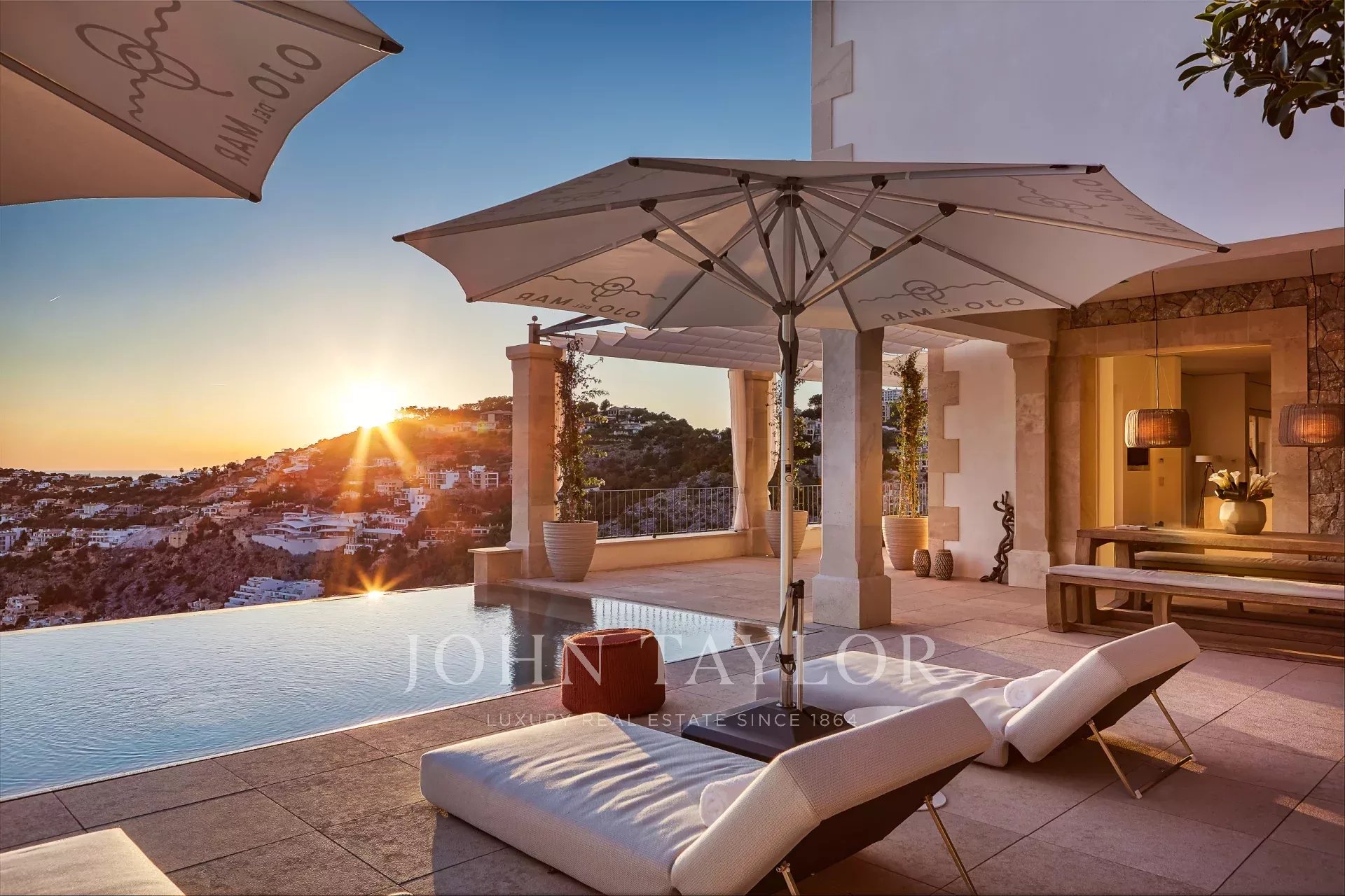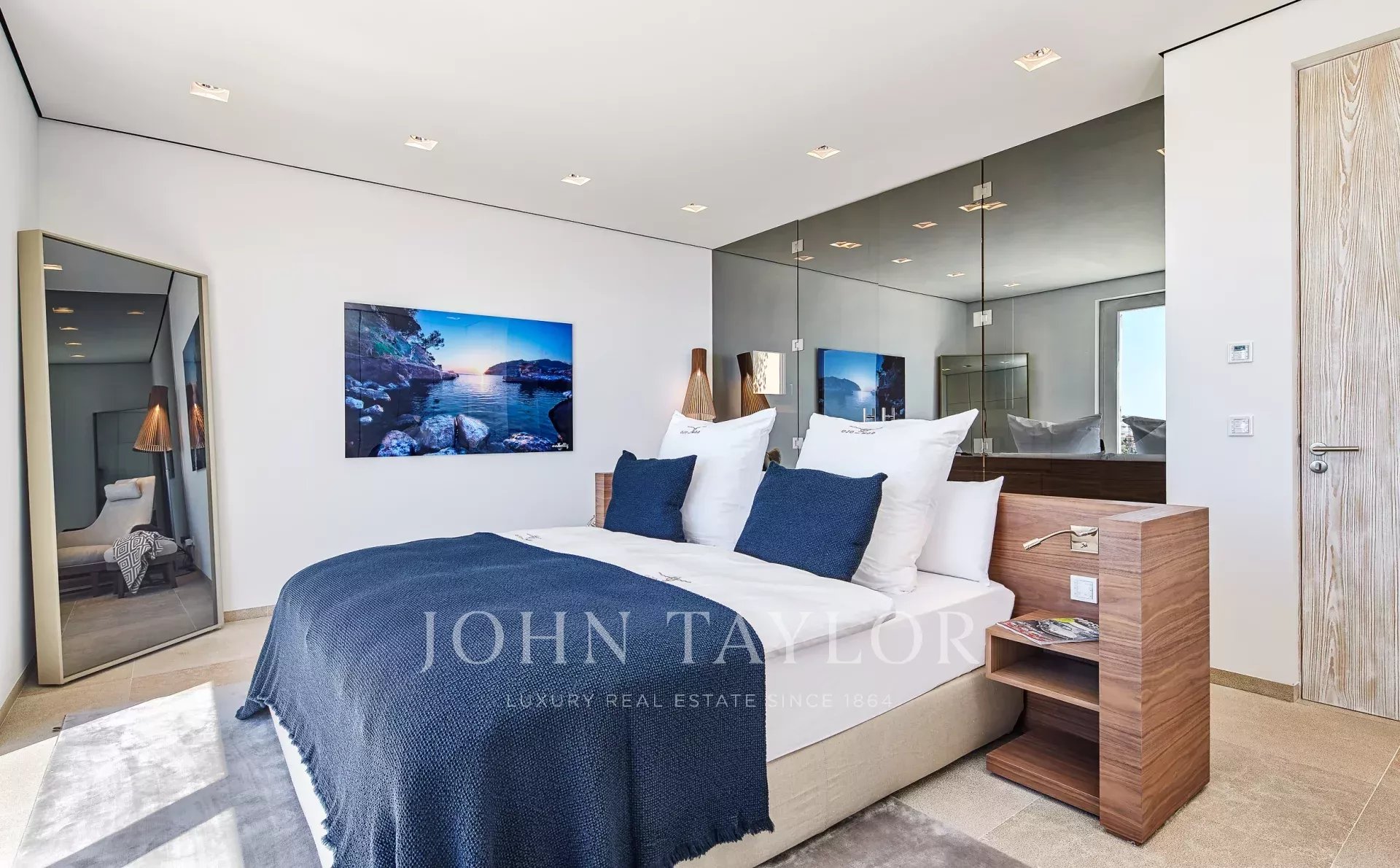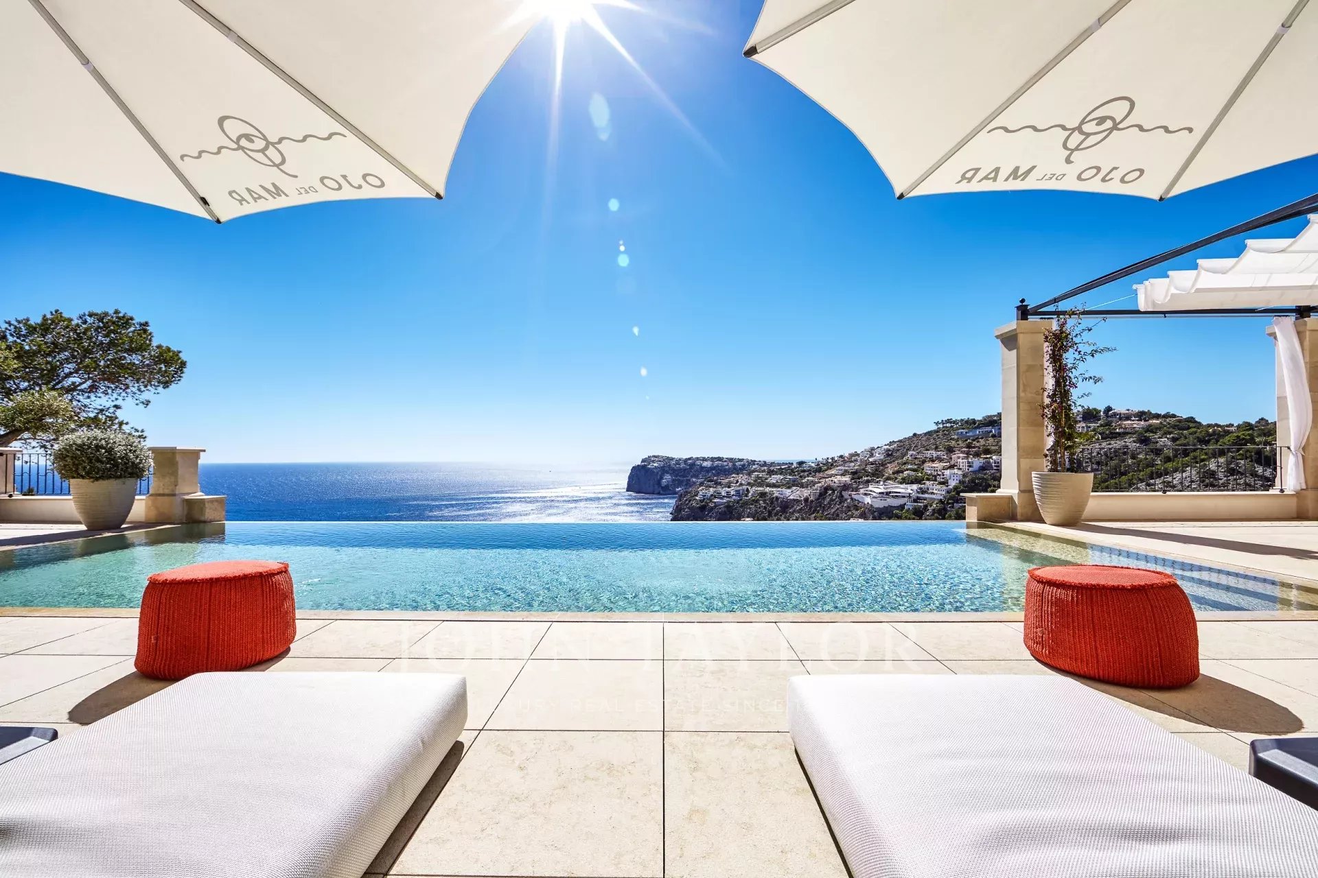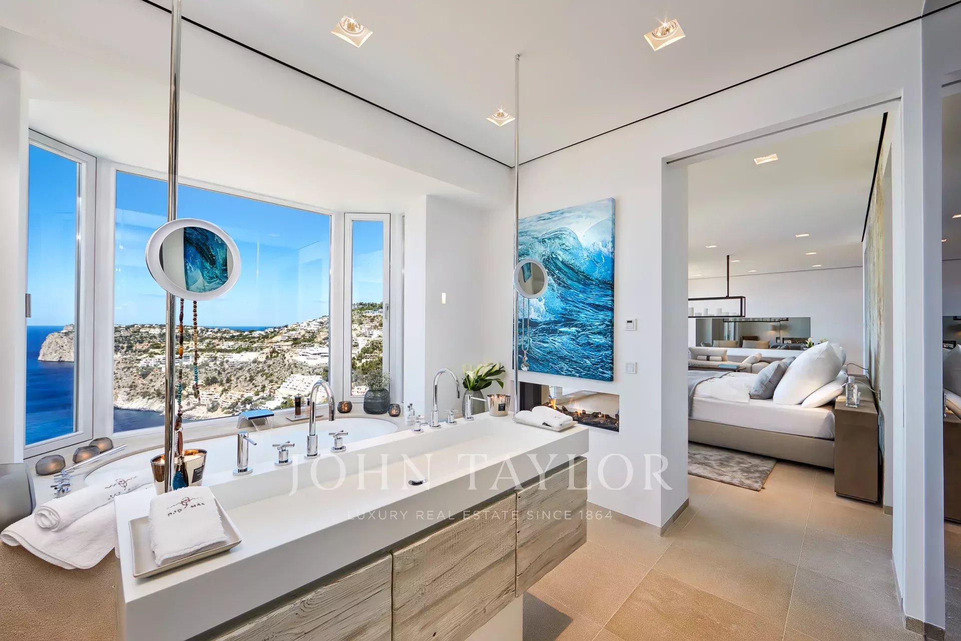 Esta luxuosa propriedade está situada num local muito procurado acima da baía de Cala Llamp e oferece vistas panorâmicas deslumbrantes sobre o mar. A moradia tem uma área de construção de 700m2 em três níveis. No rés do chão, existe um elegante hall de entrada que conduz à sala de televisão, à sala de estar, à sala de jantar e à cozinha. A espaçosa área de estar estende-se através das pérgulas para os terraços, onde existem duas cozinhas exteriores com grelhadores de churrasco e uma grande mesa de jantar, bem como uma casa de banho. Outro destaque é a piscina infinita de 60m2. A área exterior foi concebida para permitir desfrutar perfeitamente do clima mediterrânico. O piso superior pode ser alcançado através do elevador ou da escadaria elegantemente iluminada, onde se encontra a área de dormir. Esta é composta por dois quartos com casas de banho privativas e uma confortável suite principal. Esta é composta por uma antecâmara, uma área de dormir espaçosa e uma luxuosa casa de banho com uma banheira na janela saliente. Na cave, para além da garagem de 100m2, que oferece espaço para pelo menos 5 carros, há uma bodega, uma área de fitness com sauna, um cinema em casa, um quarto de serviço com casa de banho privativa, mais uma casa de banho, uma lavandaria, uma despensa e uma arrecadação. A propriedade será vendida incluindo a mobília.
