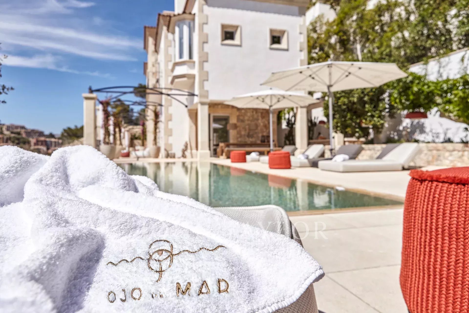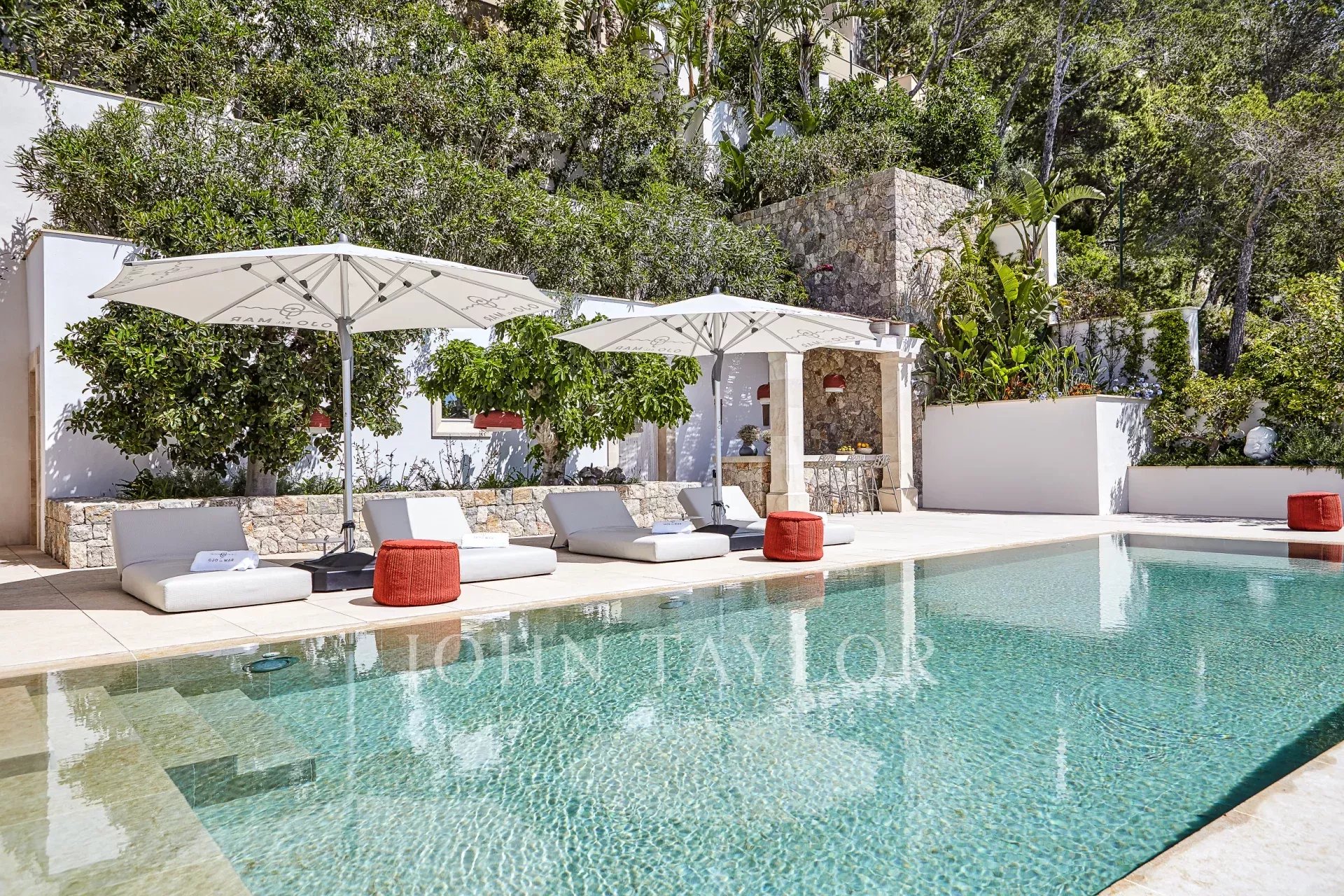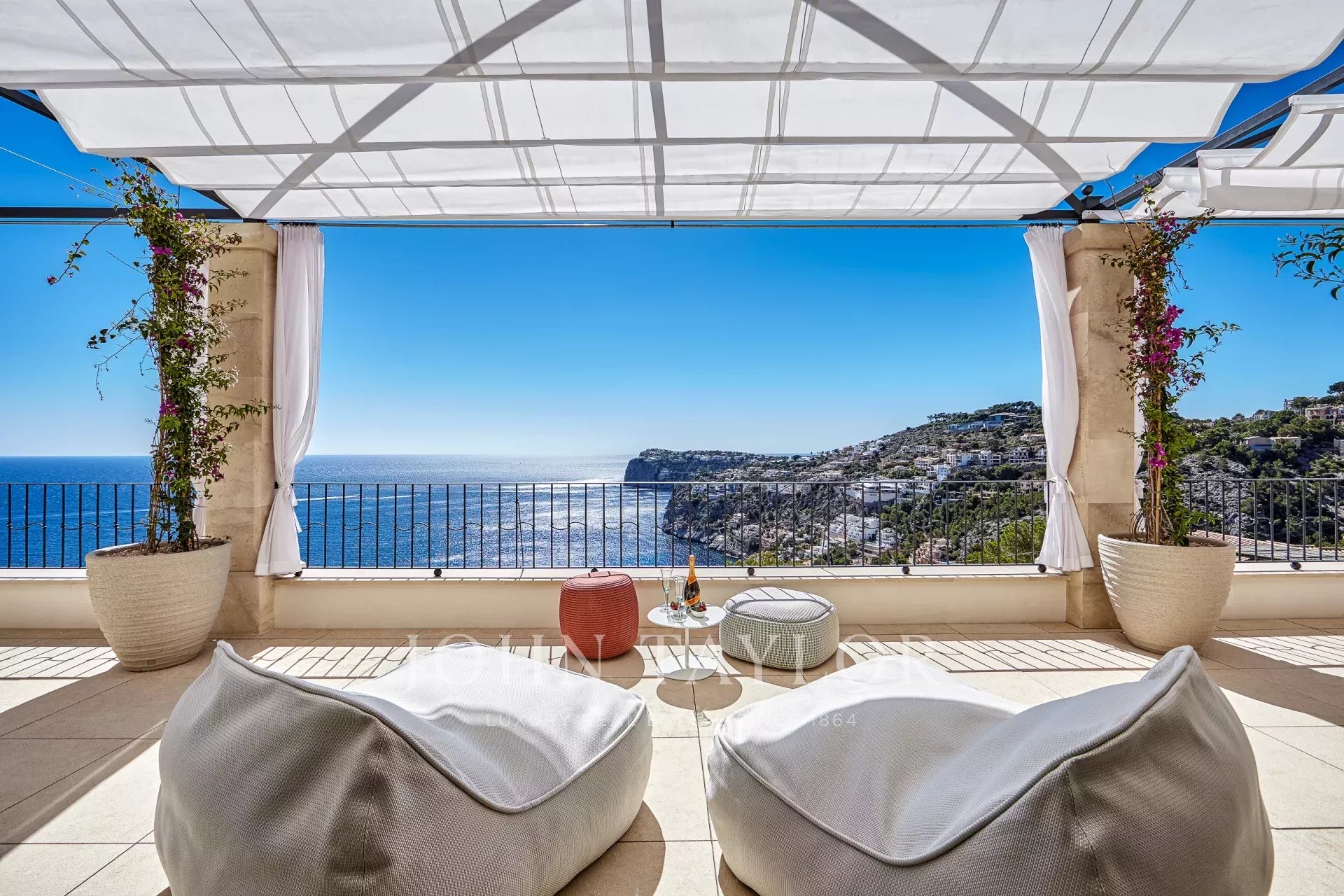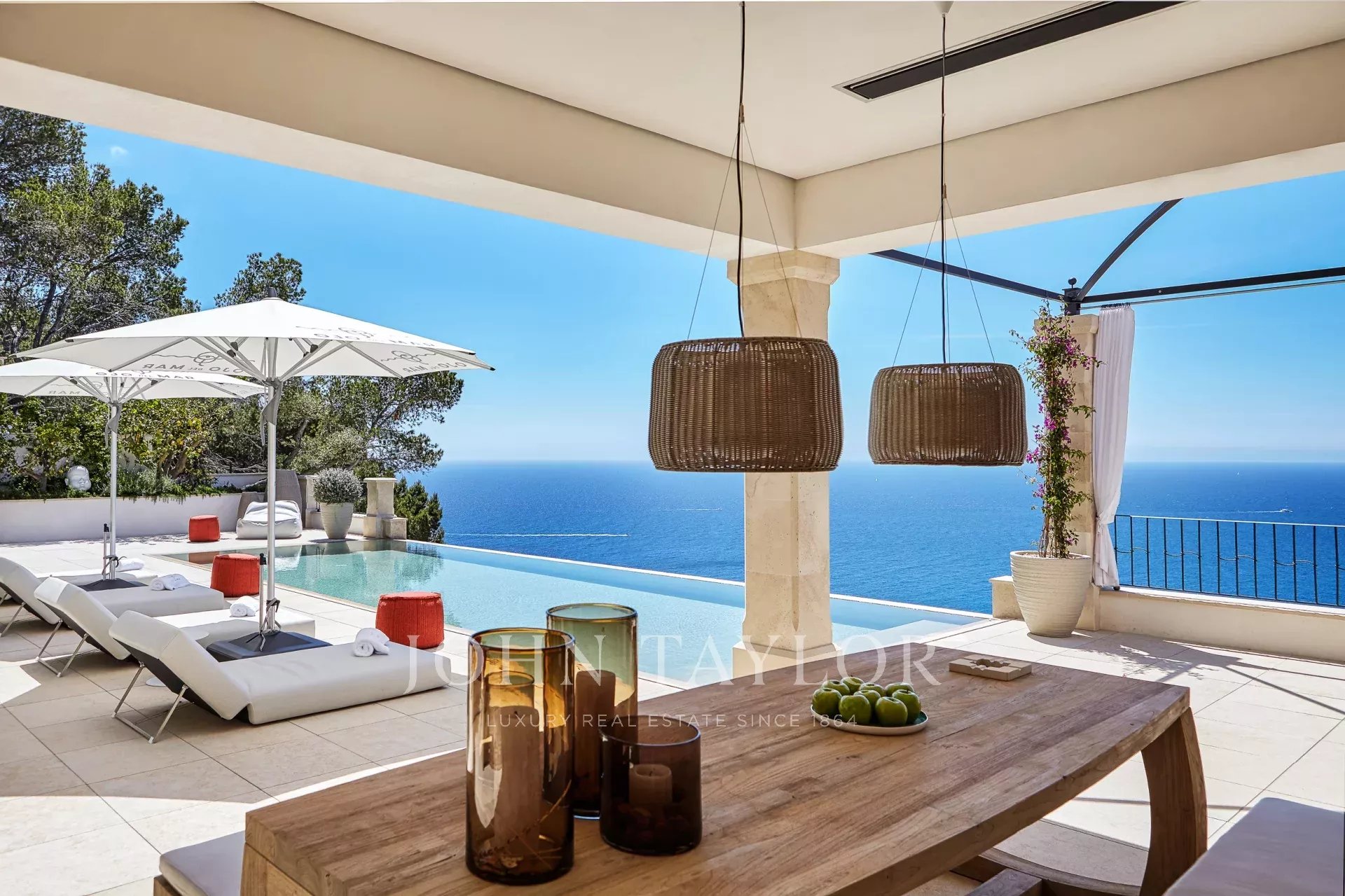 Esta luxuosa propriedade está situada num local muito procurado acima da baía de Cala Llamp e oferece vistas panorâmicas deslumbrantes sobre o mar. A moradia tem uma área de construção de 700m2 em três níveis. No rés do chão, existe um elegante hall de entrada que conduz à sala de televisão, à sala de estar, à sala de jantar e à cozinha. A espaçosa área de estar estende-se através das pérgulas para os terraços, onde existem duas cozinhas exteriores com grelhadores de churrasco e uma grande mesa de jantar, bem como uma casa de banho. Outro destaque é a piscina infinita de 60m2. A área exterior foi concebida para permitir desfrutar perfeitamente do clima mediterrânico. O piso superior pode ser alcançado através do elevador ou da escadaria elegantemente iluminada, onde se encontra a área de dormir. Esta é composta por dois quartos com casas de banho privativas e uma confortável suite principal. Esta é composta por uma antecâmara, uma área de dormir espaçosa e uma luxuosa casa de banho com uma banheira na janela saliente. Na cave, para além da garagem de 100m2, que oferece espaço para pelo menos 5 carros, há uma bodega, uma área de fitness com sauna, um cinema em casa, um quarto de serviço com casa de banho privativa, mais uma casa de banho, uma lavandaria, uma despensa e uma arrecadação. A propriedade será vendida incluindo a mobília.