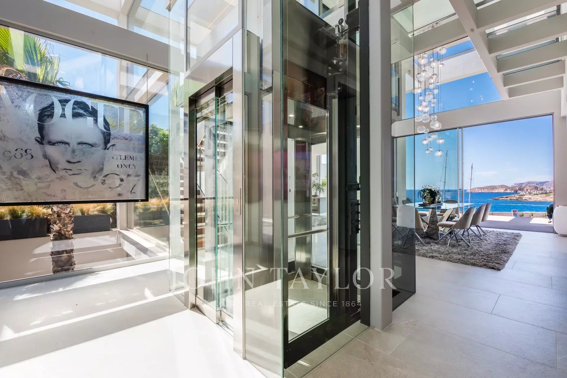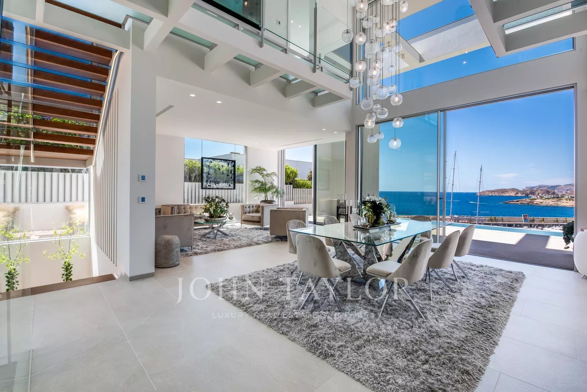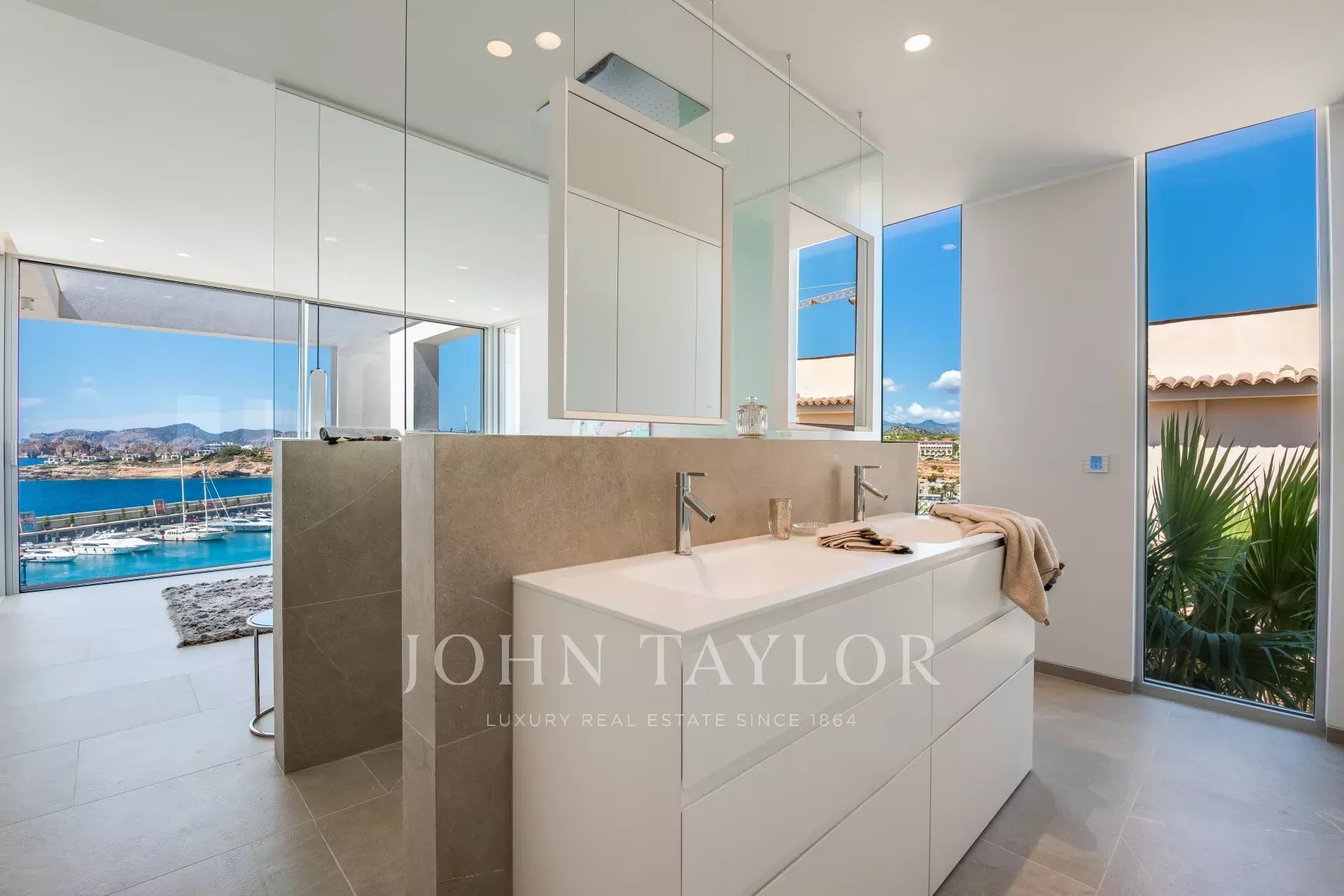 Esta moradia ultra-moderna está situada no porto de Port Adriano em Santa Ponsa. O estilo arquitetónico único com enormes frentes de janelas dá-lhe liberdade. Esta obra de arte arquitetónica está distribuída por 3 níveis ligados por um elevador de vidro, bem como corredores de vidro, etc. Com esta arquitetura única, pretende-se trazer toda a luz mediterrânica para esta moradia. Esta moradia tem 4 quartos duplos, cada um com uma casa de banho privativa, uma sala de estar inundada de luz, cozinha aberta com equipamento de última geração, uma sala de fitness, um cinema em casa, uma sala de vinhos, garagem e lugares de estacionamento para 2 carros são apenas algumas das características desta moradia única.
