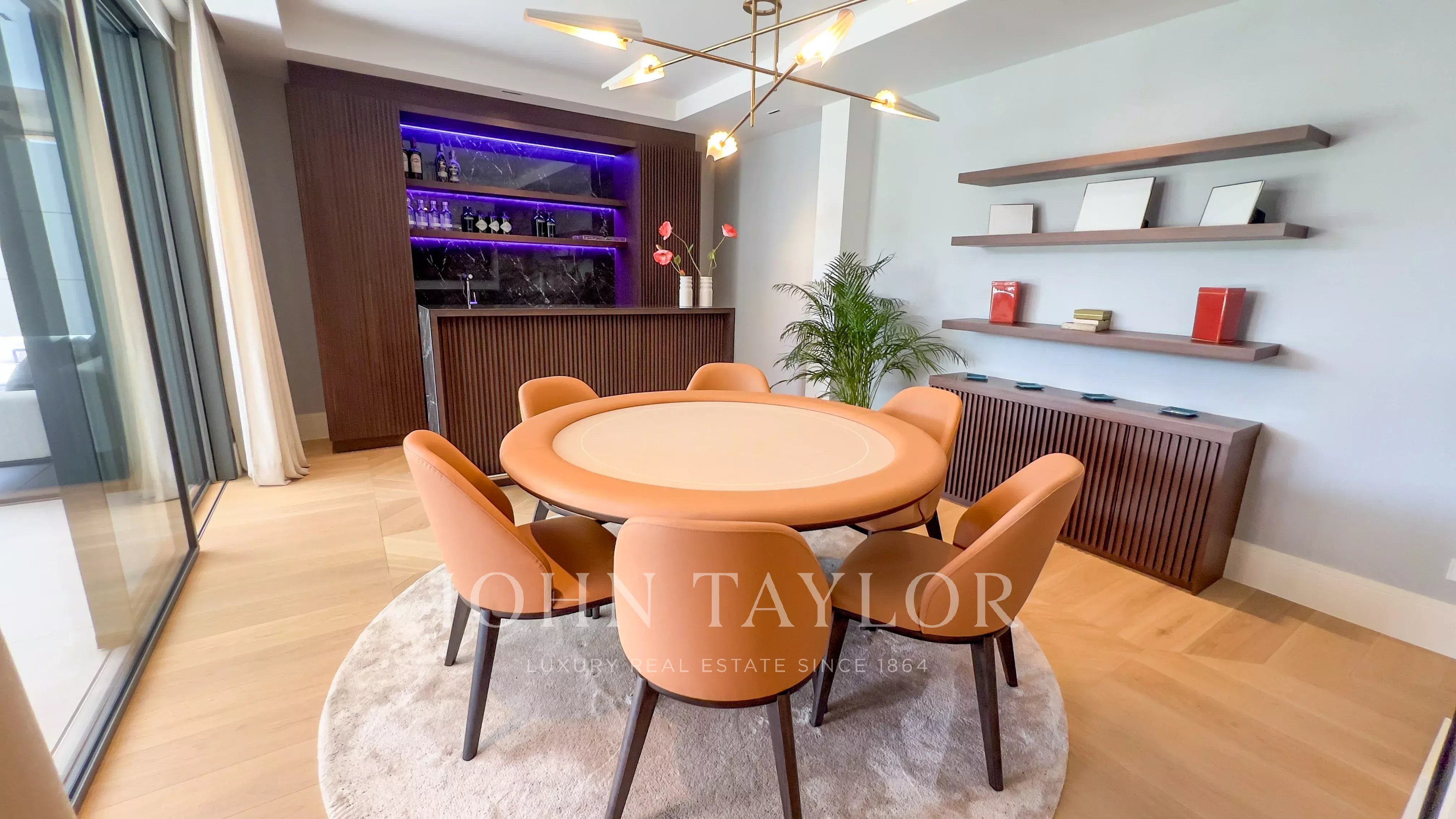 O piso principal abriga um elegante hall de dois andares, grande sala de estar com saída para o jardim e a piscina, sala de estar com bar, cozinha de design equipada com eletrodomésticos Gaggenau e área de serviço. Neste nível também está a suíte principal, com sala privada, dois closets e banheiro privativo, além de lavabo para convidados.