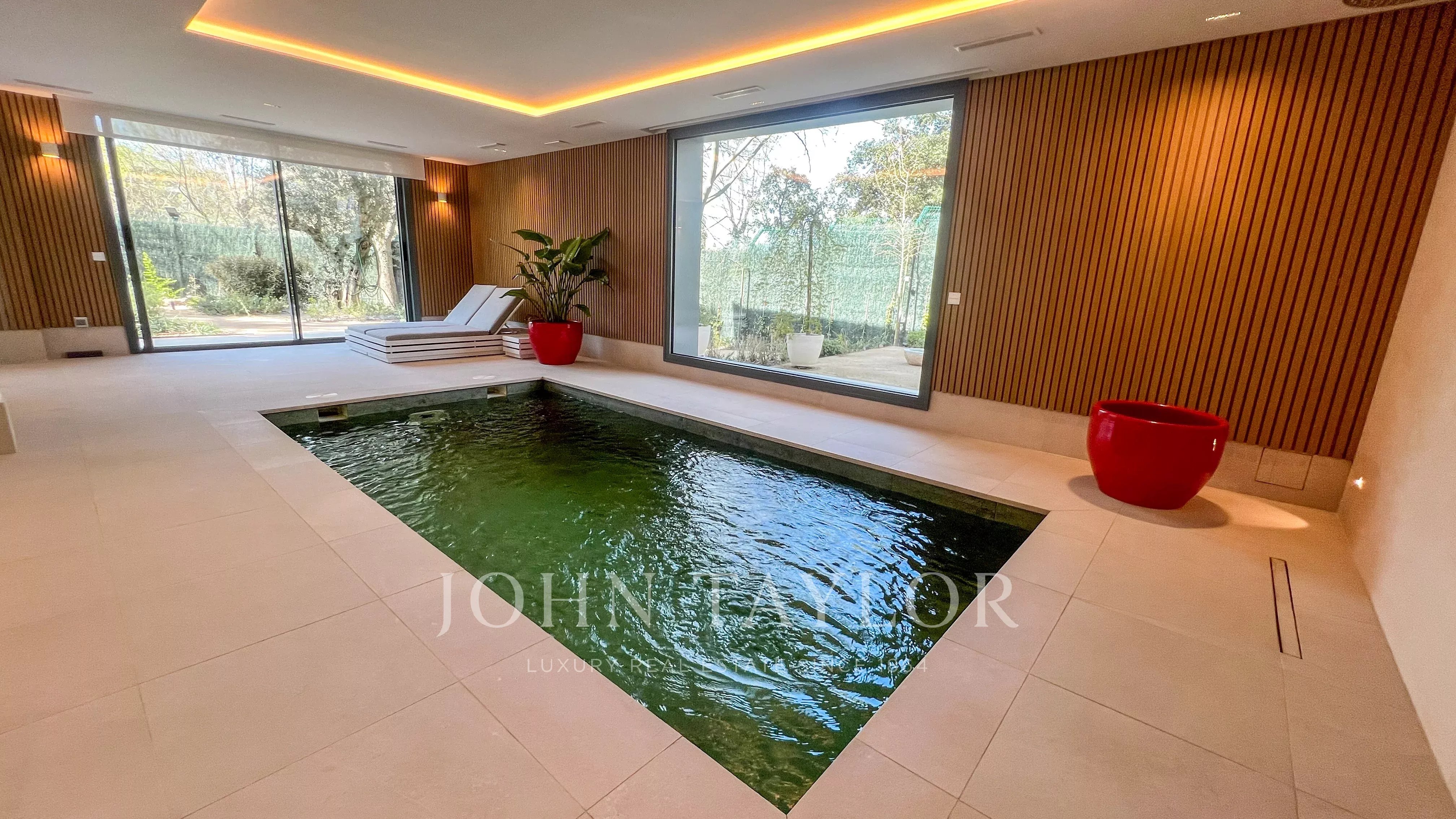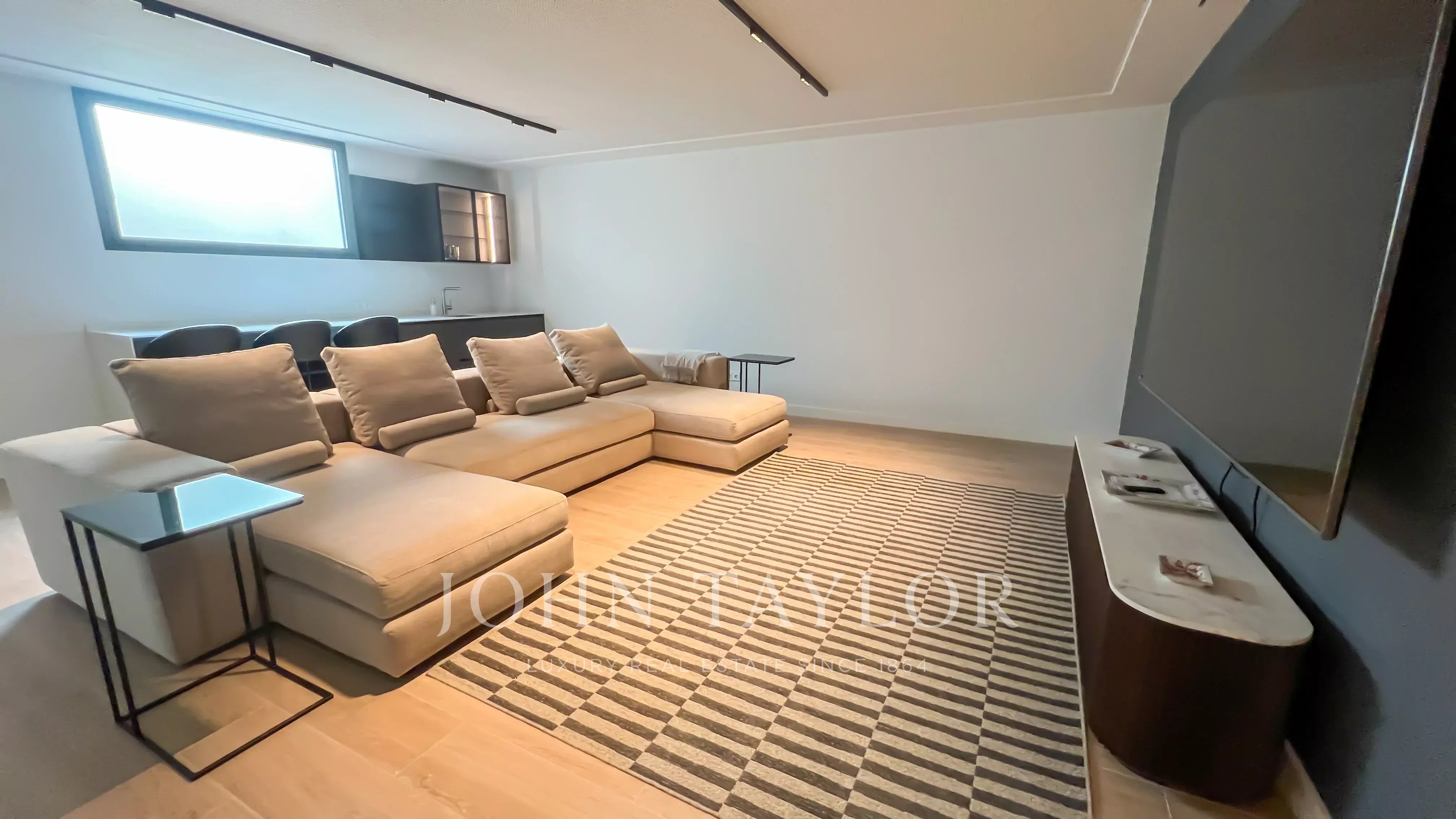 O nível inferior é destinado ao lazer e bem-estar, com sala de cinema, piscina interior com academia, sauna, sala de massagens, adega, despensa e garagem com pré-instalação para carregador elétrico.