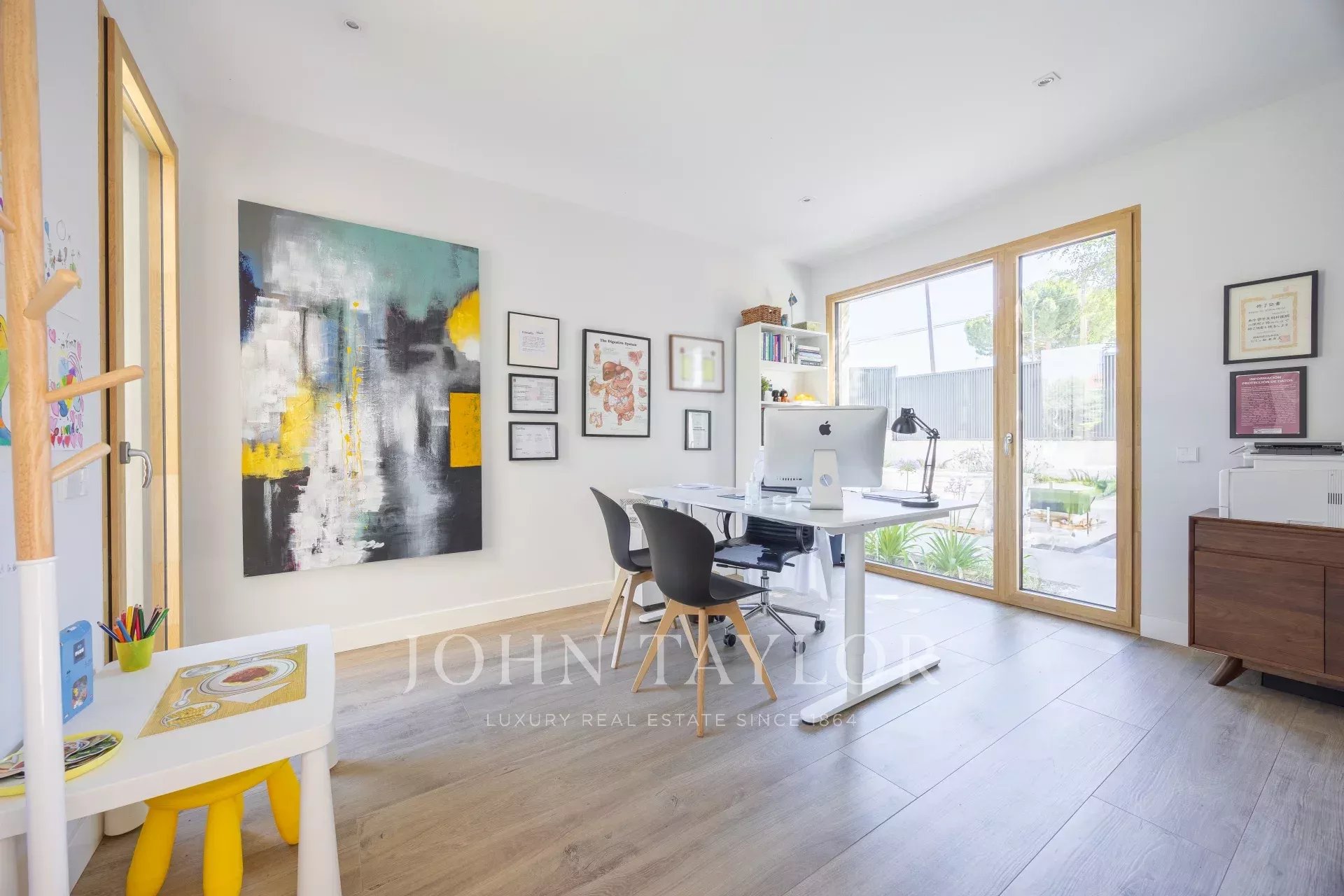 Ao entrar na casa somos inundados por uma luminosidade impressionante devido às suas grandes janelas do teto ao chão e às cores claras do seu chão e paredes, e o piso principal recebe-nos com um espaçoso hall, com WC de hóspedes, a partir do qual podemos aceder tanto à casa como a um escritório que pode ser facilmente convertido num 4º quarto ou quarto de hóspedes, Seguindo a distribuição encontramos uma casa de banho completa com duche que poderá ser utilizada como quarto de hóspedes, uma lavandaria e uma cozinha ampla, com despensa, e aberta para a sala de jantar de onde também podemos aceder à espaçosa e luminosa sala de estar, uma sala de estar ou sala de TV completam este piso.