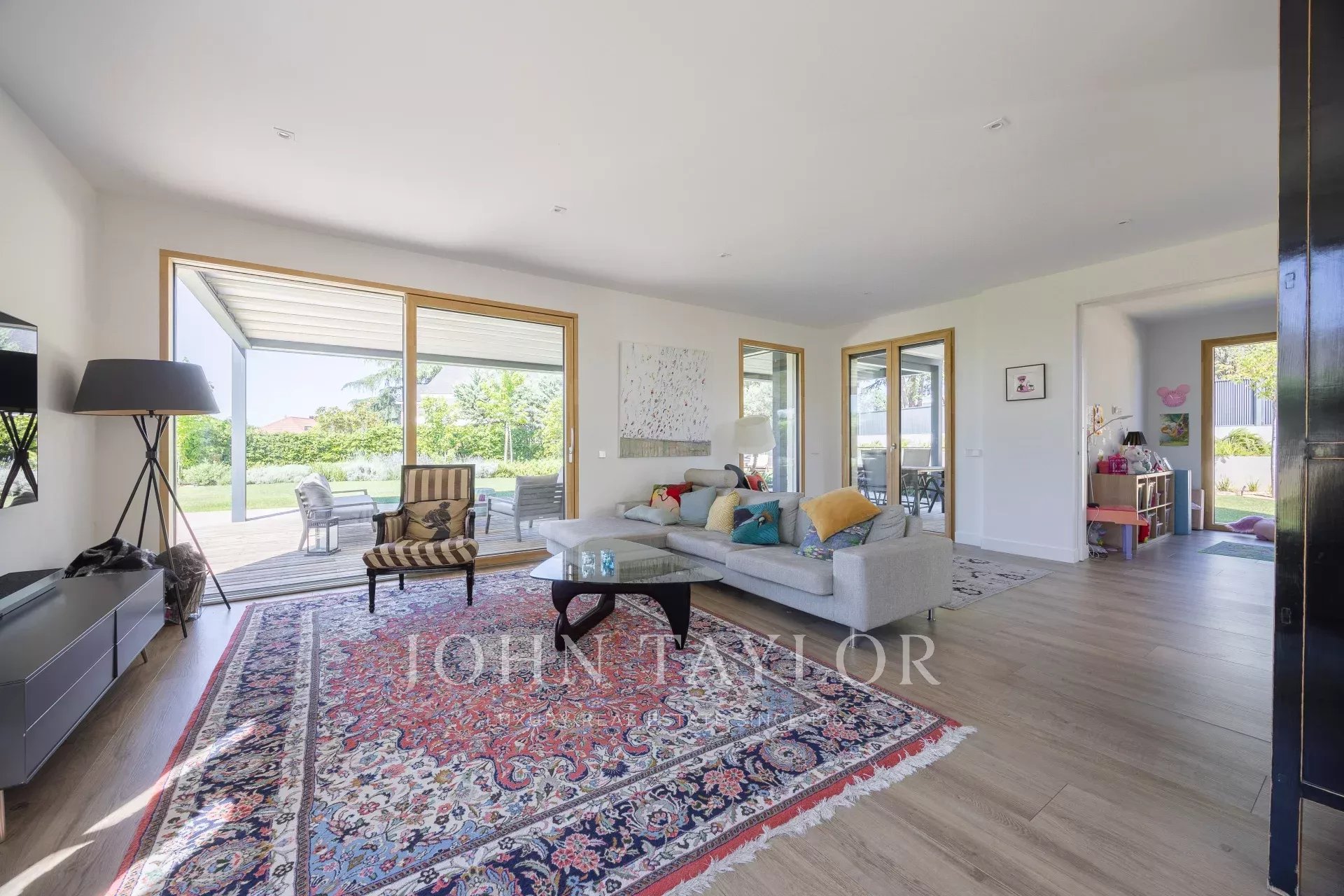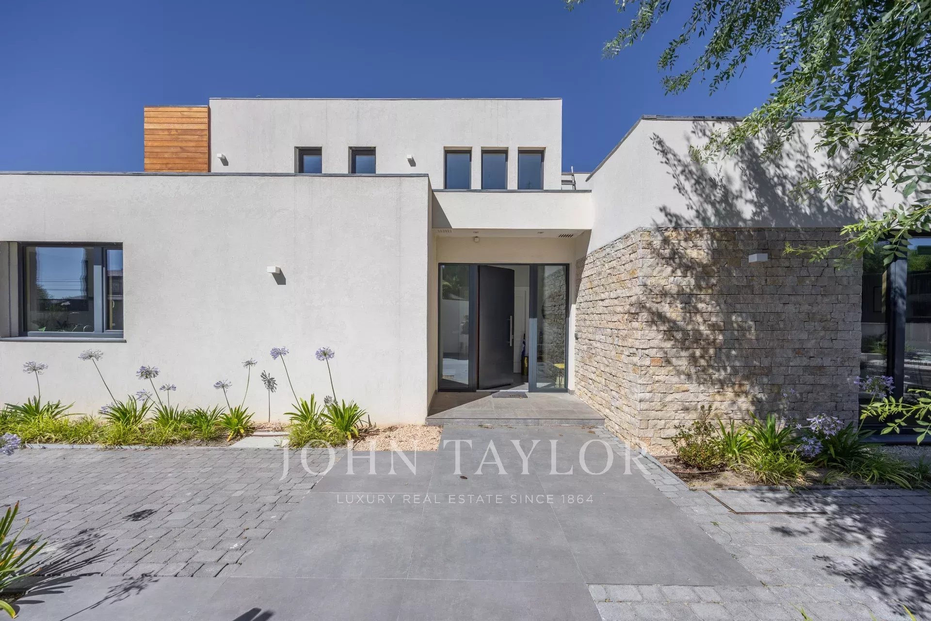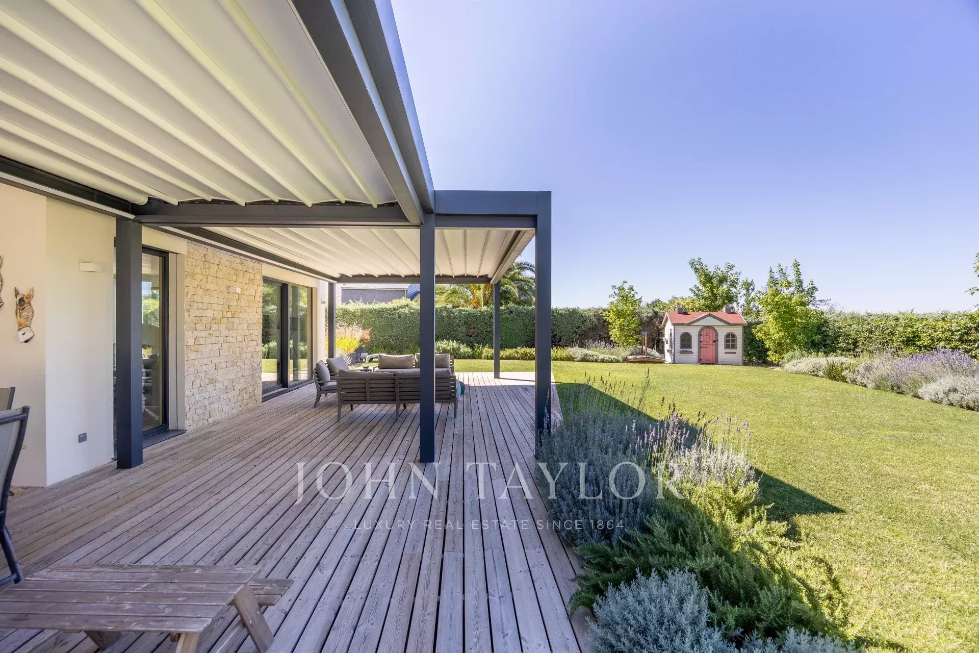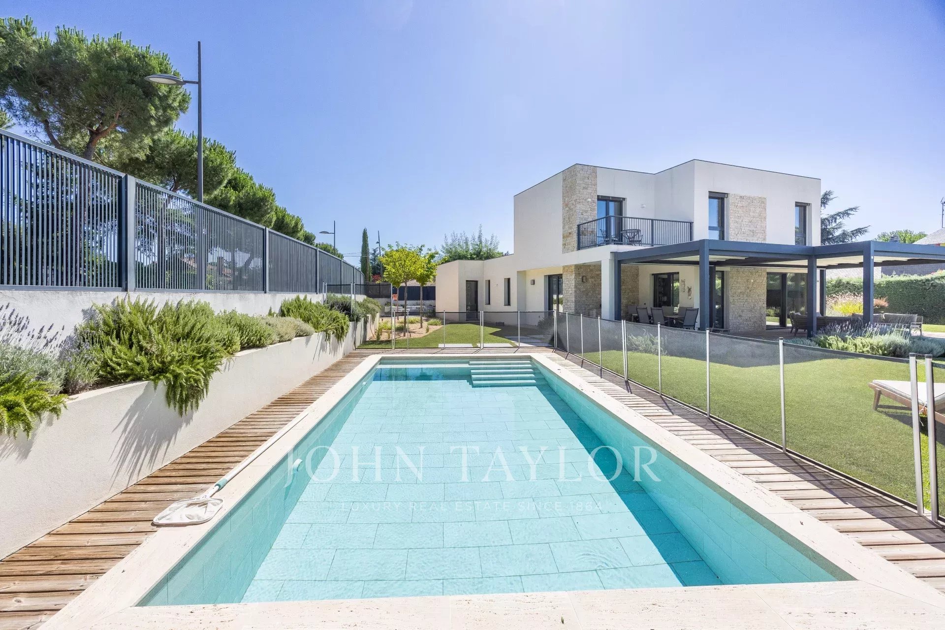 O exterior é comparável, com um jardim desenhado por um paisagista de renome, responde também à necessidade de baixo consumo de água e recria vários ambientes diferentes, piscina de água salgada, zona de alpendre com pérgola de construção italiana com teto retrátil e chão em madeira de pinho tratado no forno, iluminação de jardim, ligações para colunas de som...