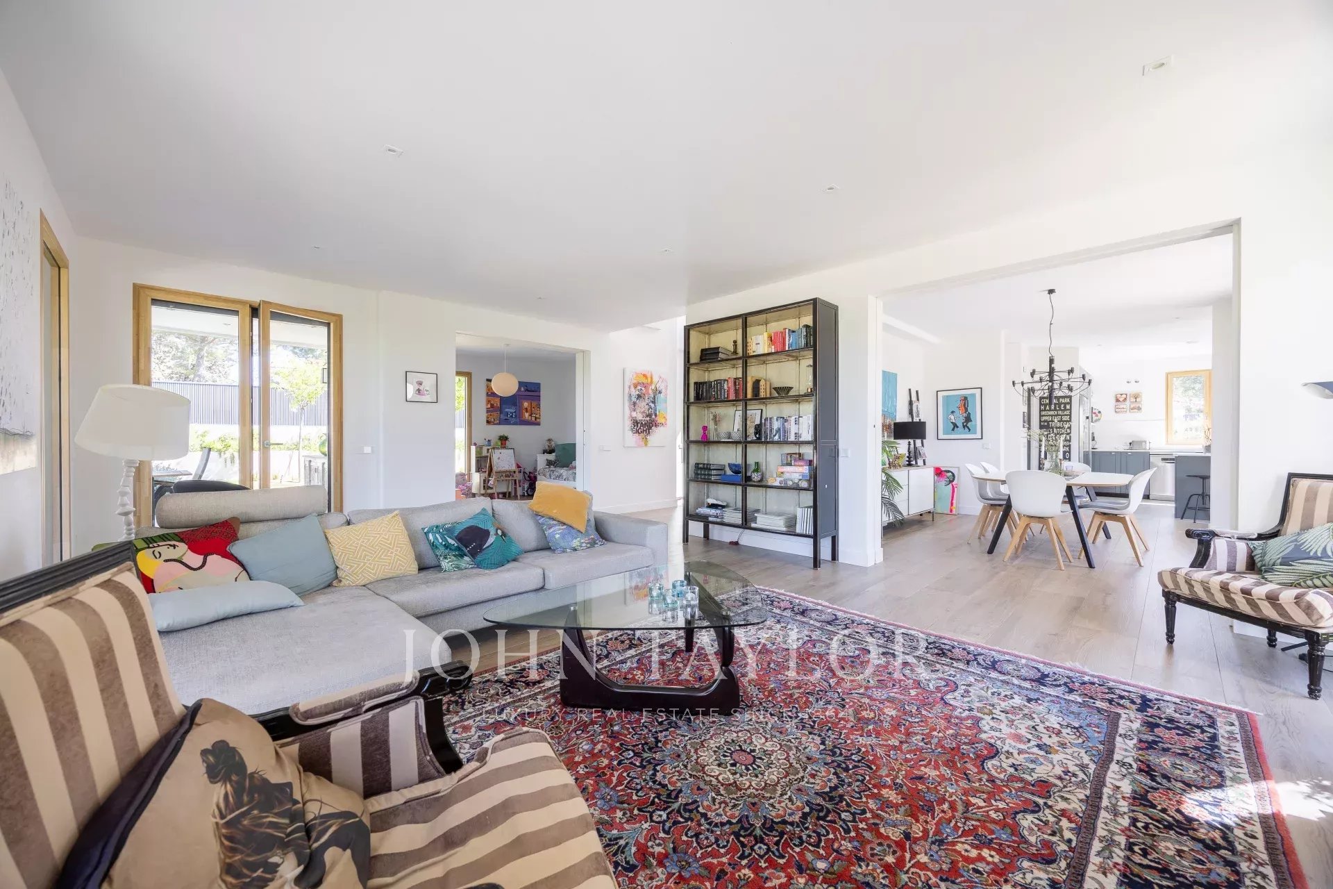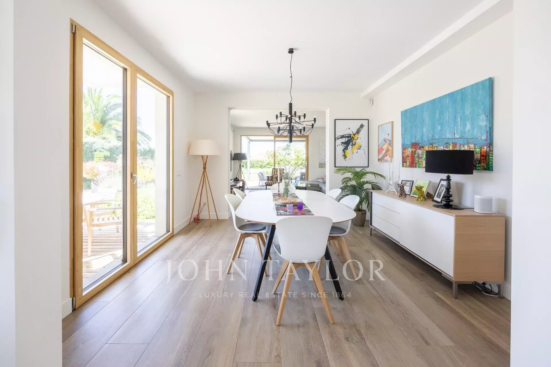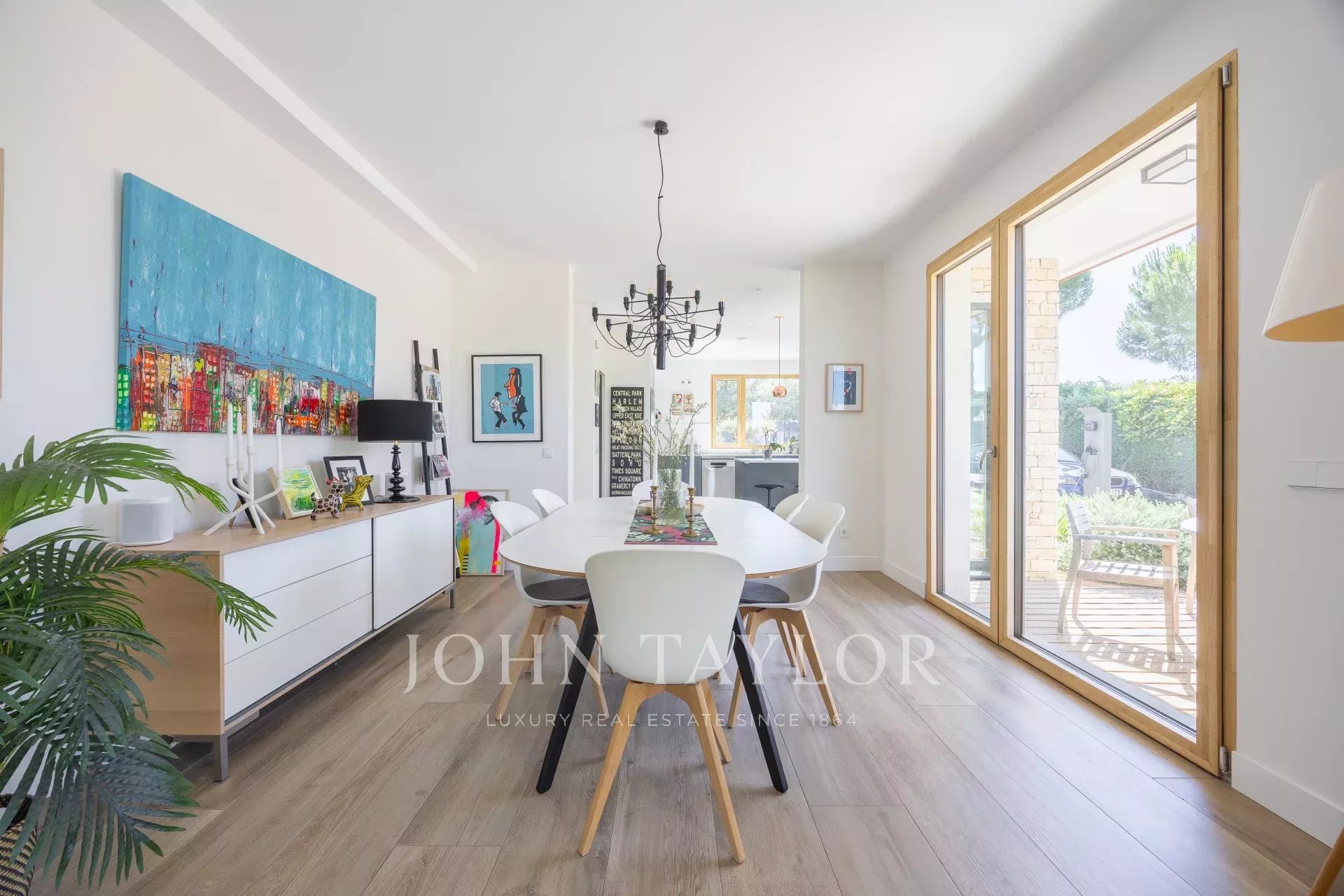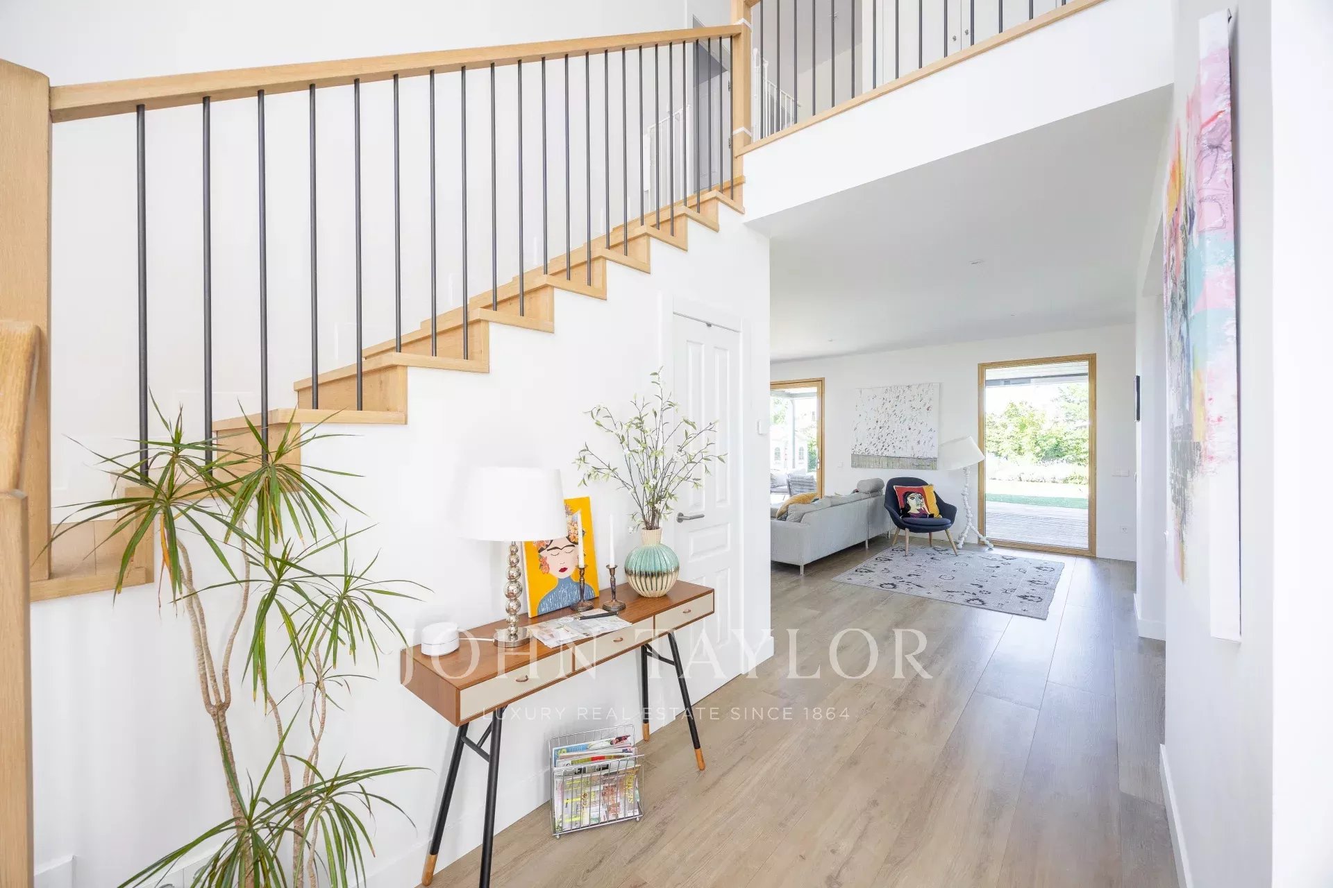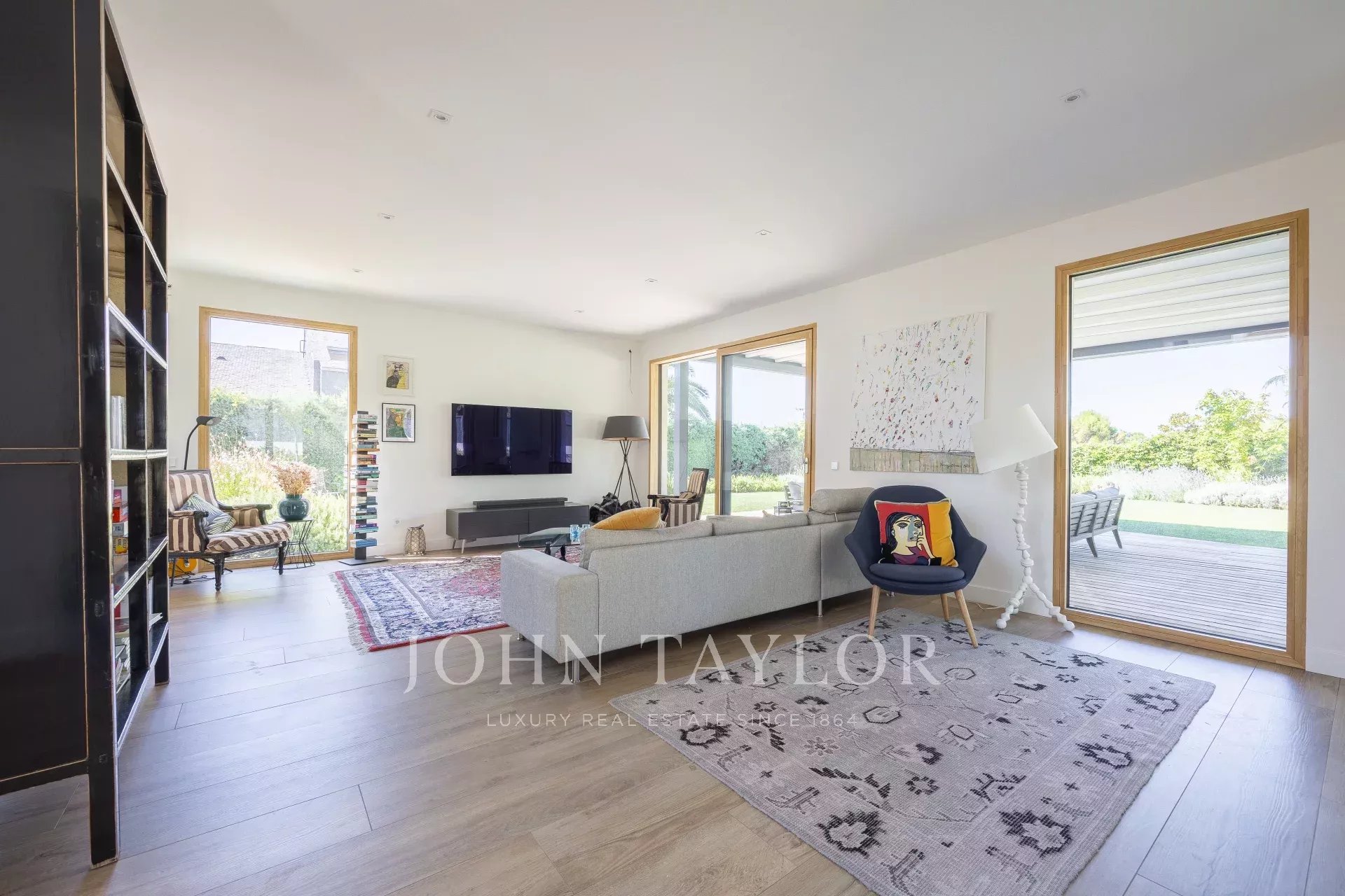 O exterior é comparável, com um jardim desenhado por um paisagista de renome, responde também à necessidade de baixo consumo de água e recria vários ambientes diferentes, piscina de água salgada, zona de alpendre com pérgola de construção italiana com teto retrátil e chão em madeira de pinho tratado no forno, iluminação de jardim, ligações para colunas de som...
