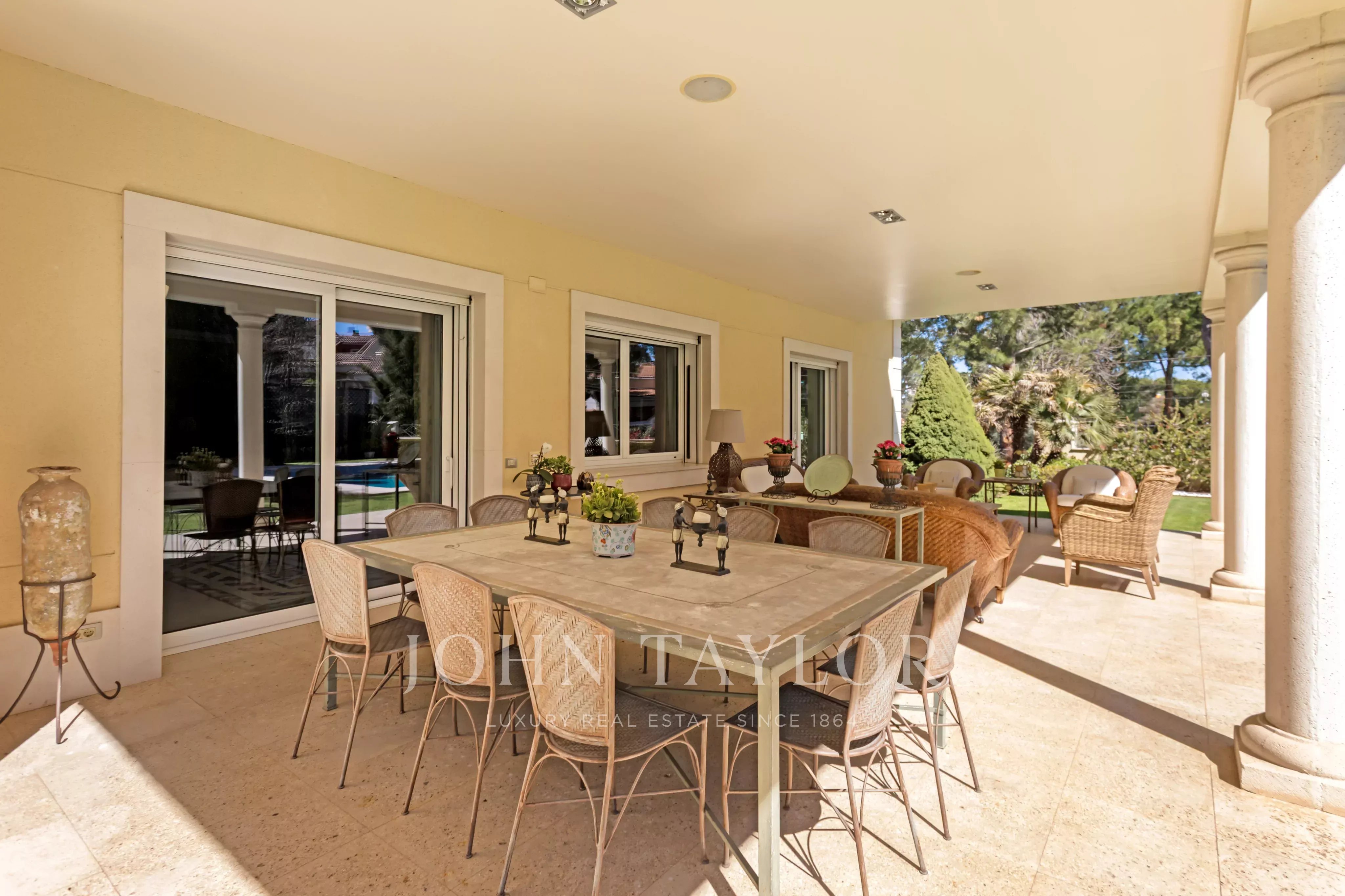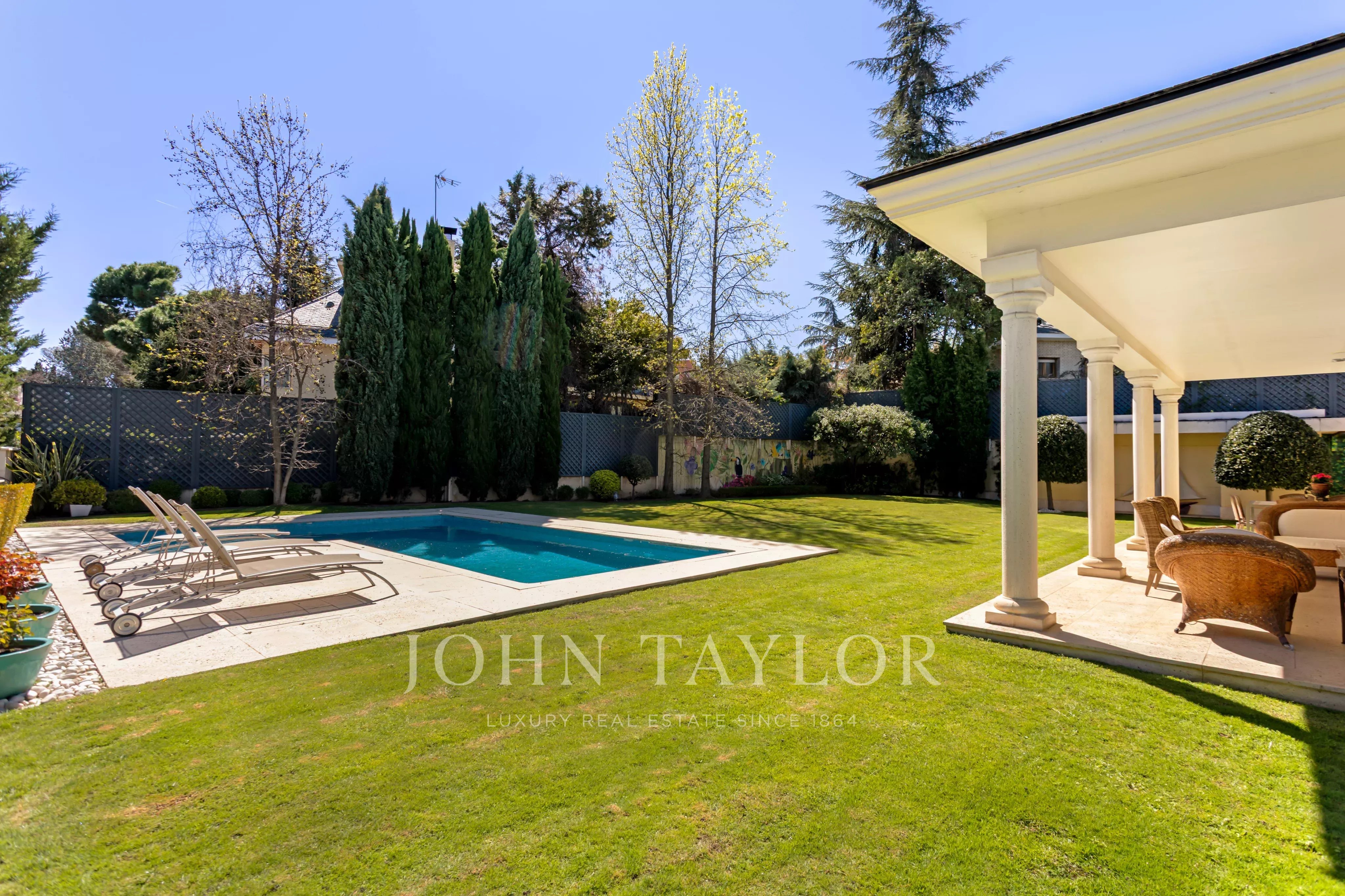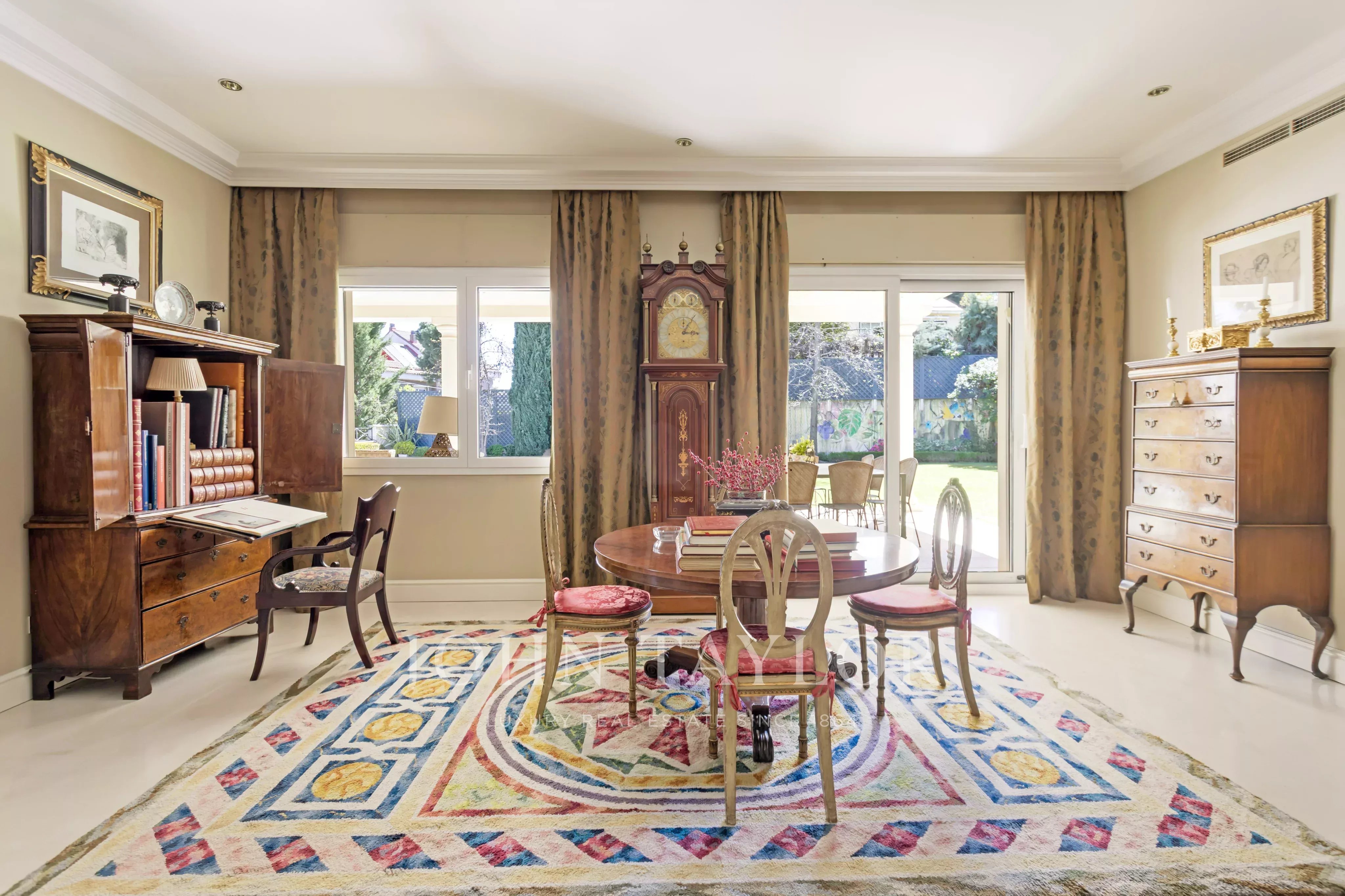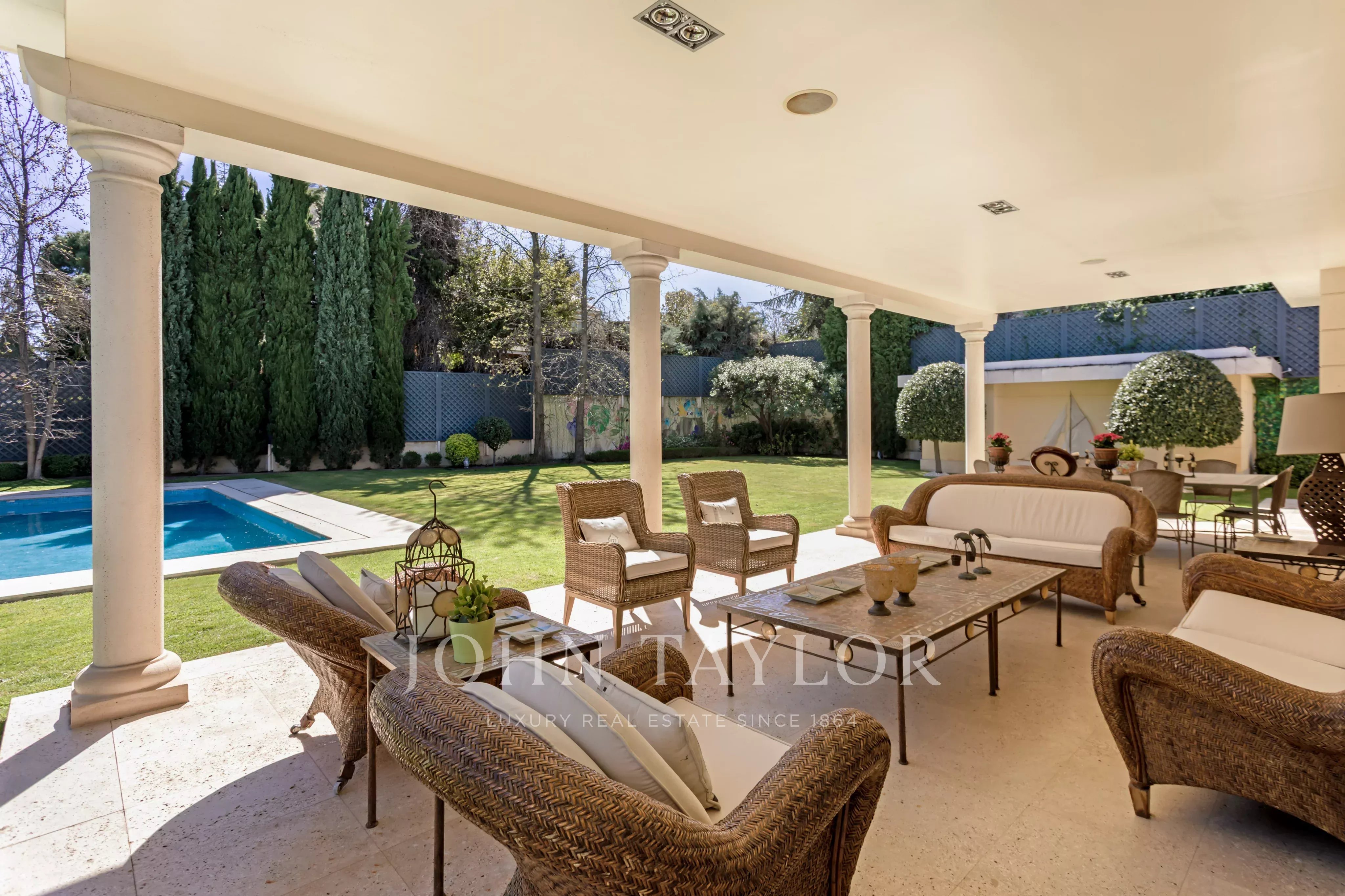 No exterior, o destaque é para a piscina privativa, rodeada por um belo jardim com sistema de rega automático. A ampla varanda coberta é perfeita para momentos de lazer ao ar livre, completando o cenário ideal para viver com elegância em Madrid.