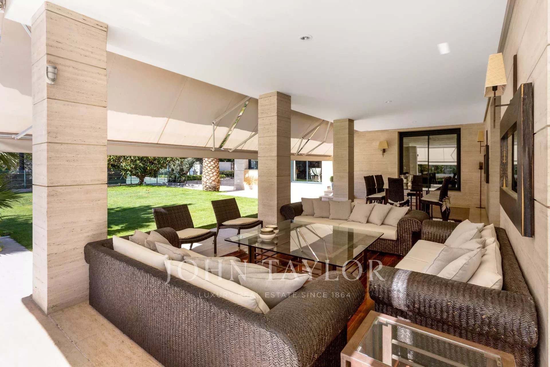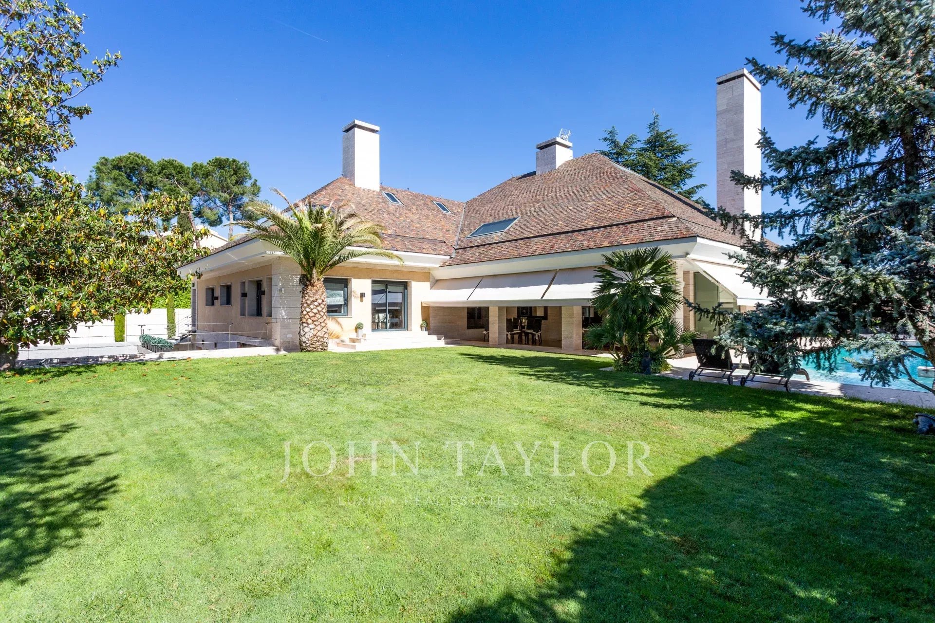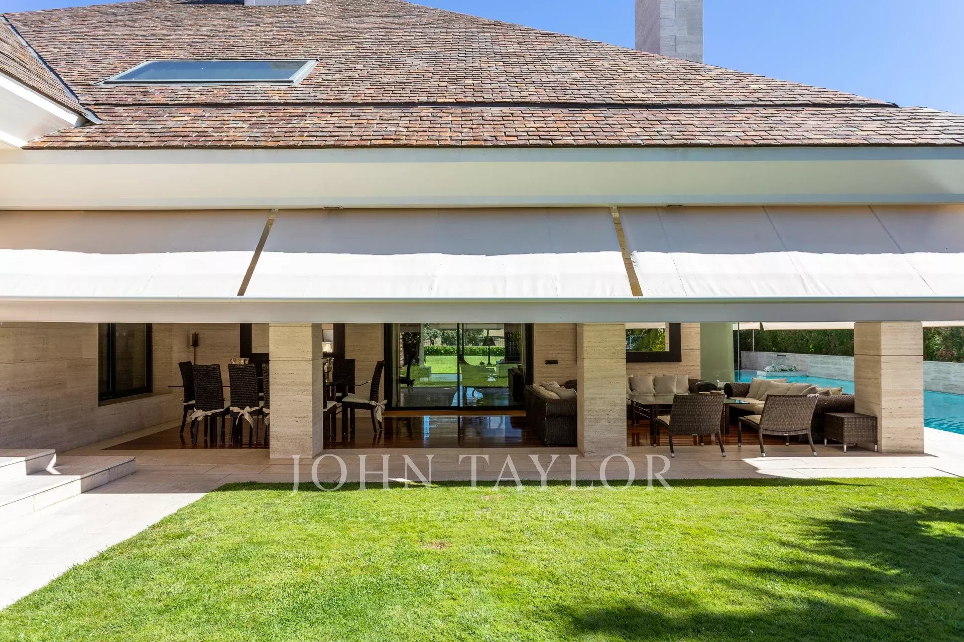 No exterior, piscina junto ao alpendre e lounges, campo de ténis e garagem exterior para 4 carros.