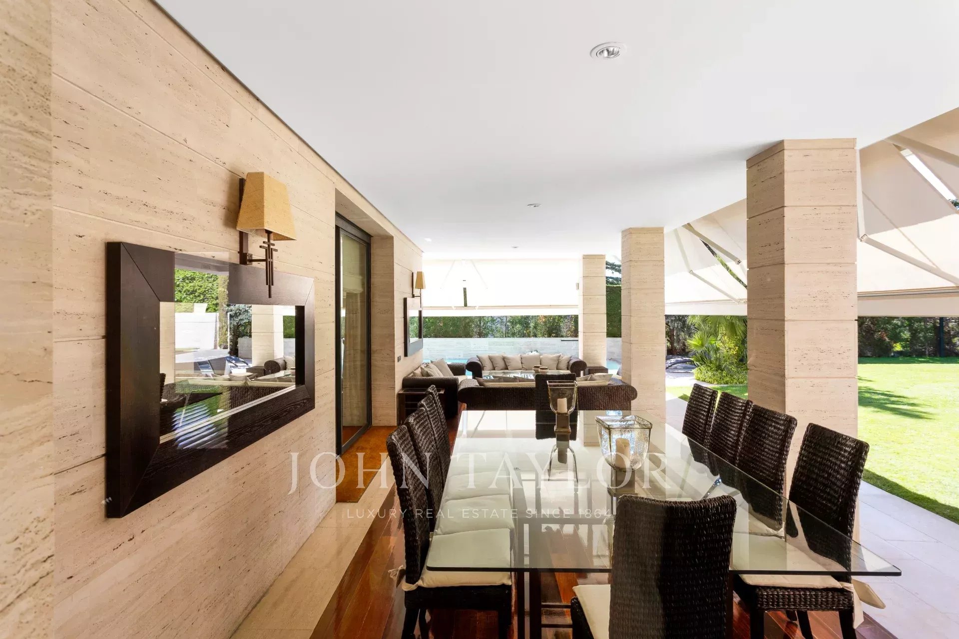 Toldos e estores eléctricos, vidros de segurança, chão em madeira maciça com acabamento em IPE.