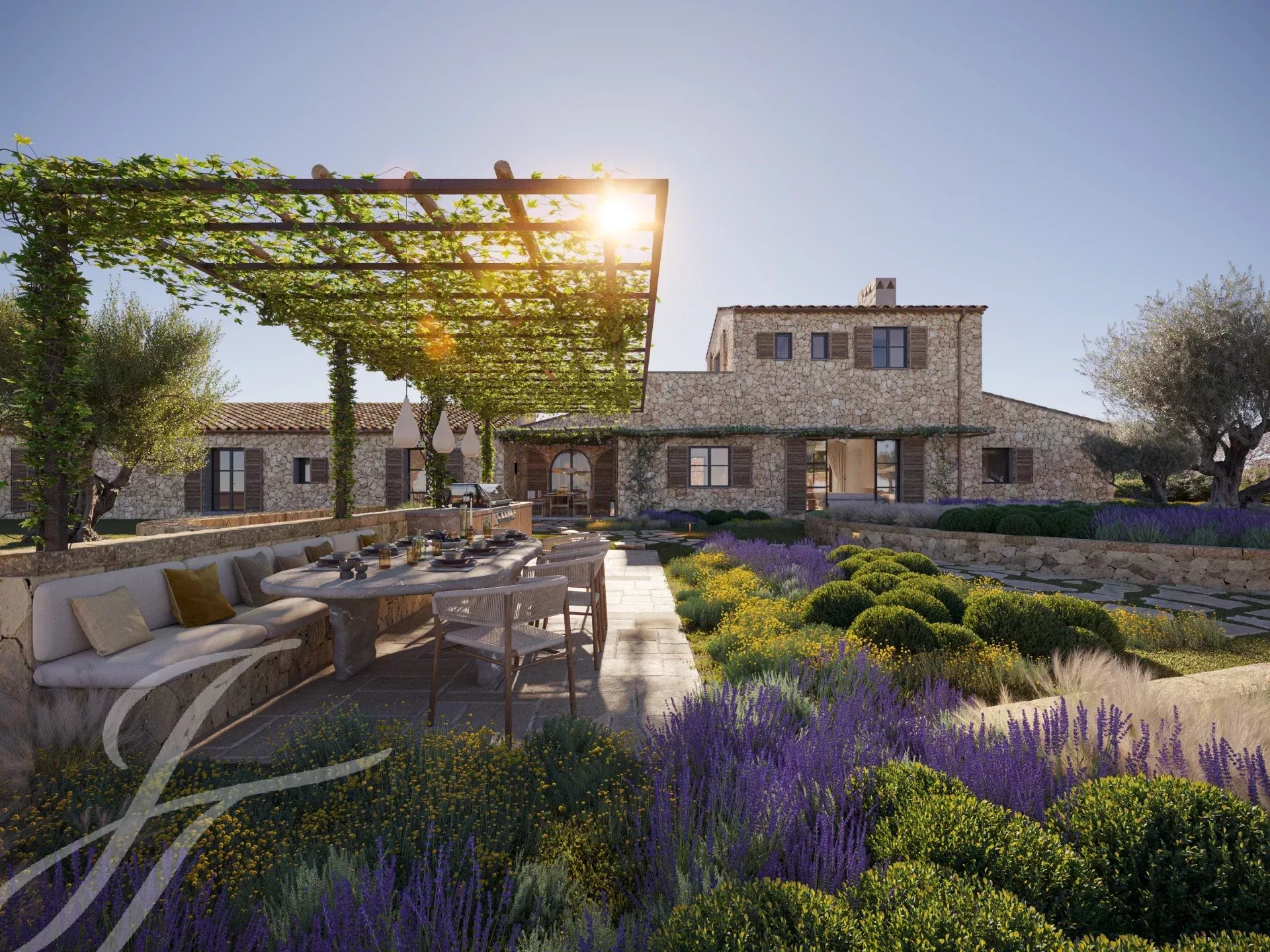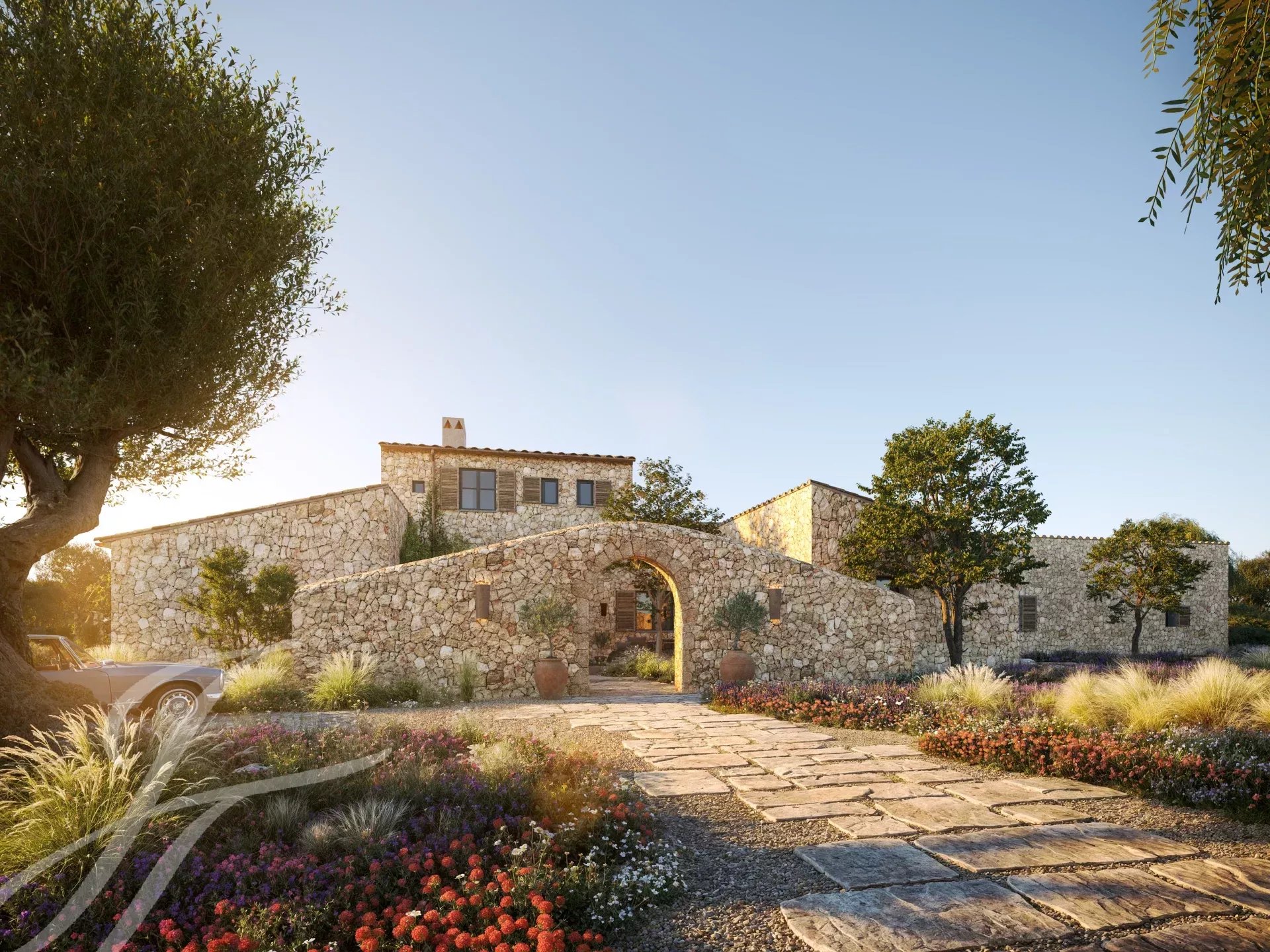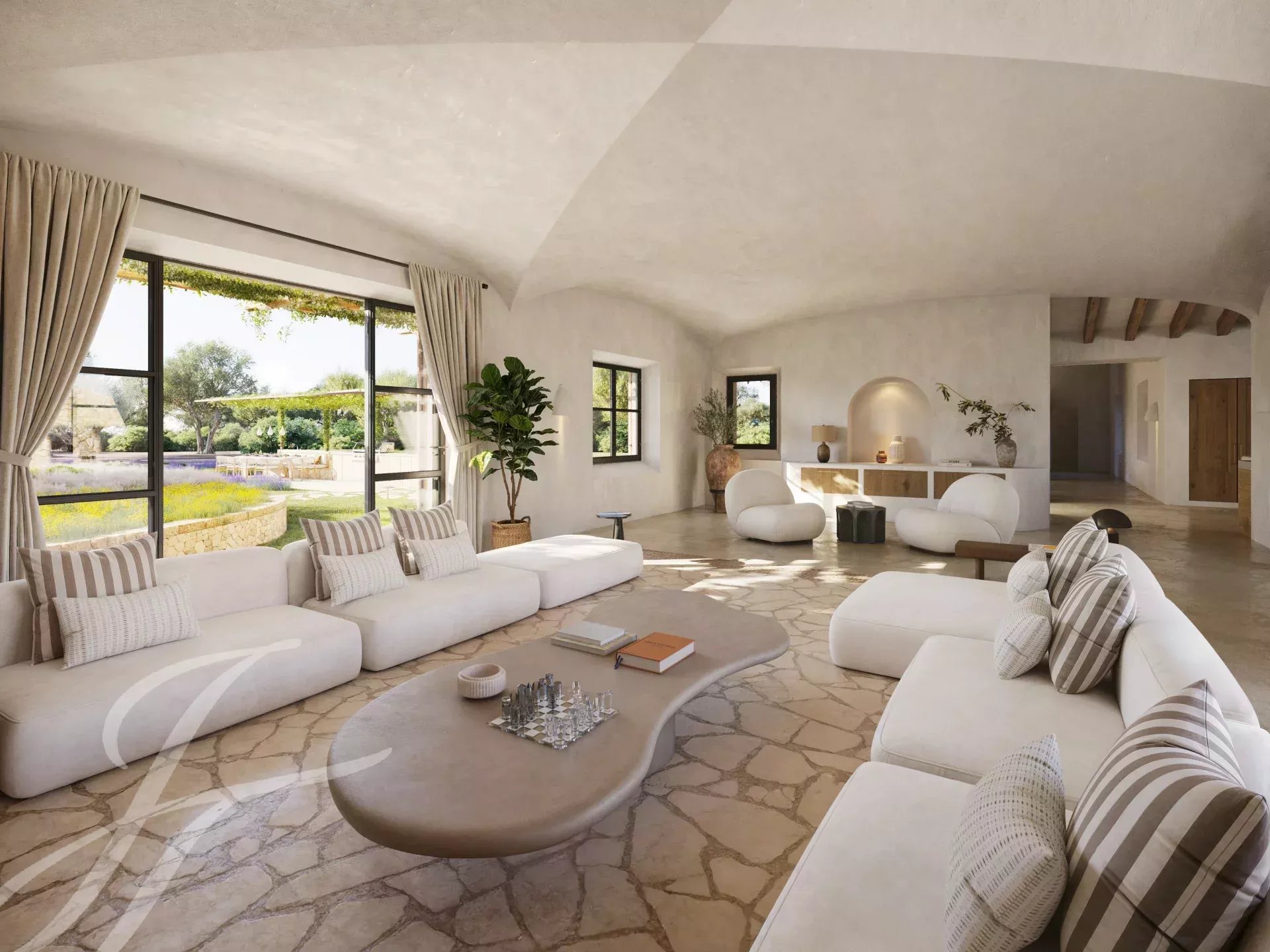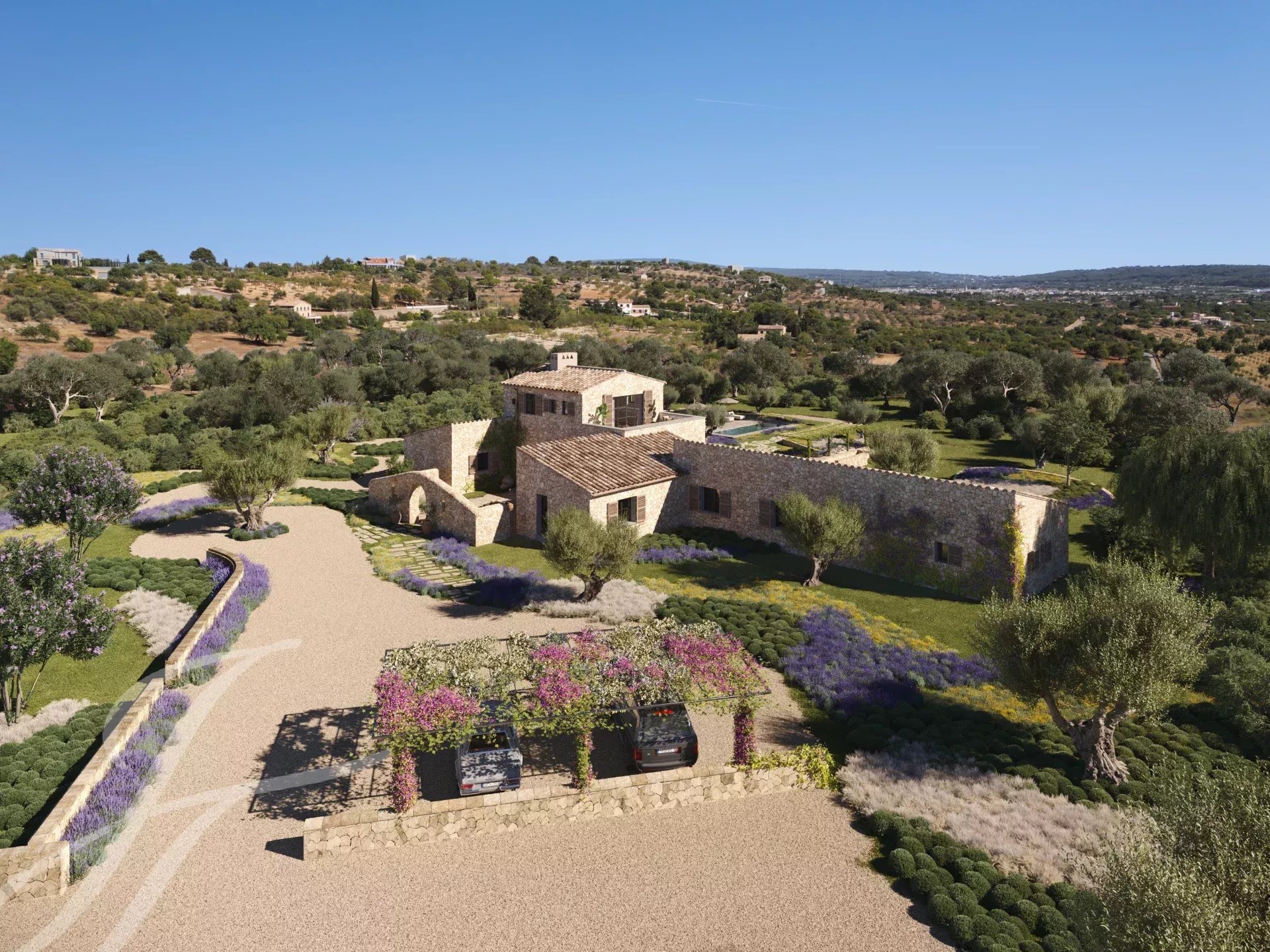 Casa Valle de los Almendros - Esta bela casa de campo boho-chic está atualmente em construção, com conclusão prevista para o 4º trimestre de 2027. Localizada num dos locais mais desejados do país, perto da cidade e do aeroporto, garante um acesso fácil e confortável à propriedade. O pátio de entrada da propriedade, a fachada em pedra, as portadas de madeira, os tectos altos com vigas de madeira e também os tectos abobadados, juntamente com o pavimento em pedra, as janelas do chão ao teto e a paisagem mediterrânica criam uma energia fantástica e um fluxo natural em toda a casa.