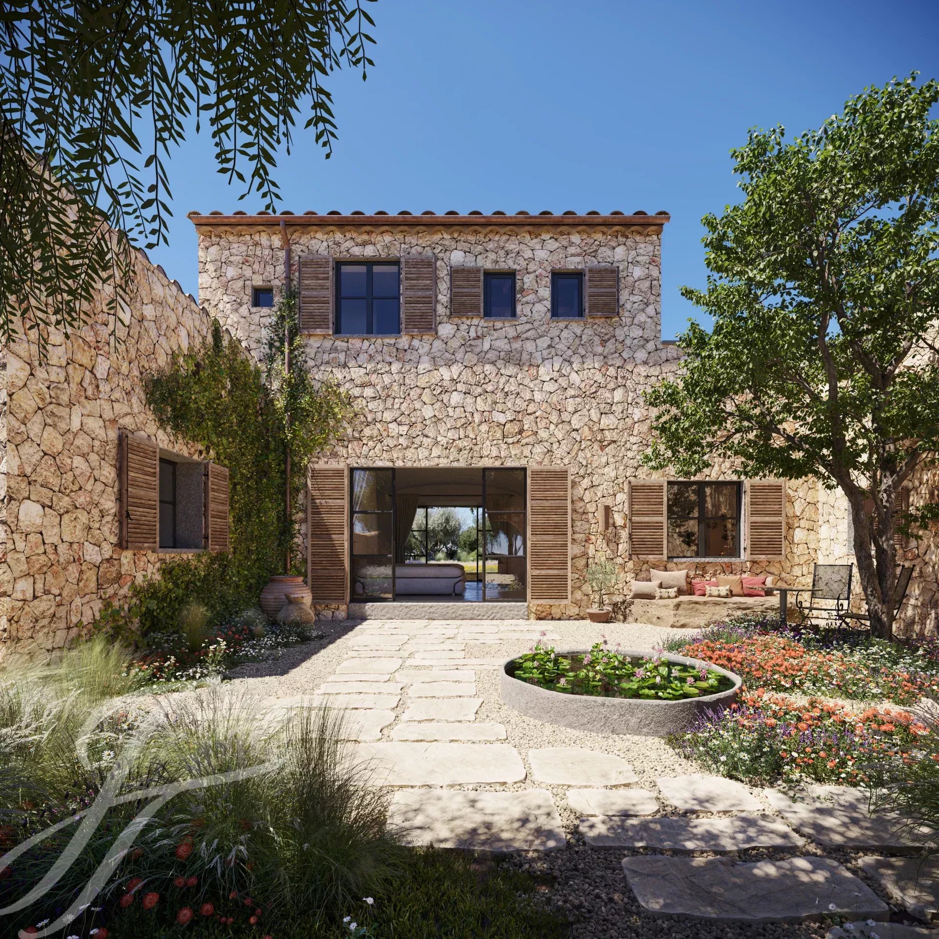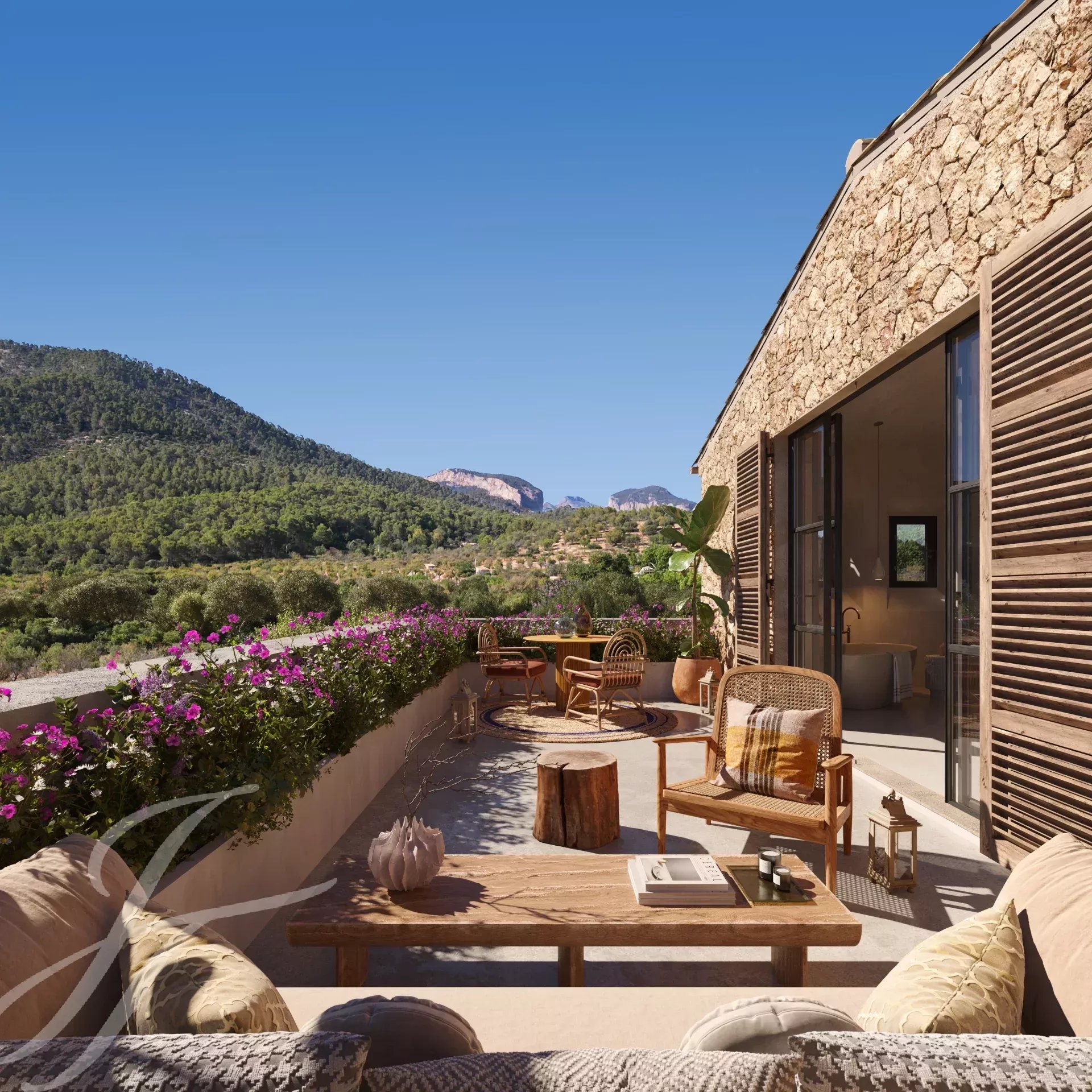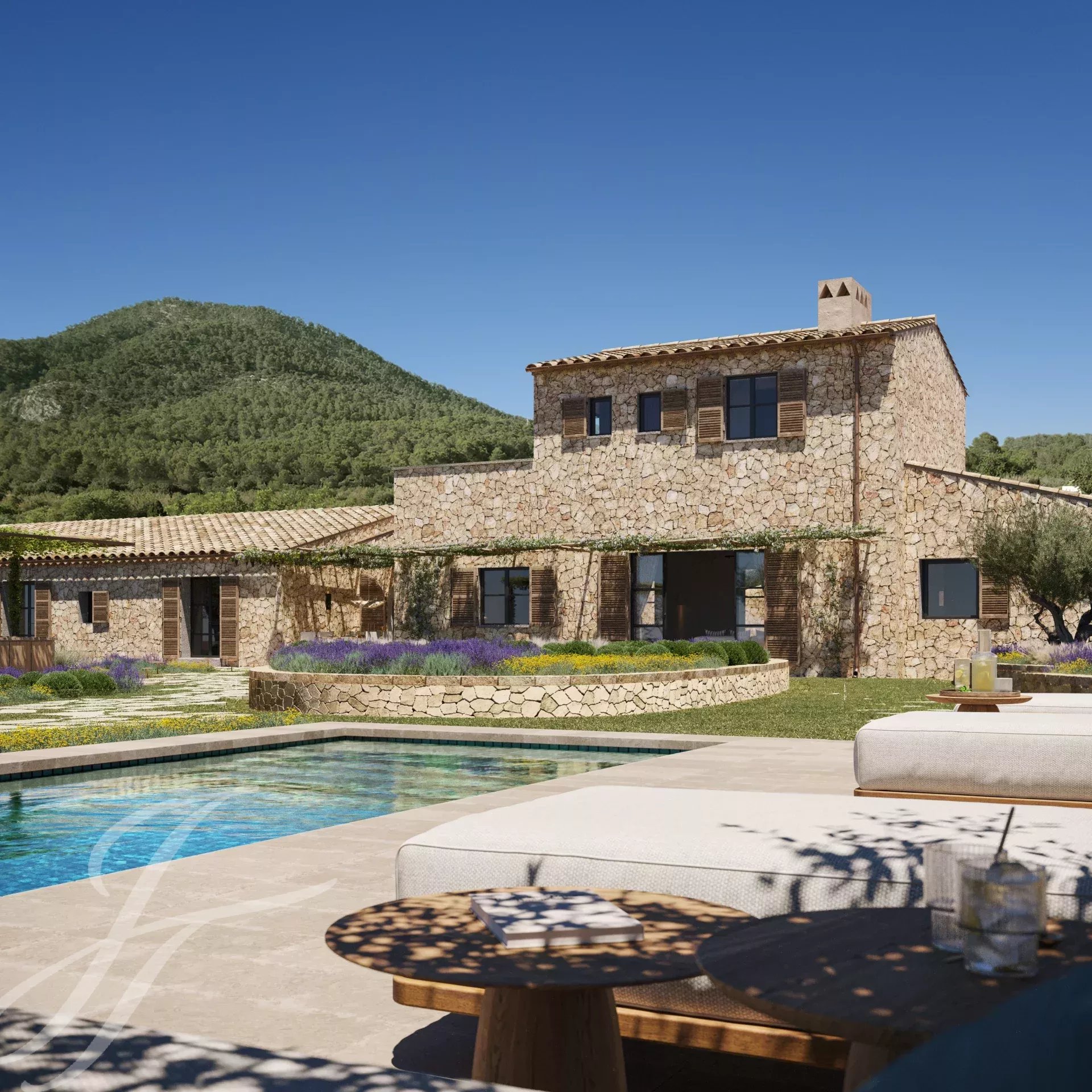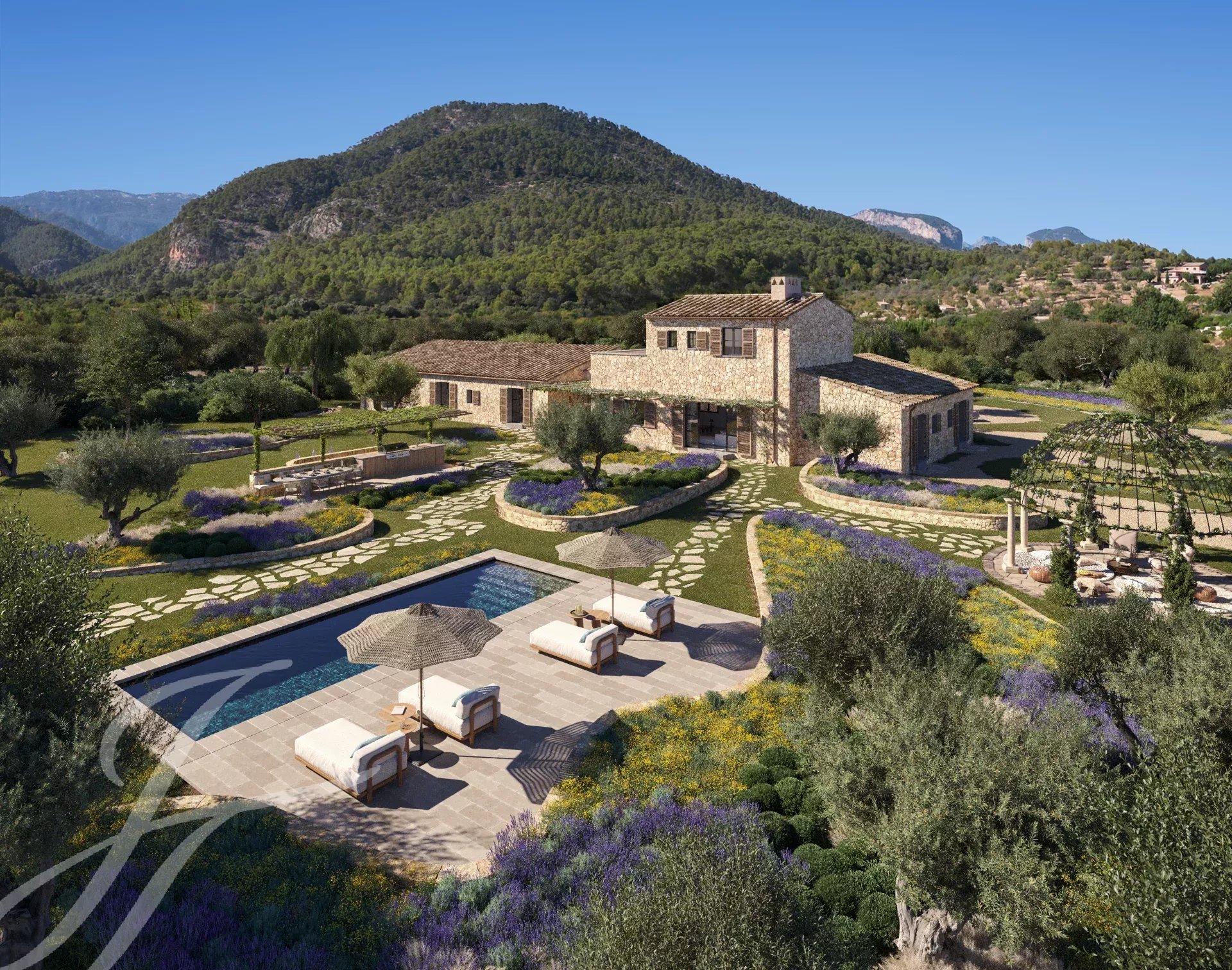 Casa Valle de los Almendros - Esta bela casa de campo boho-chic está atualmente em construção, com conclusão prevista para o 4º trimestre de 2027. Localizada num dos locais mais desejados do país, perto da cidade e do aeroporto, garante um acesso fácil e confortável à propriedade. O pátio de entrada da propriedade, a fachada em pedra, as portadas de madeira, os tectos altos com vigas de madeira e também os tectos abobadados, juntamente com o pavimento em pedra, as janelas do chão ao teto e a paisagem mediterrânica criam uma energia fantástica e um fluxo natural em toda a casa.