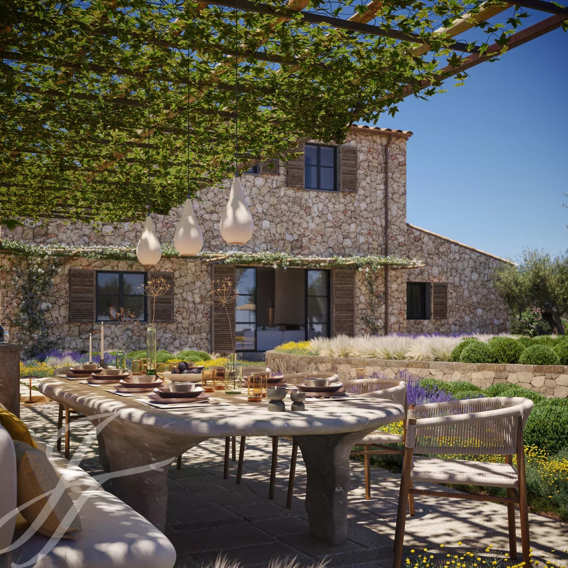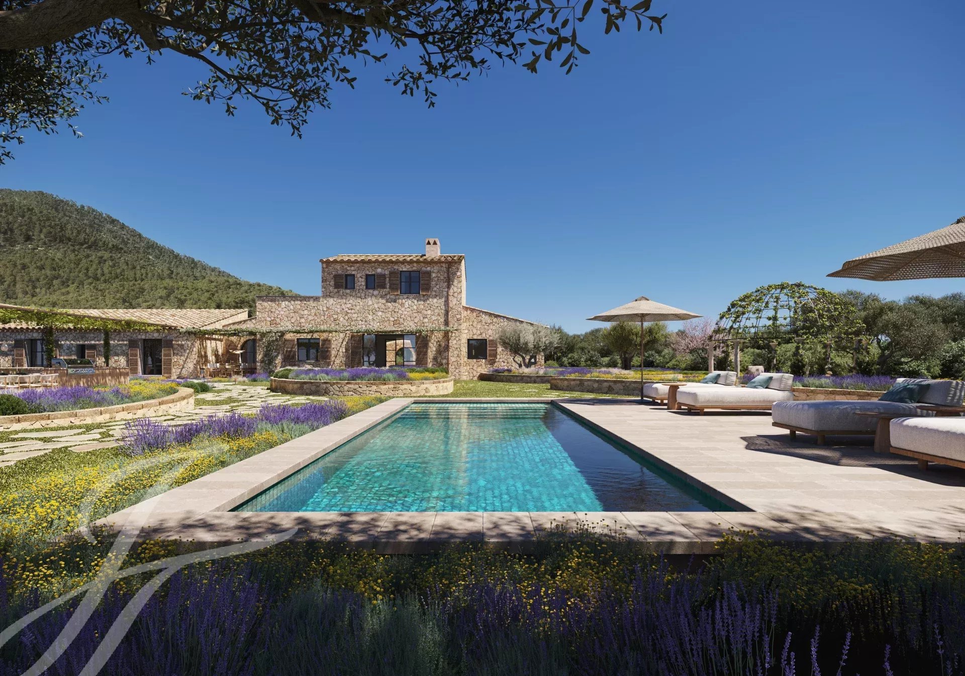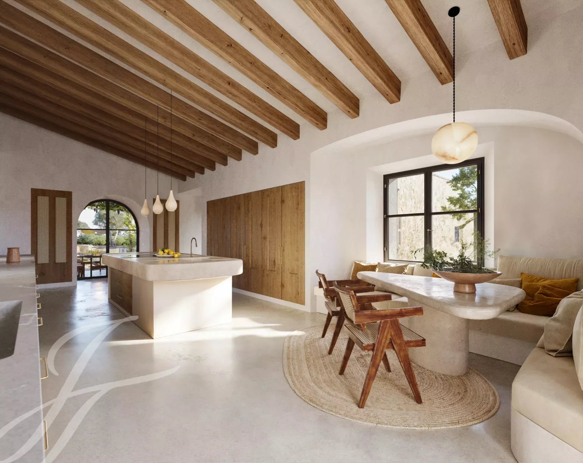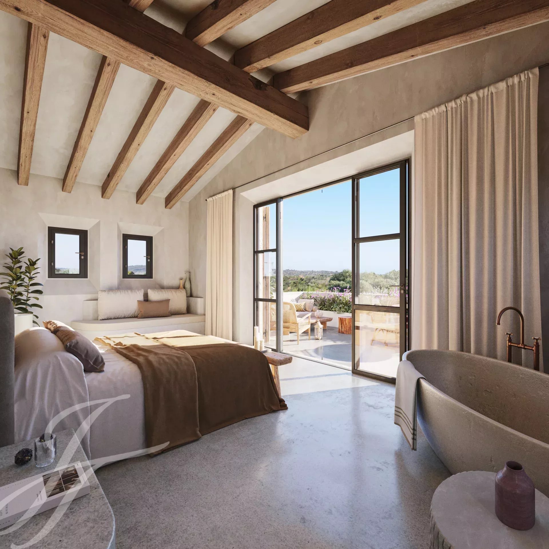 Casa Valle de los Almendros - Esta bela casa de campo boho-chic está atualmente em construção, com conclusão prevista para o 4º trimestre de 2027. Localizada num dos locais mais desejados do país, perto da cidade e do aeroporto, garante um acesso fácil e confortável à propriedade. O pátio de entrada da propriedade, a fachada em pedra, as portadas de madeira, os tectos altos com vigas de madeira e também os tectos abobadados, juntamente com o pavimento em pedra, as janelas do chão ao teto e a paisagem mediterrânica criam uma energia fantástica e um fluxo natural em toda a casa.