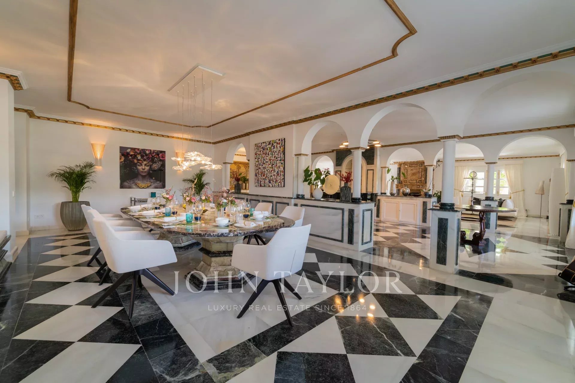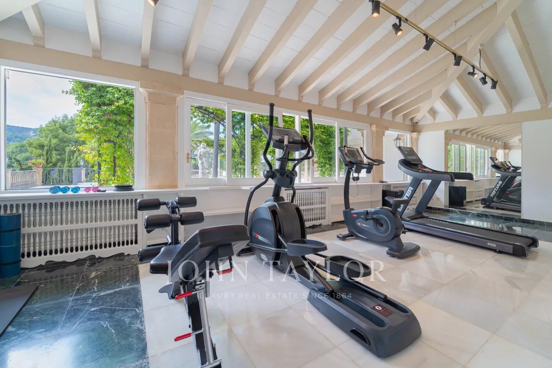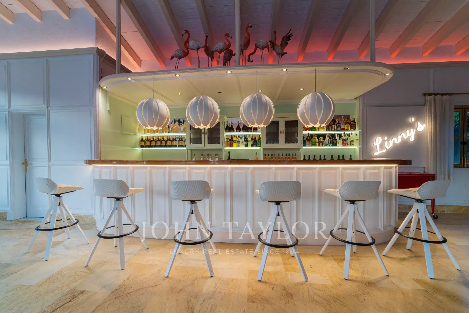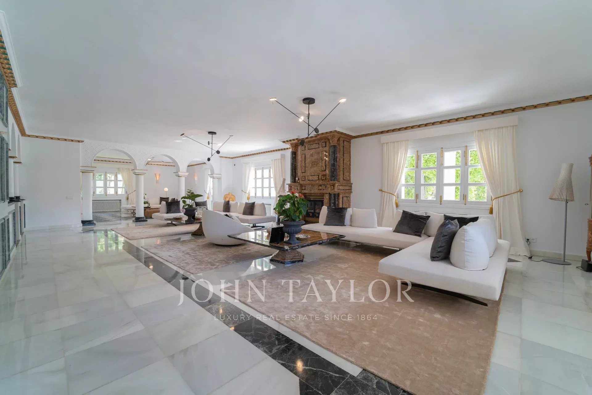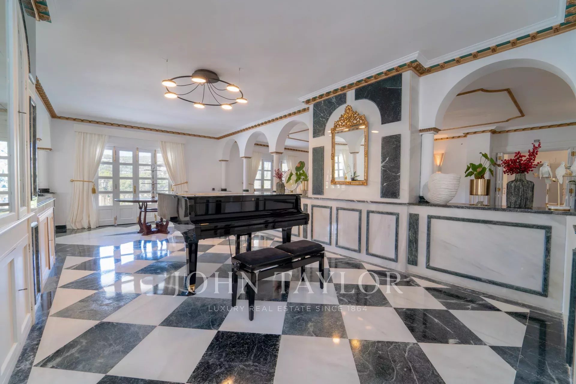 Entrada impressionante: Acesso através de um grande portão de aço forjado e de um longo caminho de acesso ladeado por 11 palmeiras imponentes. Espaços de entretenimento e bem-estar. Na entrada, encontrará uma área desportiva e de fitness com um ginásio, uma pequena cozinha, uma casa de banho e um quarto de hóspedes, ideal para sessões de ioga ou massagens. A casa de churrasco, com o exclusivo bar "Linny's", oferece um grelhador a lenha aberto, uma placa de cozedura wok e um grande forno de pedra para pizzas - perfeito para acolher reuniões. Adjacente à villa, o Park di Sabine encanta com o seu perfumado laranjal de jasmim e um lago sereno. O terraço é o local perfeito para desfrutar de uma experiência deslumbrante ao pôr do sol.