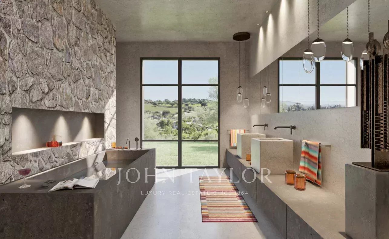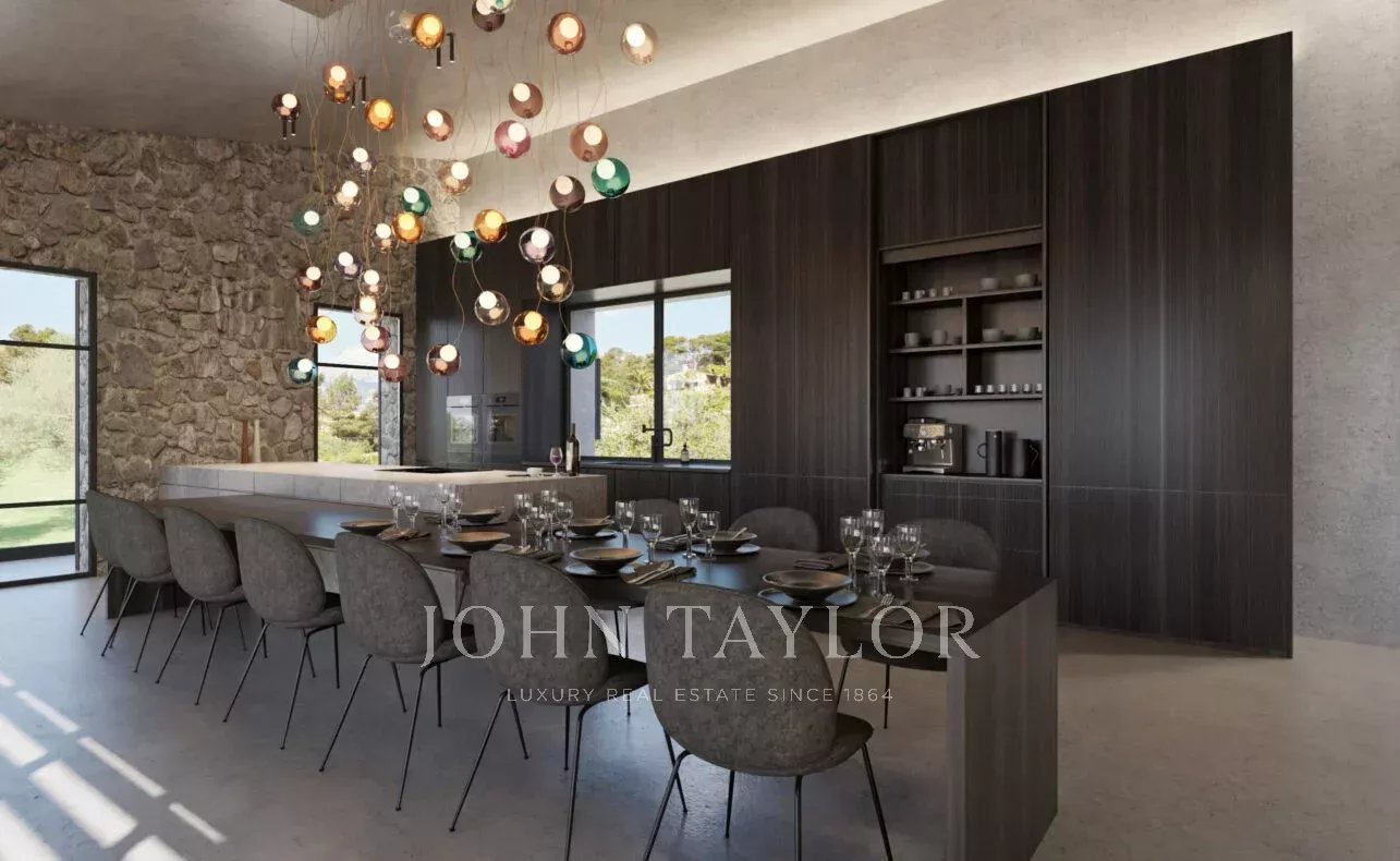 Desde o primeiro passo no elegante hall de entrada, revela-se um design arquitetónico que integra perfeitamente os espaços interiores e exteriores. O conceito aberto liga a sala de estar principal, a cozinha e a sala de jantar a vários terraços cobertos, ideais para refeições ao ar livre, juntamente com uma cozinha exterior totalmente equipada. O exterior alberga ainda uma grande piscina, um verdadeiro paraíso de paz enquadrado por vistas panorâmicas sobre a paisagem envolvente.