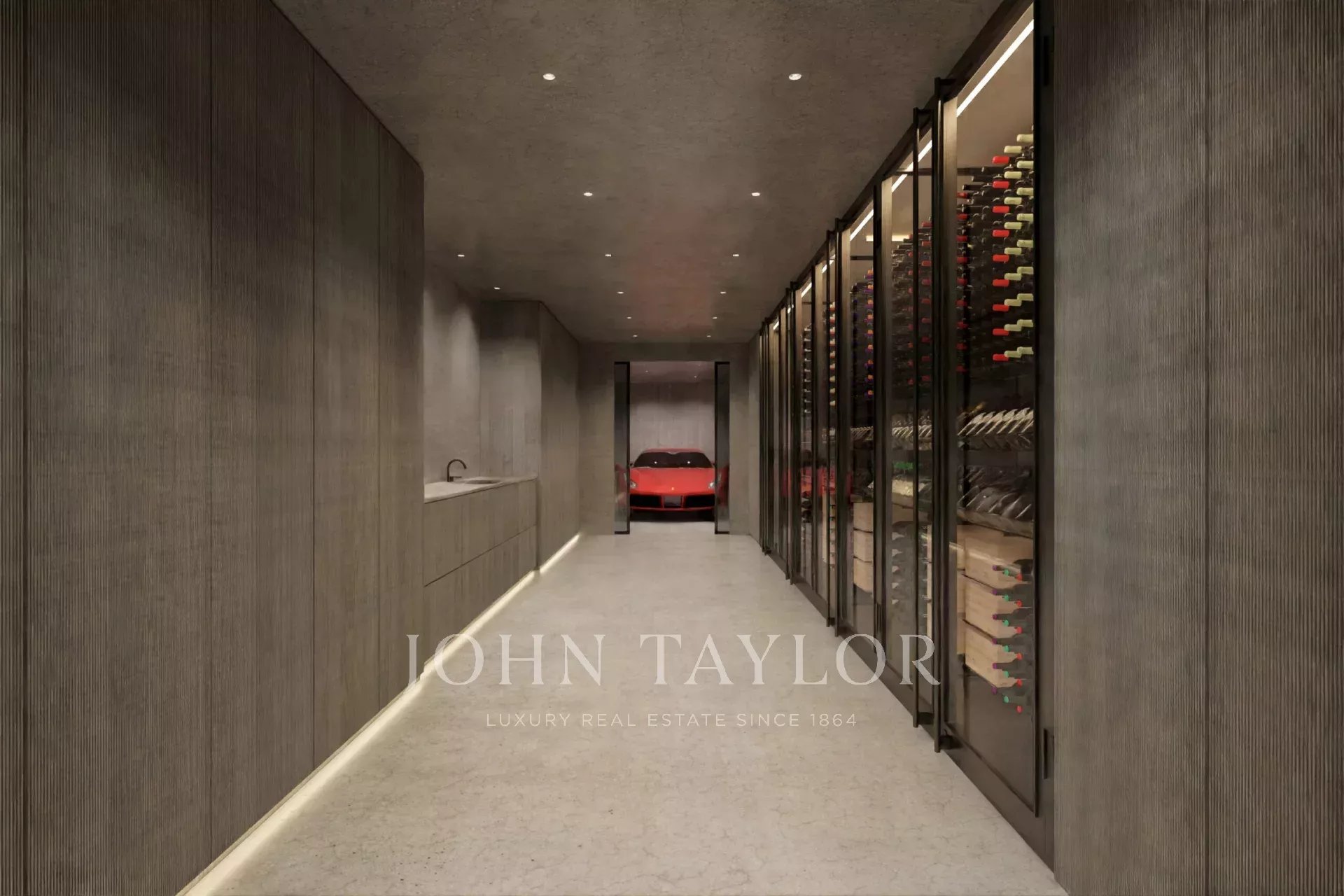 A cave, com cerca de 320 m², inclui uma garagem para três carros, uma despensa e uma adega. Este amplo espaço pode ser adaptado a diferentes necessidades: desde uma área de bem-estar ou uma sala de cinema privada, até um sexto quarto com casa de banho privativa.