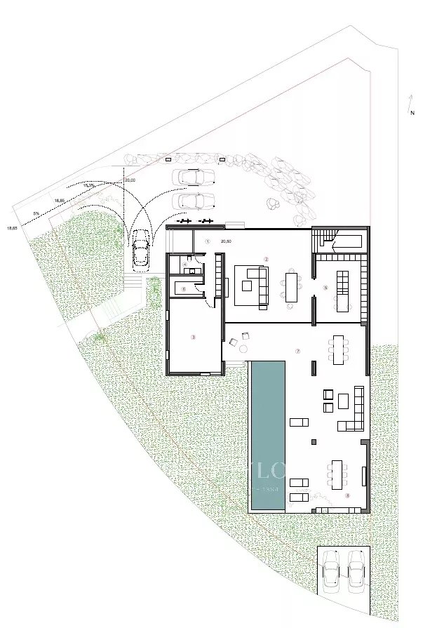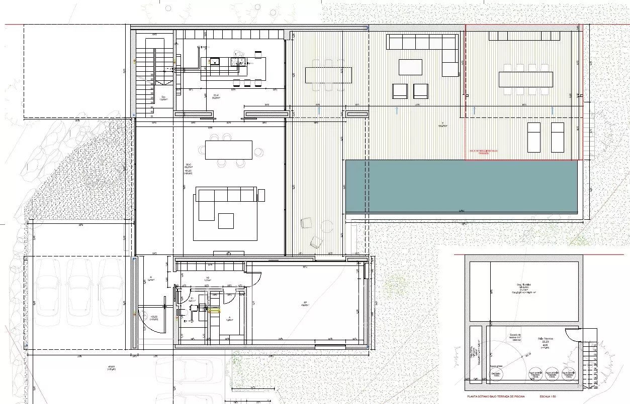 O projeto da moradia tem 2 pisos, o piso térreo tem uma cozinha com ilha central, uma espaçosa sala de jantar com grandes janelas que se abrem diretamente para o terraço e jardim. O rés do chão tem uma divisão extra que pode ser utilizada como escritório ou como um quarto adicional. A área do terraço tem um alpendre coberto junto a uma piscina de 15 metros de comprimento.